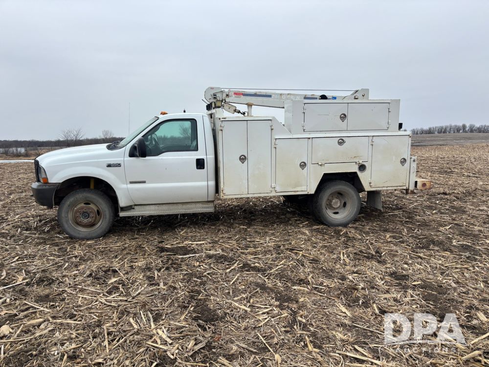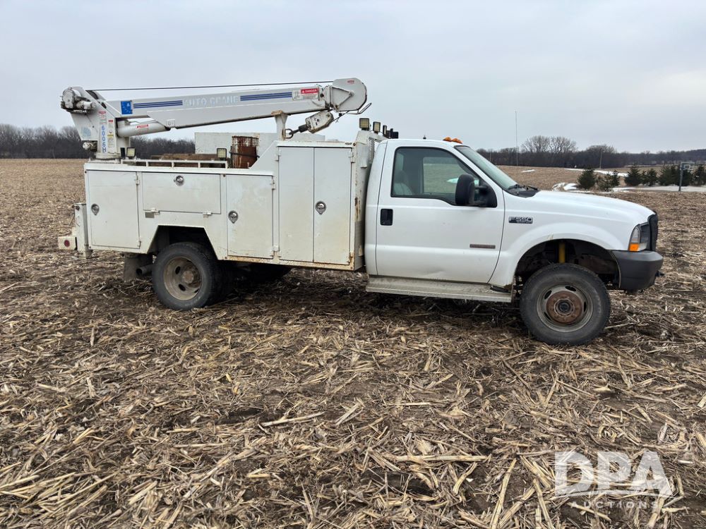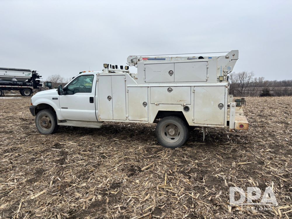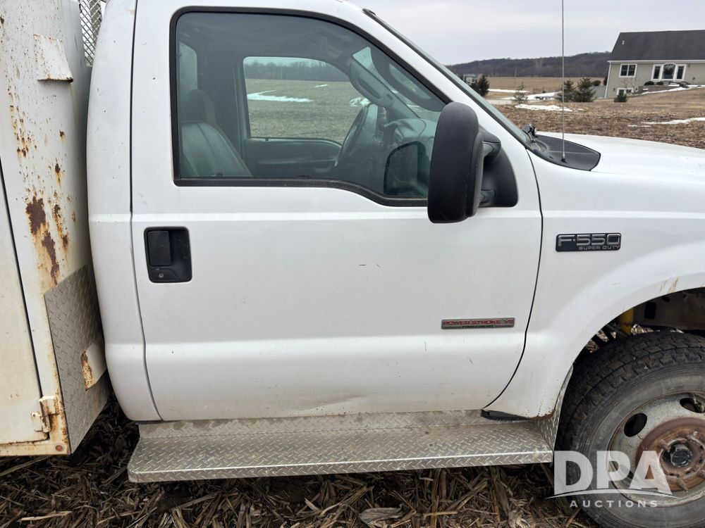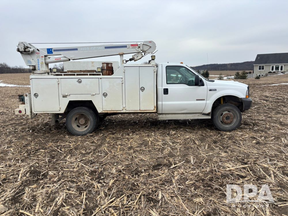 2004 Ford F-550 Super Duty 4x4 Service Truck (GP12710), regular cab, Power Stroke V8 turbo diesel engine, automatic transmission, heat, Am/Fm radio, cruise control, dually, 9 door service body, Auto Crane Model 6006H (6,000 pound capacity), hydraulic first stage extension, manual 2nd extension, hared wired remote, PTO driven H-35 air compressor, running boards, 245/70R19.5 tires, shows 210,137 miles.