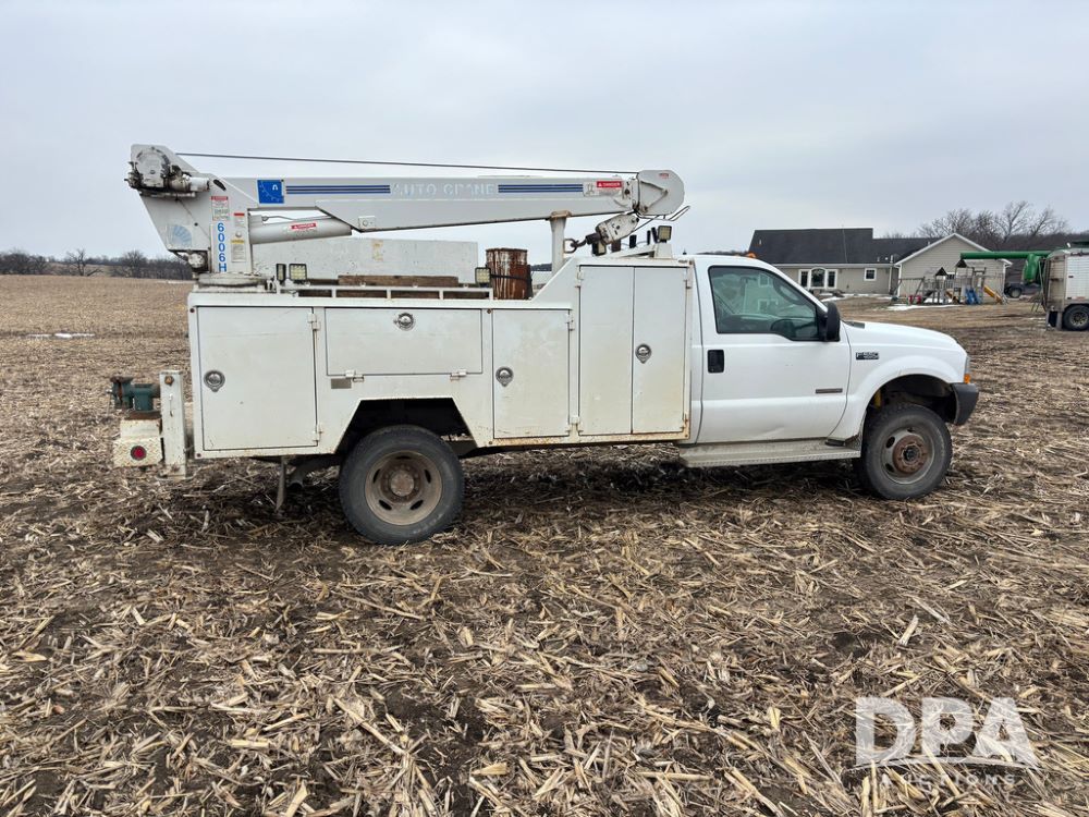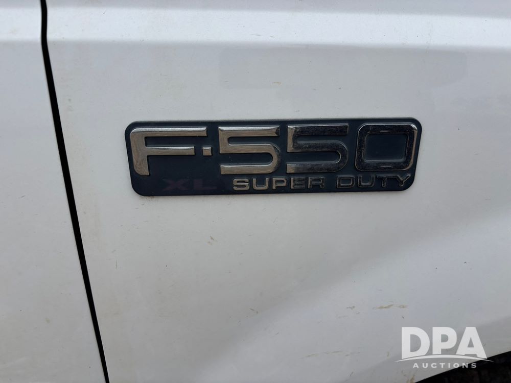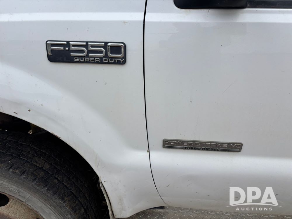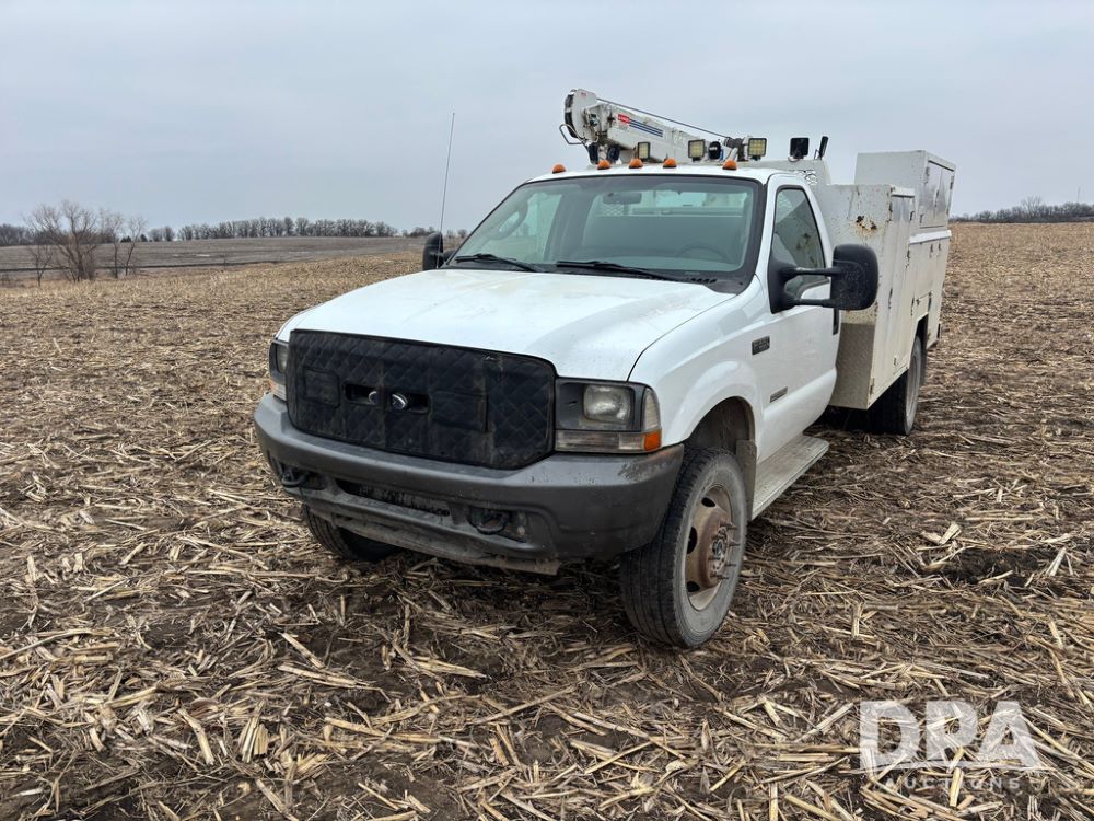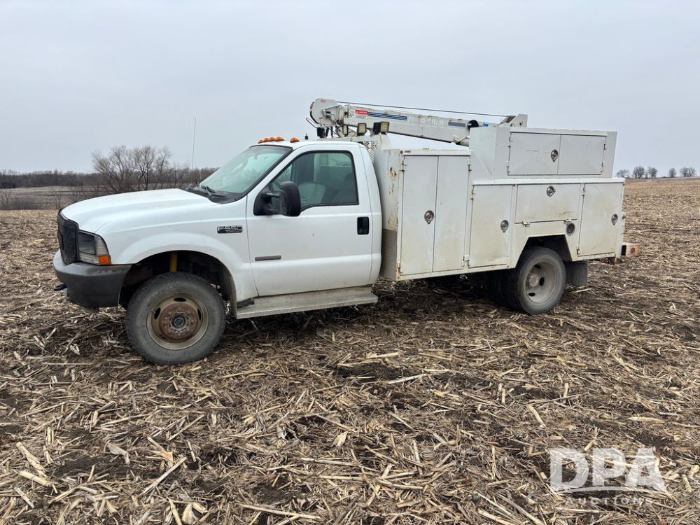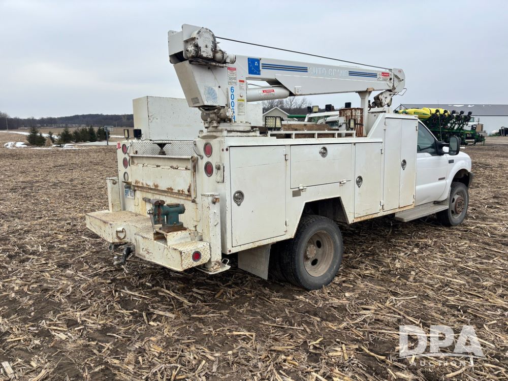 2004 Ford F-550 Super Duty 4x4 Service Truck (GP12710), regular cab, Power Stroke V8 turbo diesel engine, automatic transmission, heat, Am/Fm radio, cruise control, dually, 9 door service body, Auto Crane Model 6006H (6,000 pound capacity), hydraulic first stage extension, manual 2nd extension, hared wired remote, PTO driven H-35 air compressor, running boards, 245/70R19.5 tires, shows 210,137 miles.