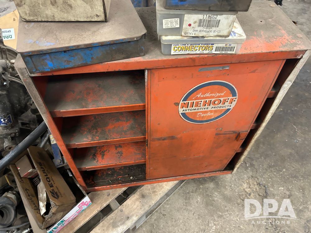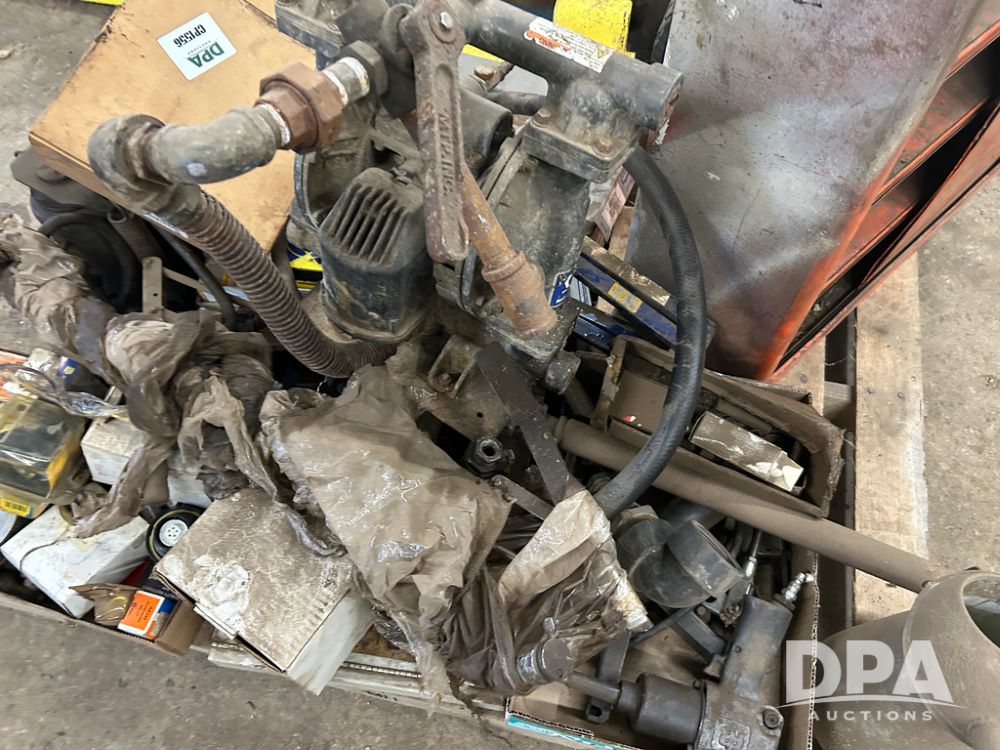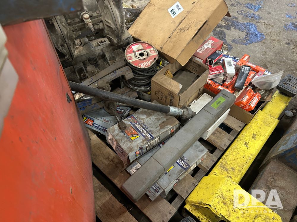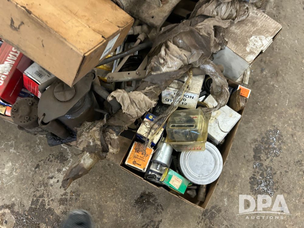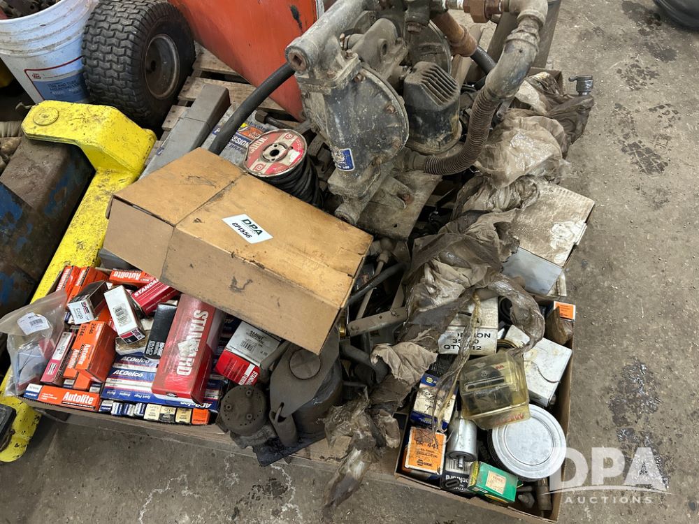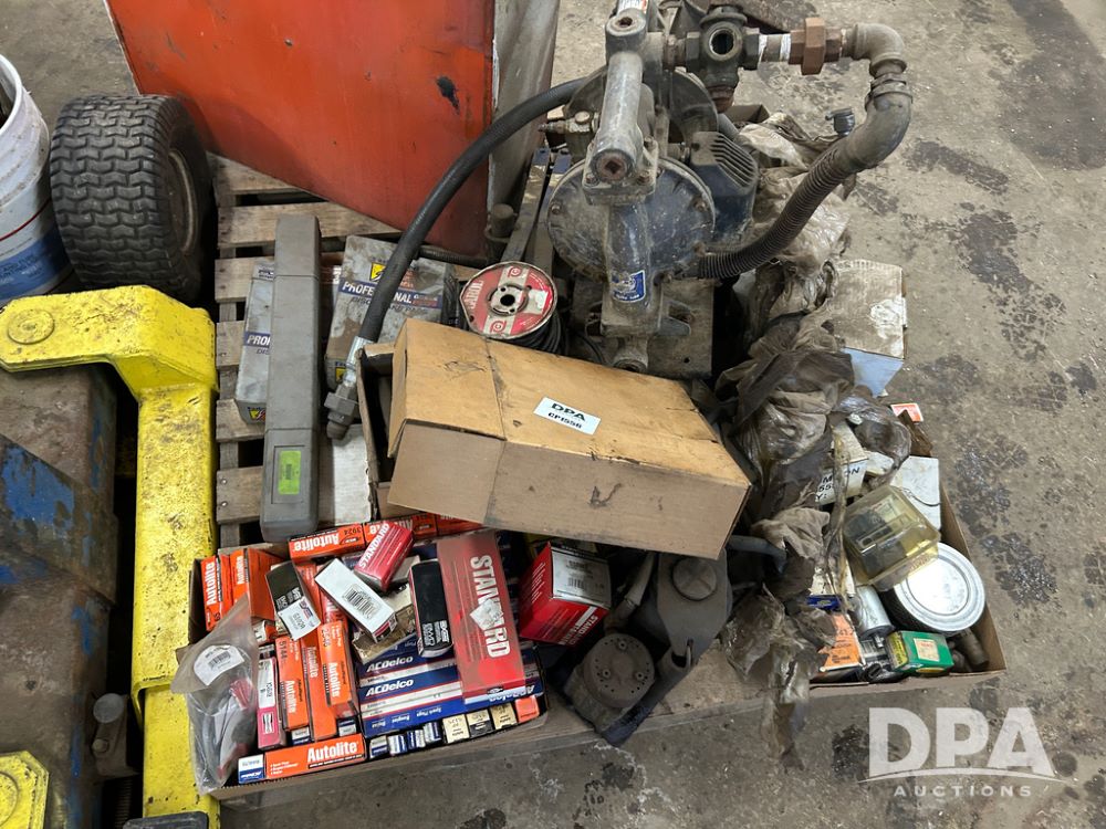 Automotive Parts (CP1556), pallet of automotive parts, spark plugs, fuel filters, assorted filters, piston pump, 1/2'' air impact, and parts cabinet.