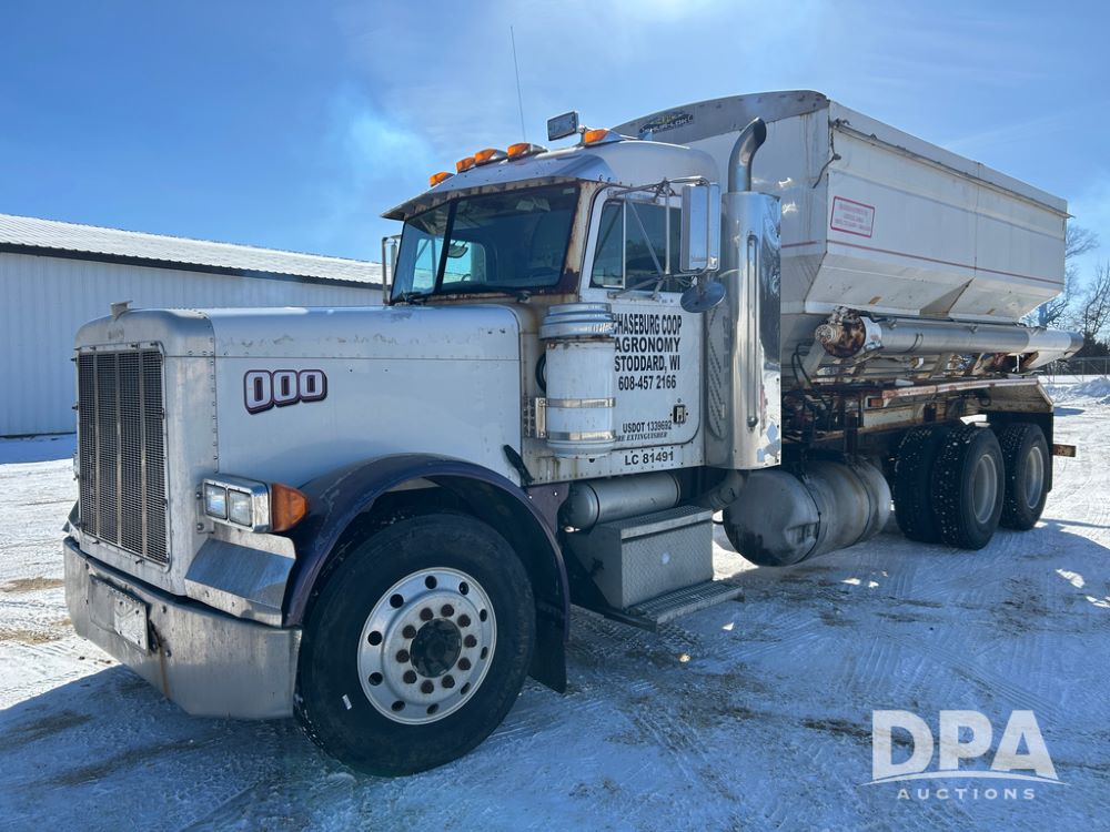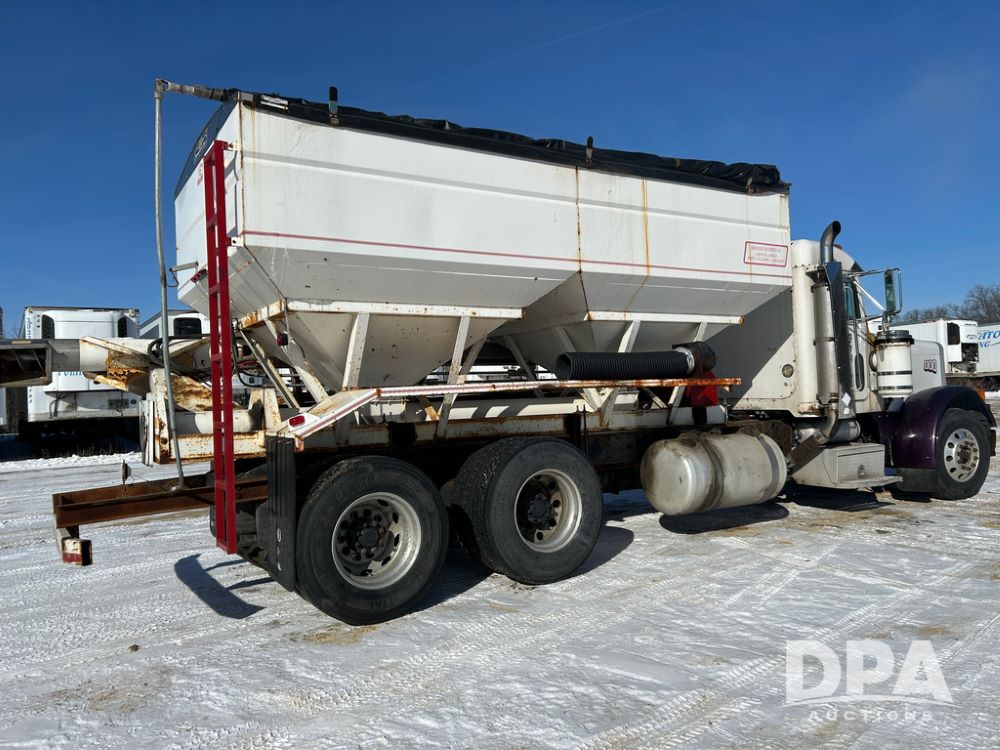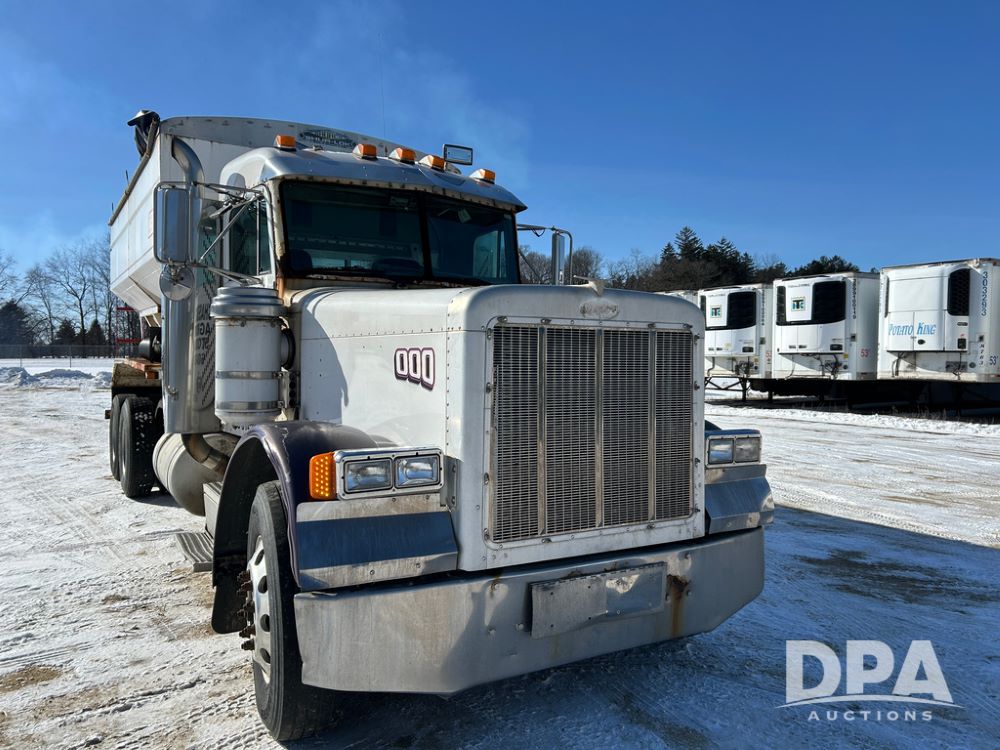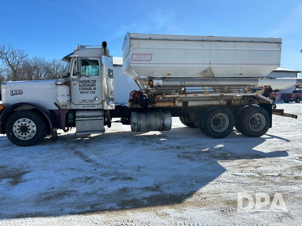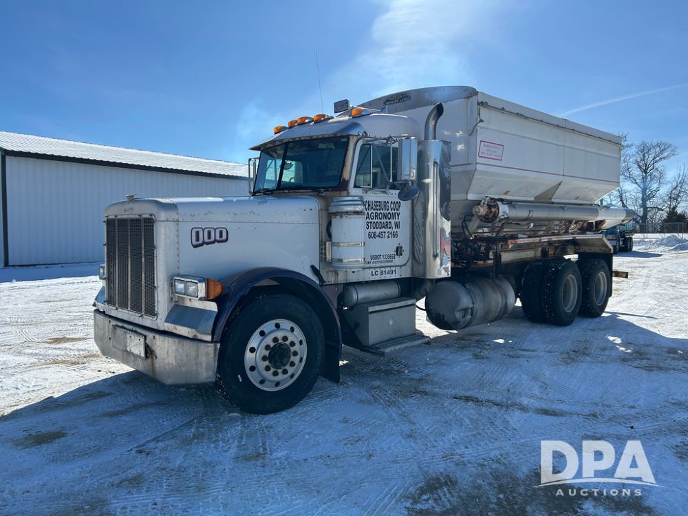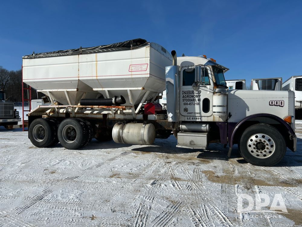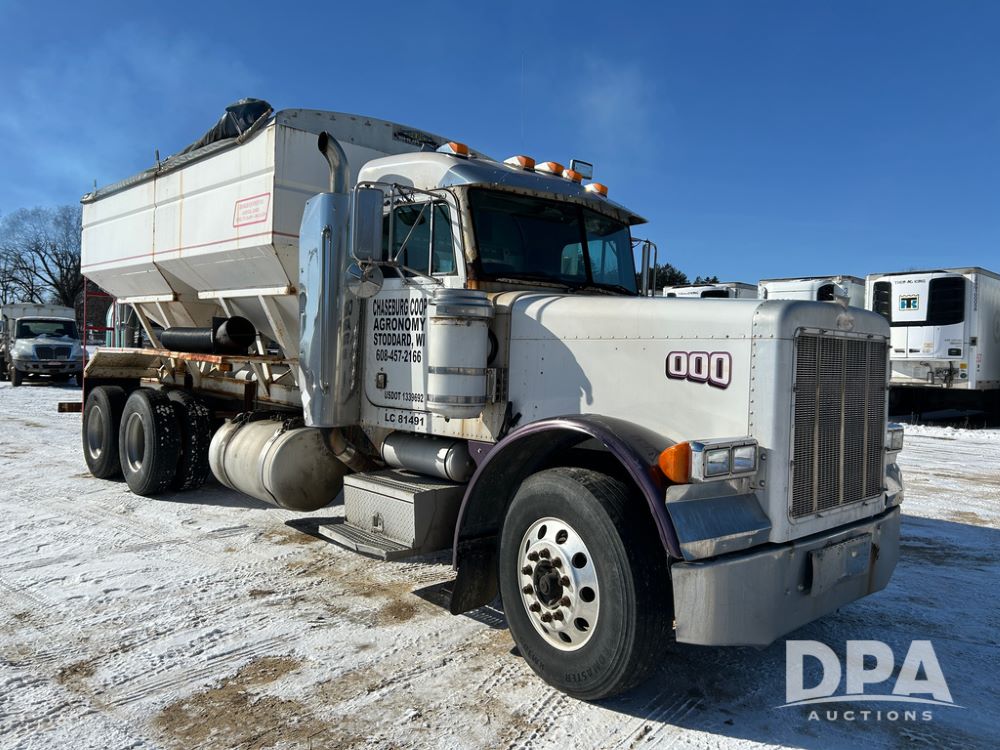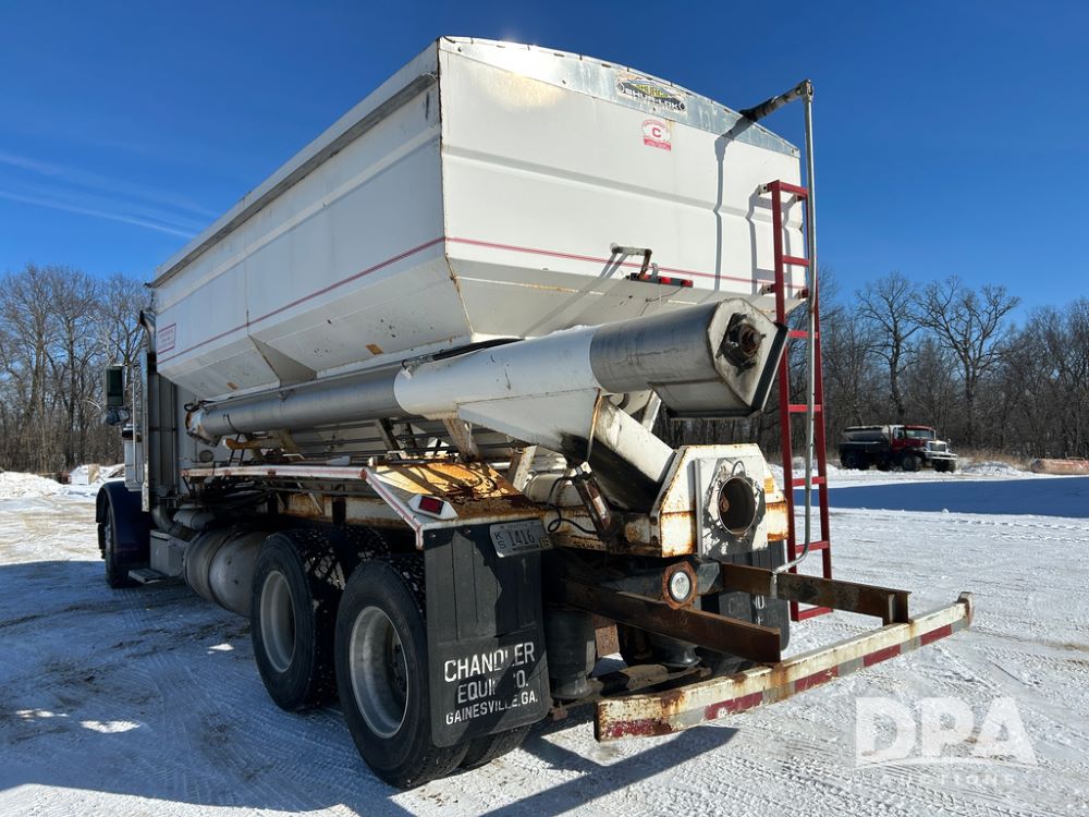 2000 Peterbilt Dry Truck (CP1593 Unit 7013), Cat diesel engine, 10 speed transmission, tandem axle full screw, air ride suspension, Chandler 16 ton stainless steel hydraulic dry tender box, side discharge auger, roll over tarp, engine brake, air dump valve, cruise control, dual aluminum fuel tanks, 22.5 tires, aluminum wheels.