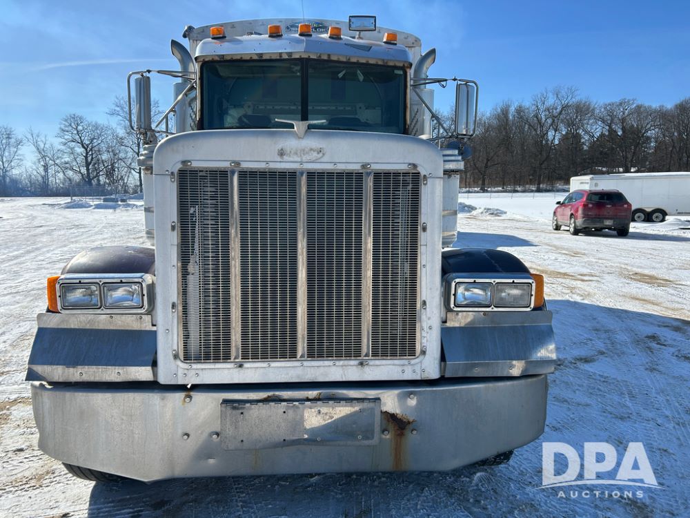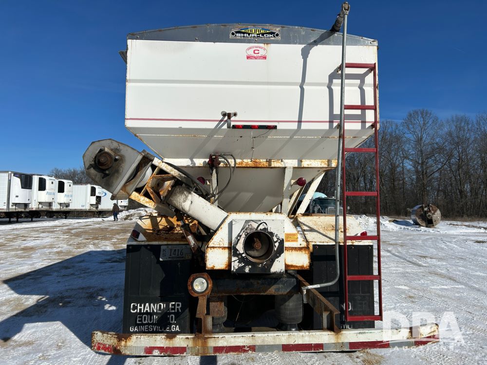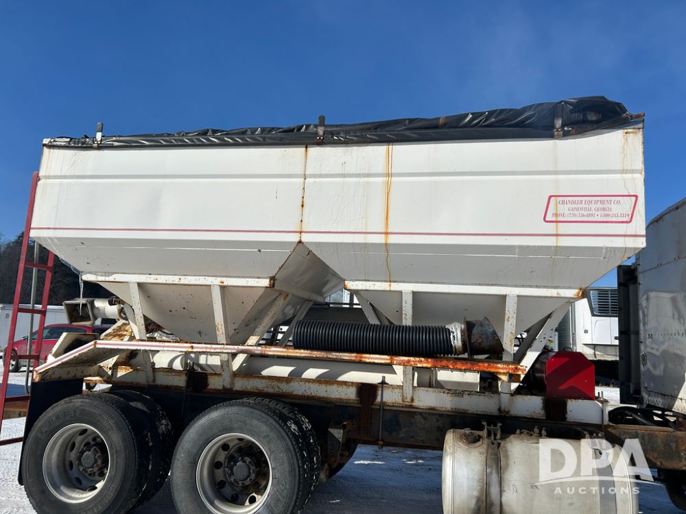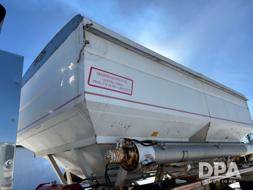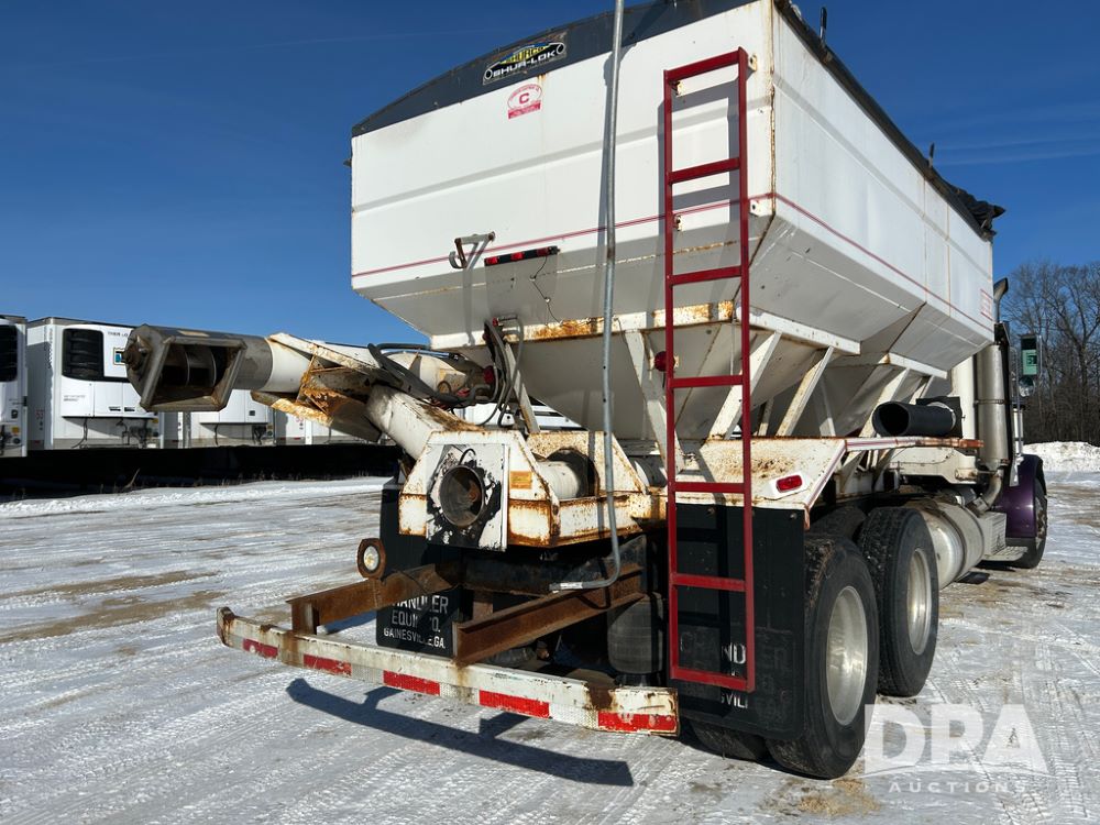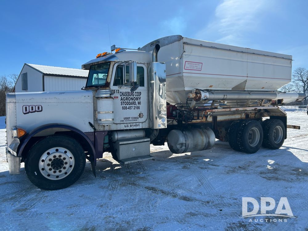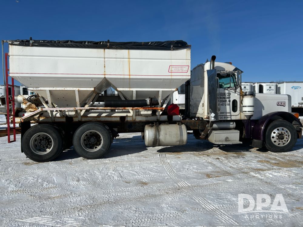 2000 Peterbilt Dry Truck (CP1593 Unit 7013), Cat diesel engine, 10 speed transmission, tandem axle full screw, air ride suspension, Chandler 16 ton stainless steel hydraulic dry tender box, side discharge auger, roll over tarp, engine brake, air dump valve, cruise control, dual aluminum fuel tanks, 22.5 tires, aluminum wheels.