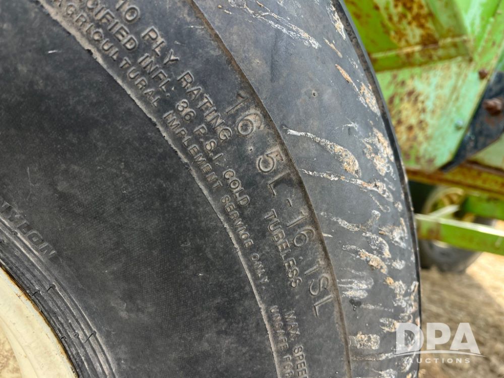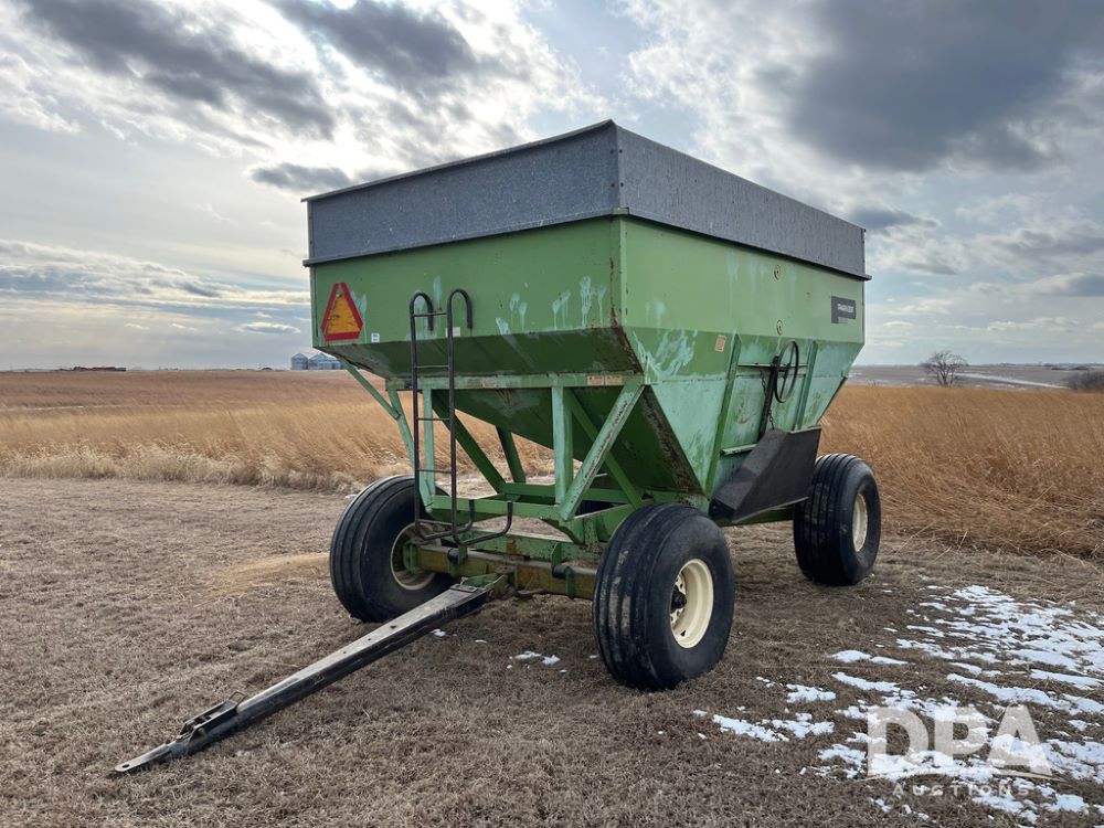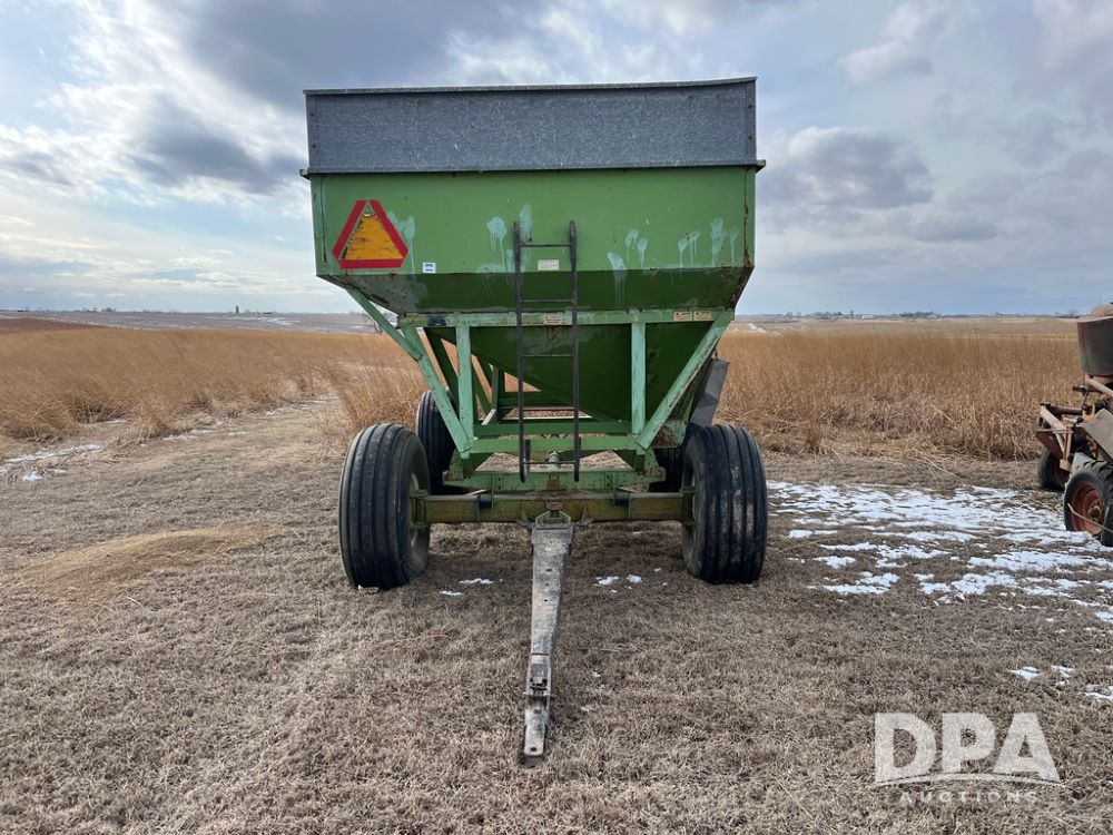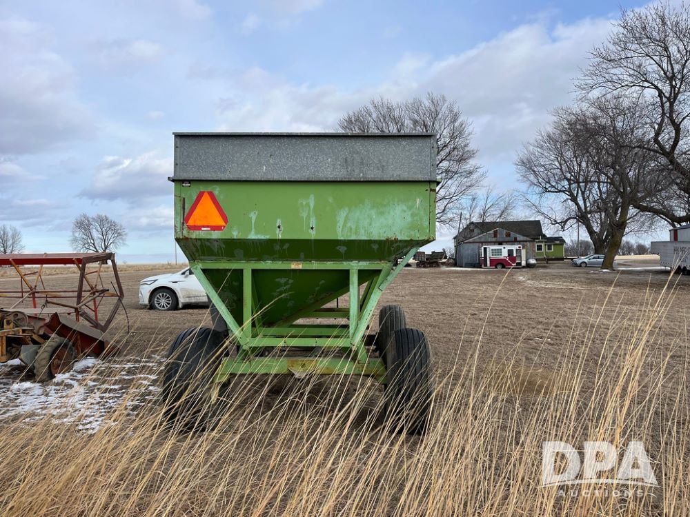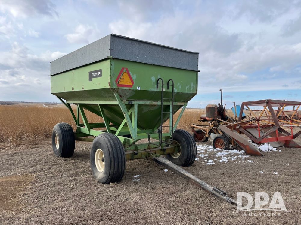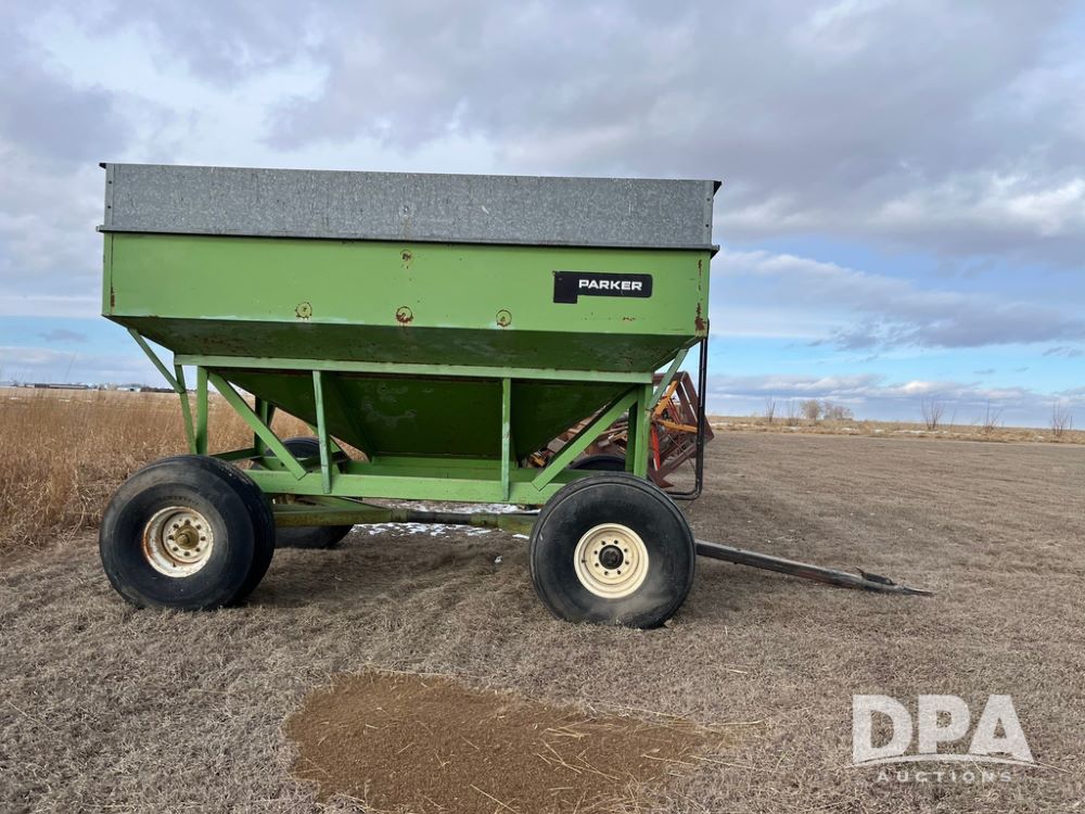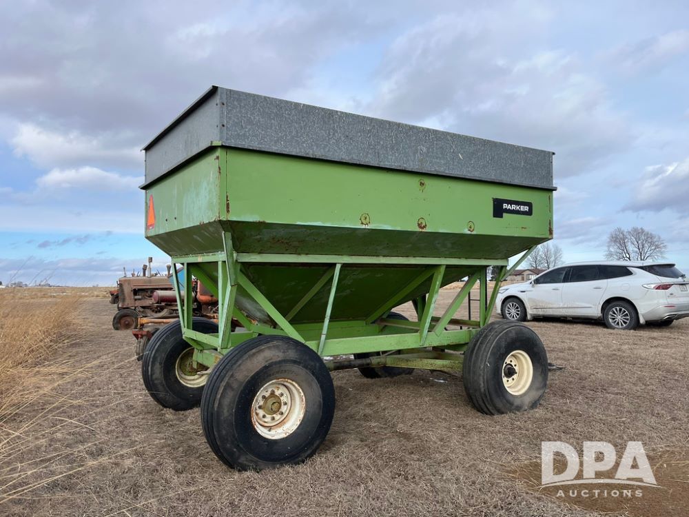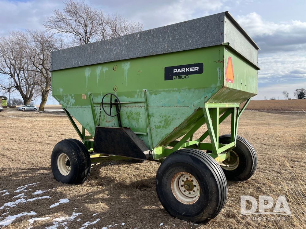 Parker 2600 Gravity Wagon (JN3728), around 300+ bushel capacity, 16.5L-16.1SL tires.10-12 ton running gear, 60 inch unloading door.