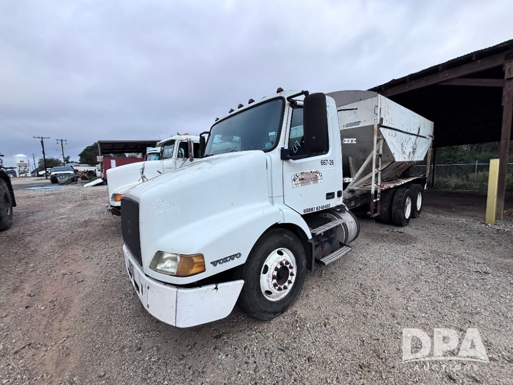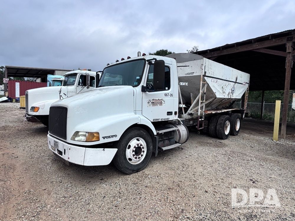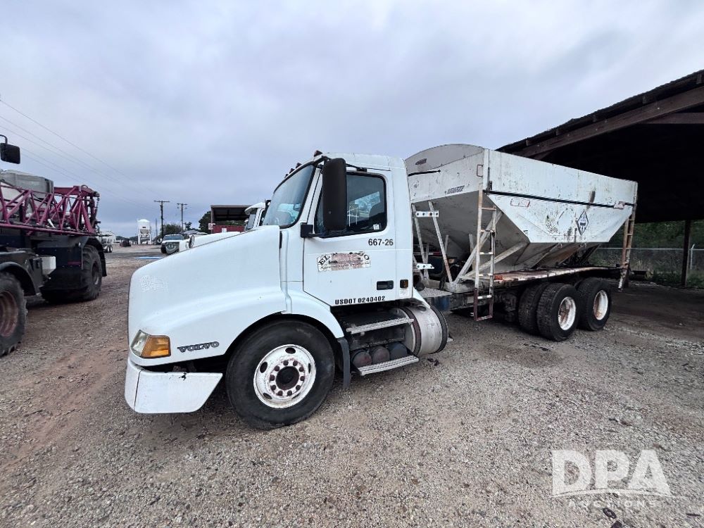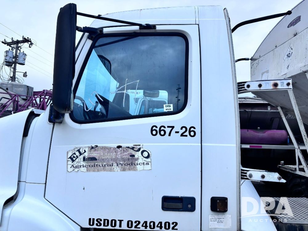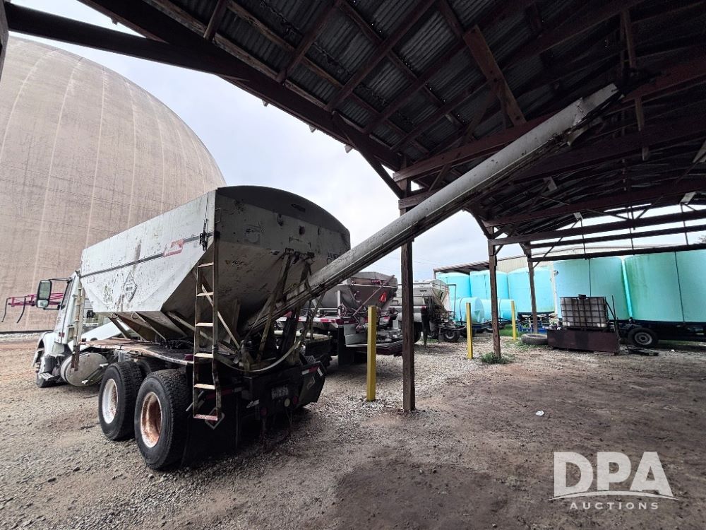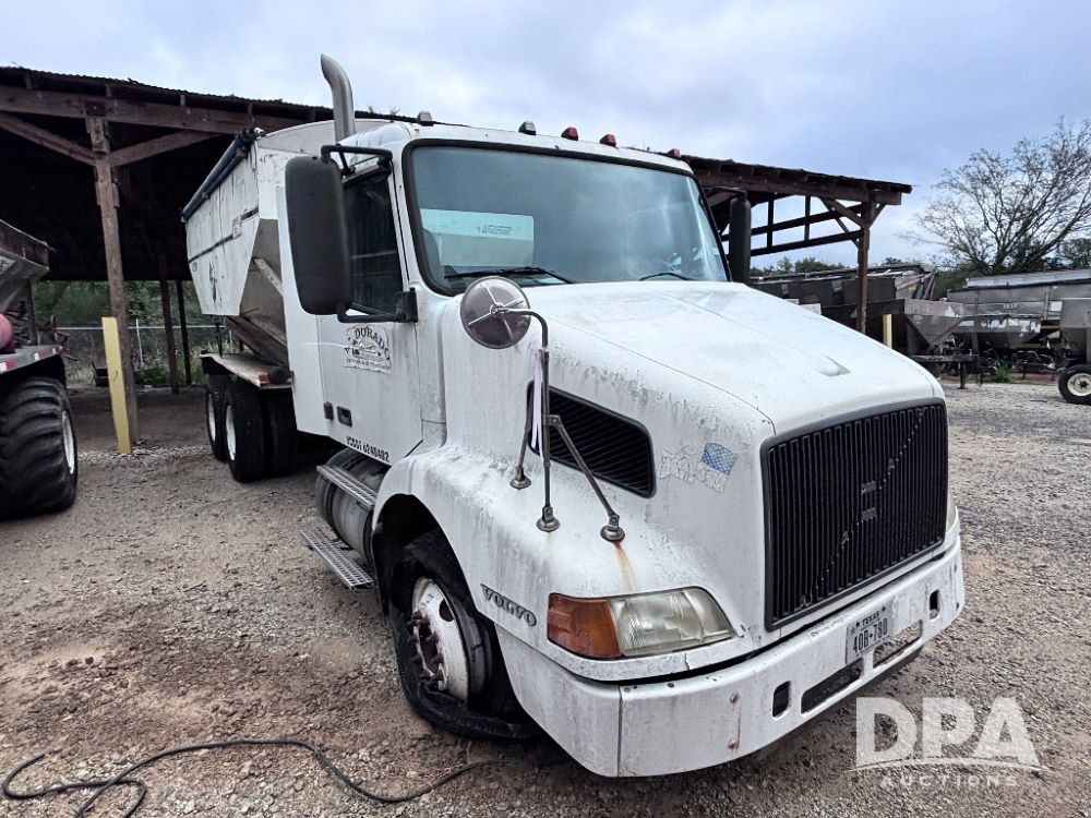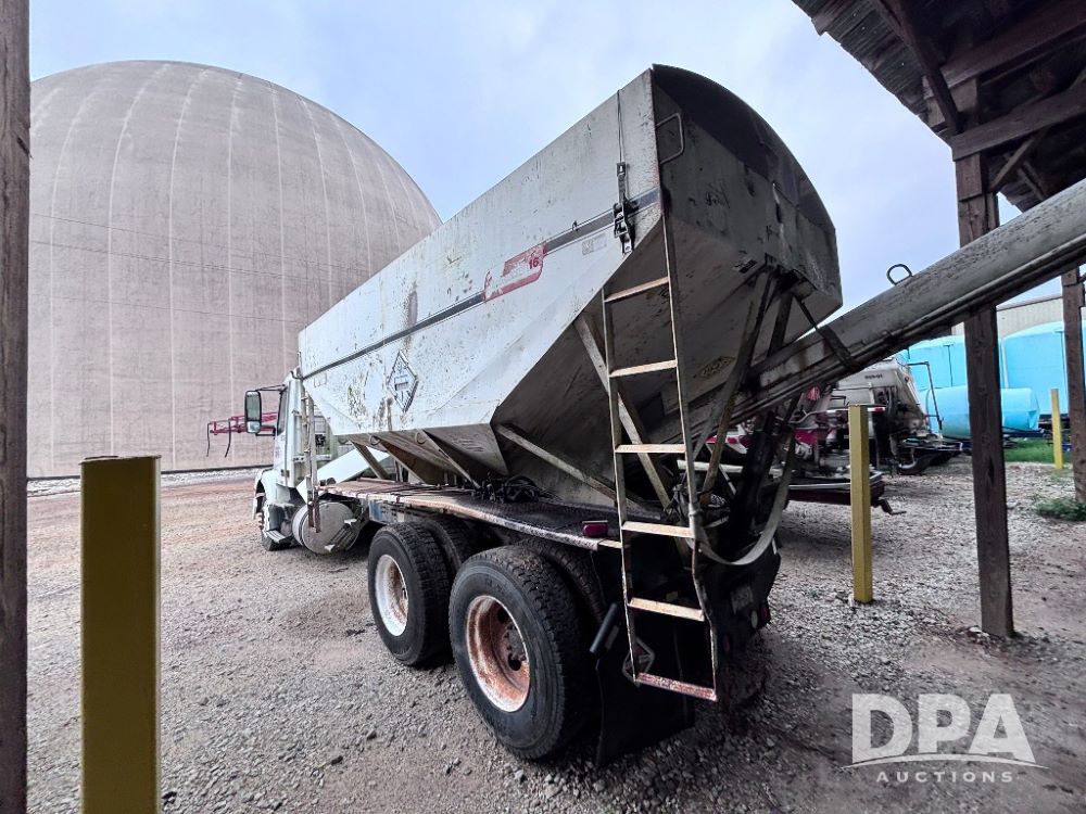 2003 Volvo Dry Tender Truck (GP11773, Unit 667-26), Volvo 12.1L diesel engine, Meritor 10 speed transmission, heat, tandem axle, air ride suspension, Willmar Fast Flow 16 ton dry tender box, rear discharge auger, roll tarp, hydraulic, fuel tank, single exhaust, 11R22.5 tires.