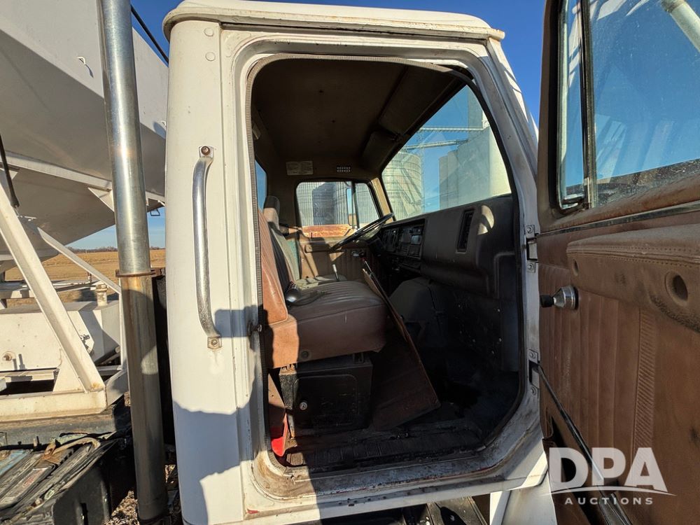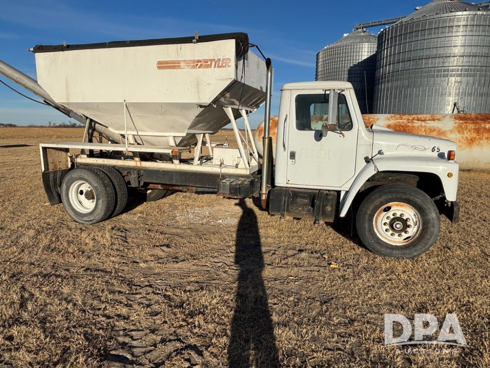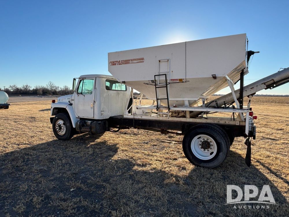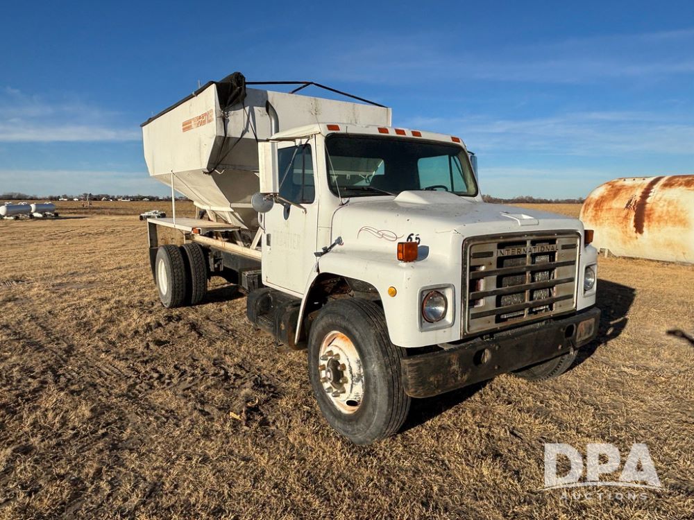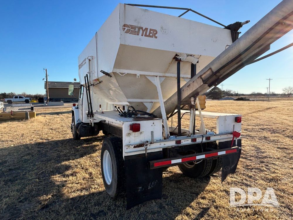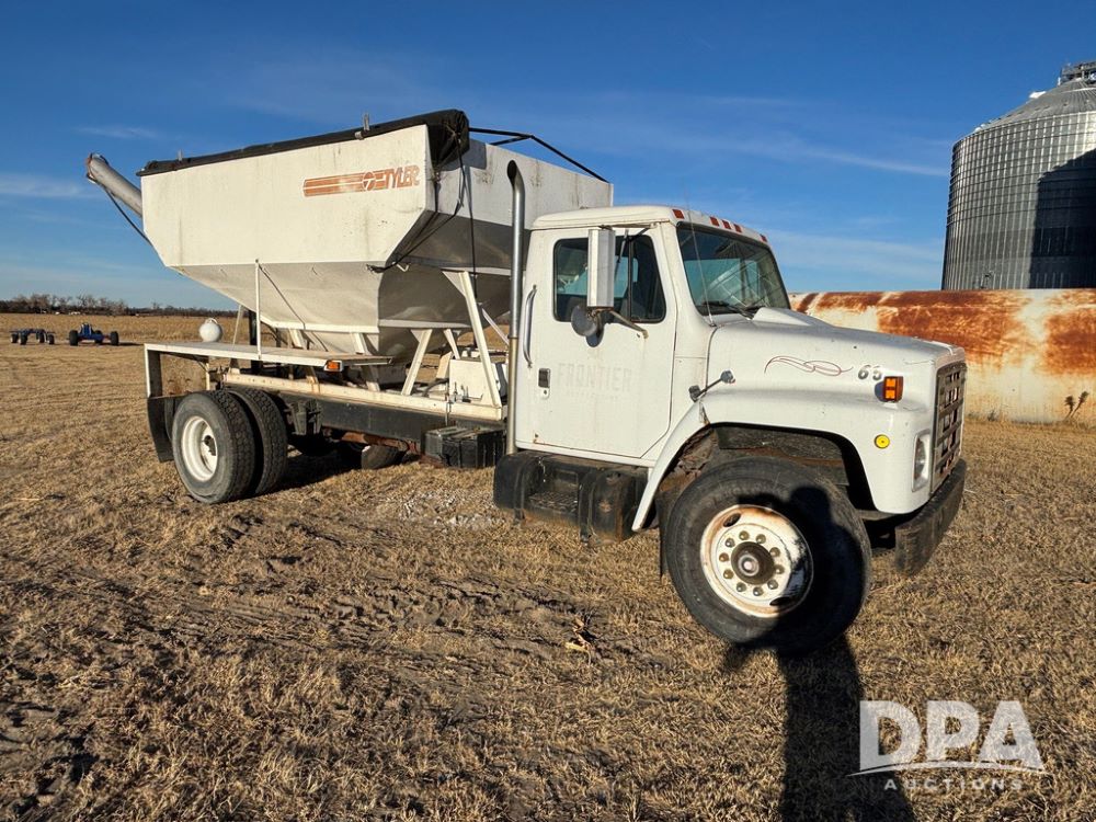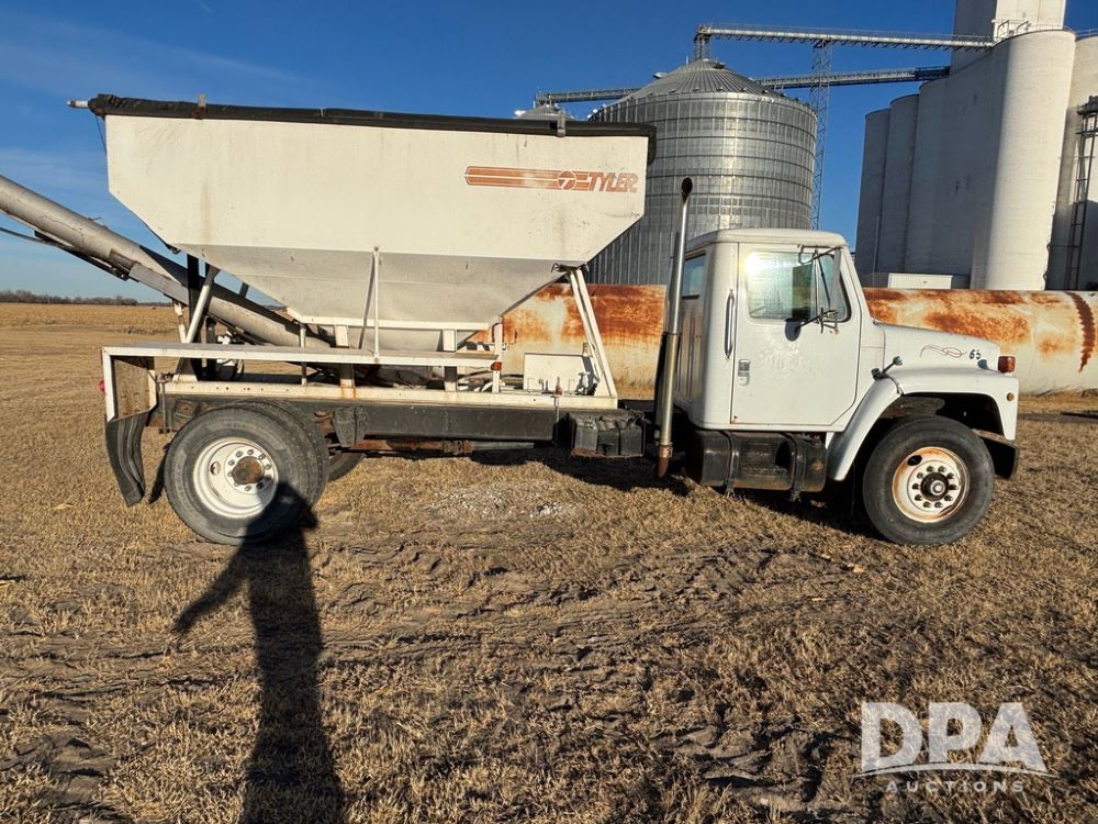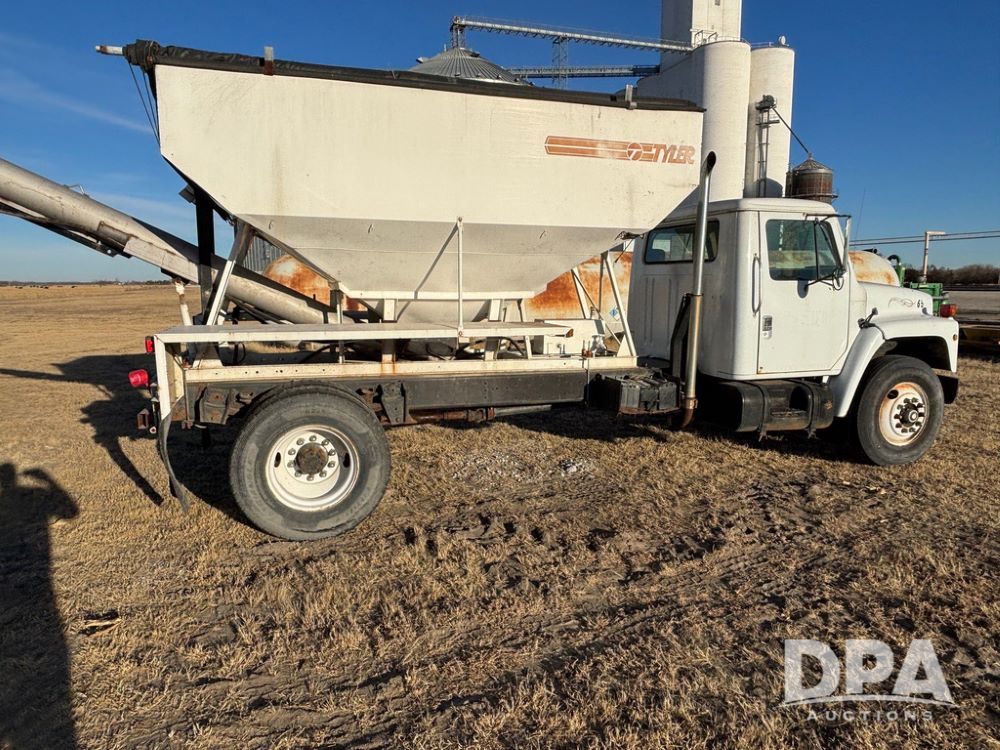 1985 IHC S1954 Dry Tender Truck (GP12272, Unit 2143), diesel engine, Spicer Double Duty D transmission, with 2 speed rear end, heat, Am/Fm radio, single axle, spring suspension, Tyler 10 ton dry tender box, rear discharge auger, all hydraulic, roll over tarp, 11R22.5 tires, shows 286,109 miles.
