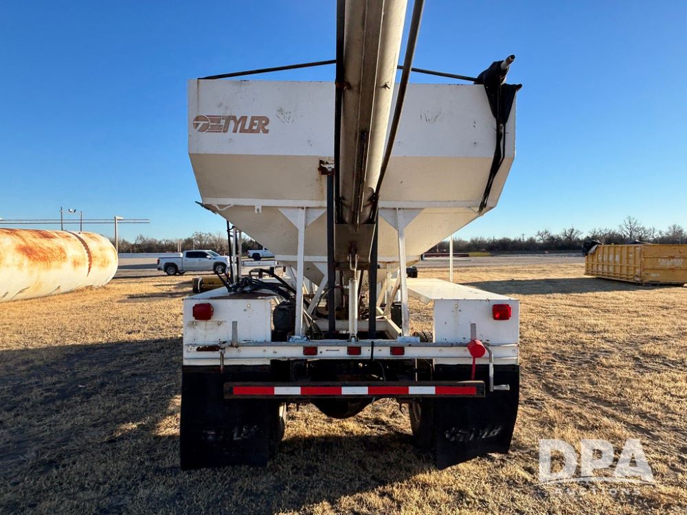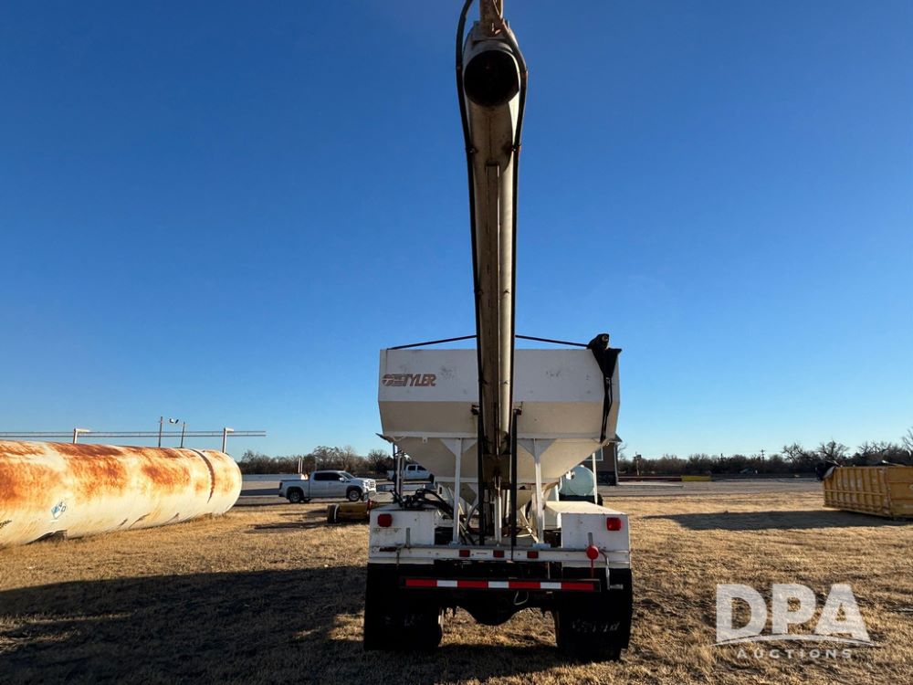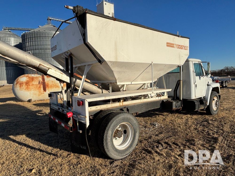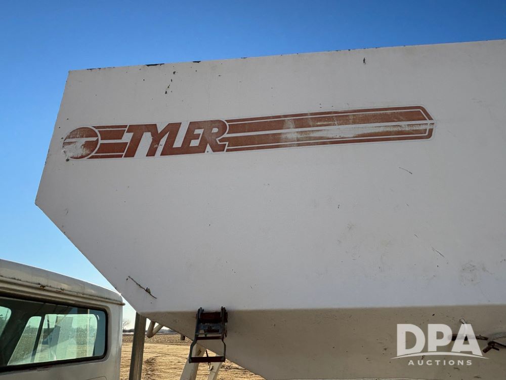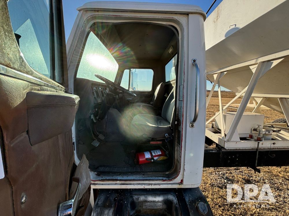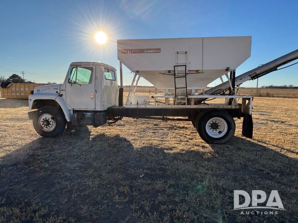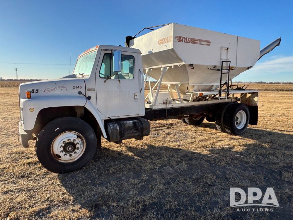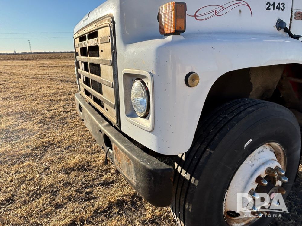 1985 IHC S1954 Dry Tender Truck (GP12272, Unit 2143), diesel engine, Spicer Double Duty D transmission, with 2 speed rear end, heat, Am/Fm radio, single axle, spring suspension, Tyler 10 ton dry tender box, rear discharge auger, all hydraulic, roll over tarp, 11R22.5 tires, shows 286,109 miles.