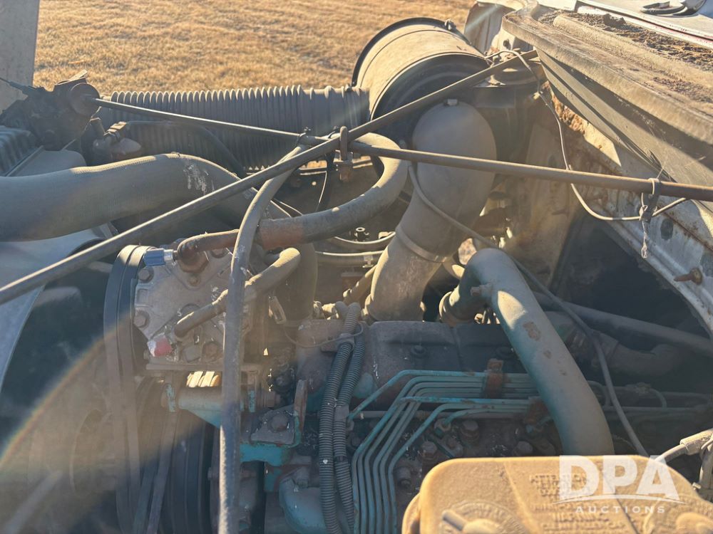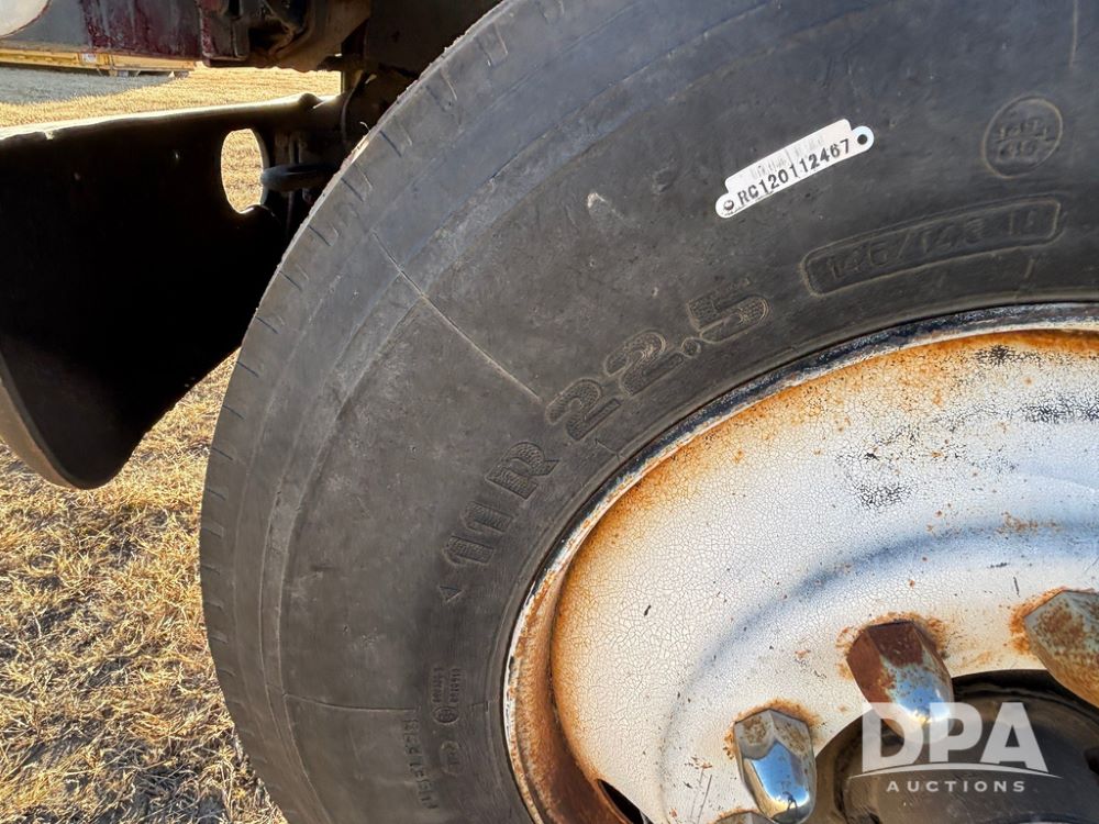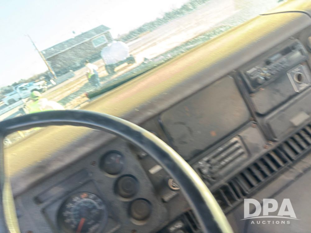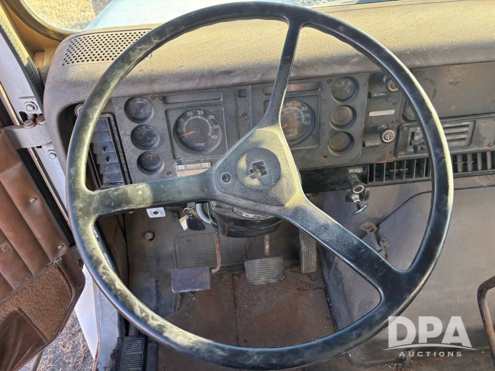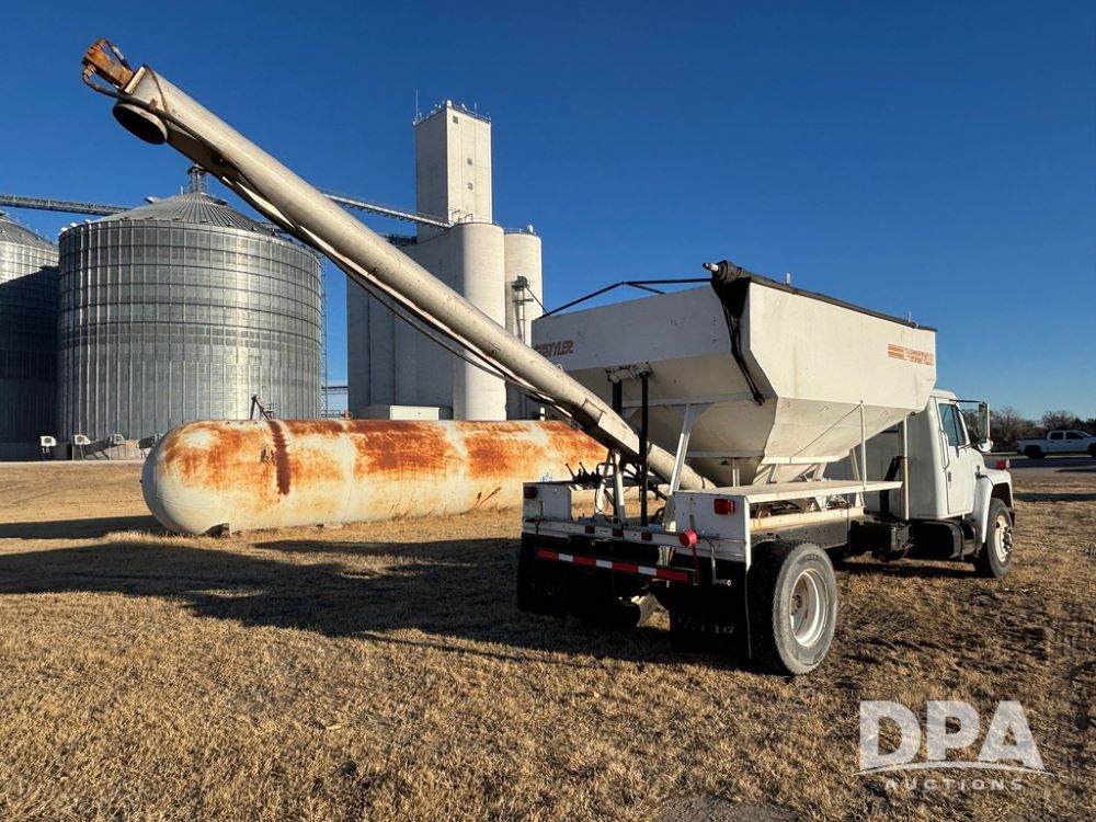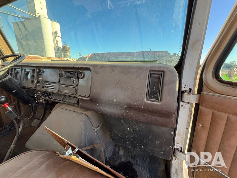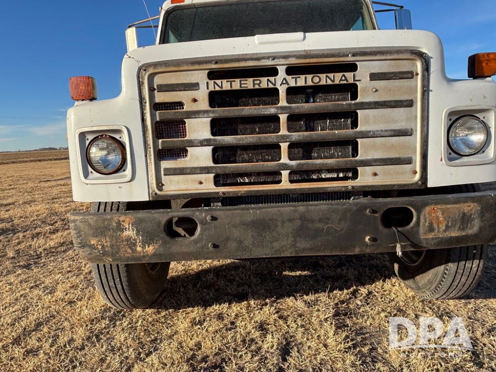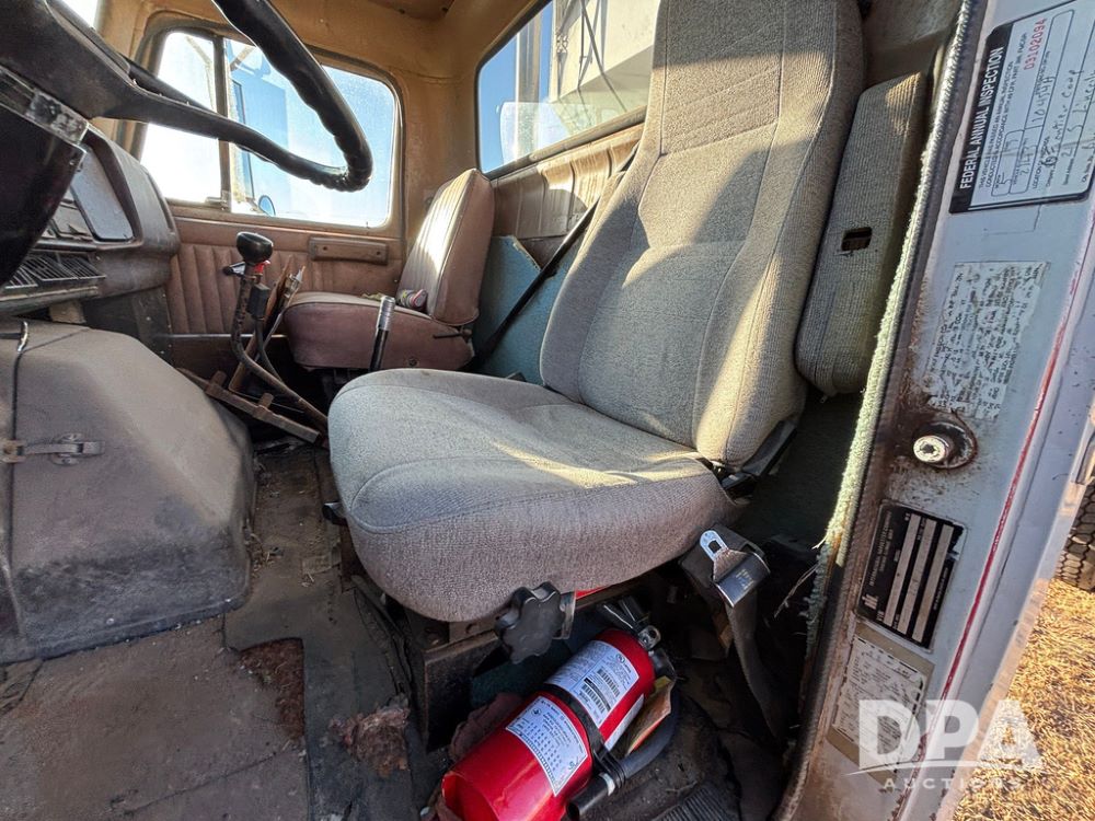 1985 IHC S1954 Dry Tender Truck (GP12272, Unit 2143), diesel engine, Spicer Double Duty D transmission, with 2 speed rear end, heat, Am/Fm radio, single axle, spring suspension, Tyler 10 ton dry tender box, rear discharge auger, all hydraulic, roll over tarp, 11R22.5 tires, shows 286,109 miles.