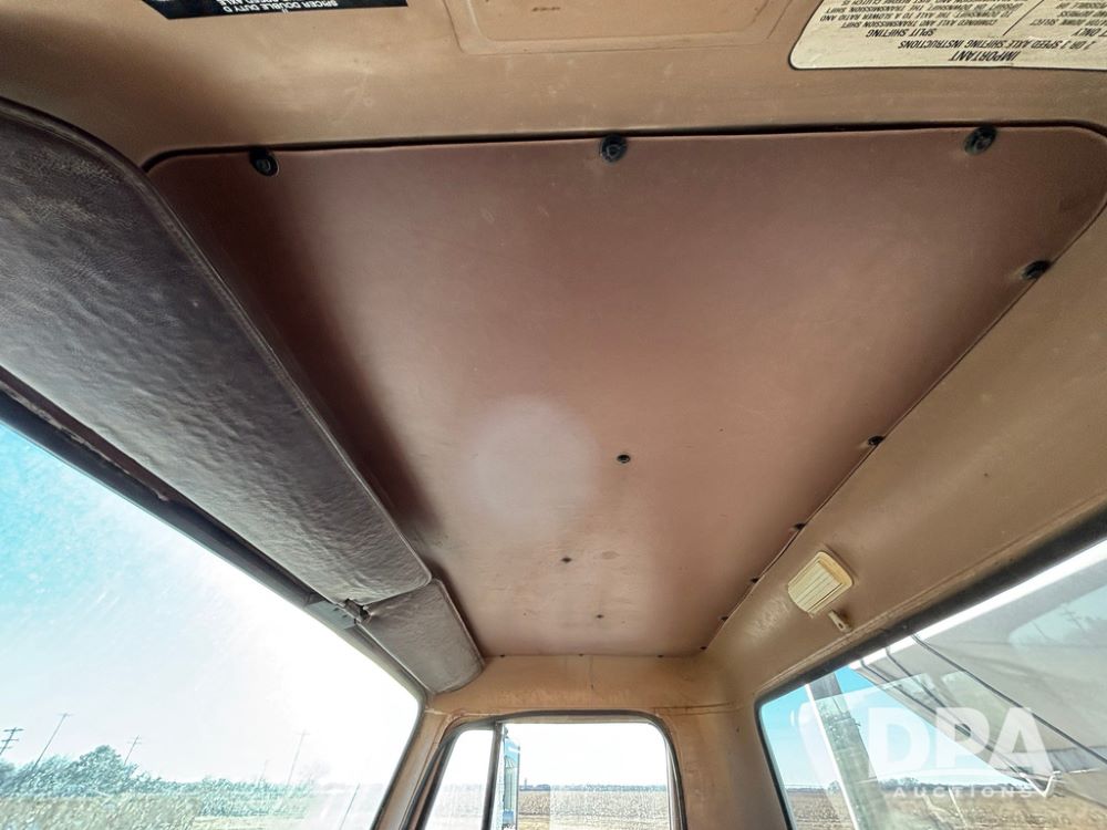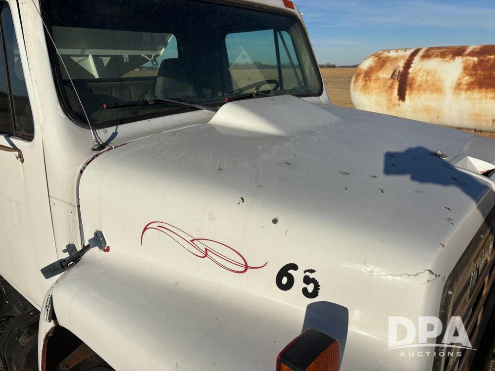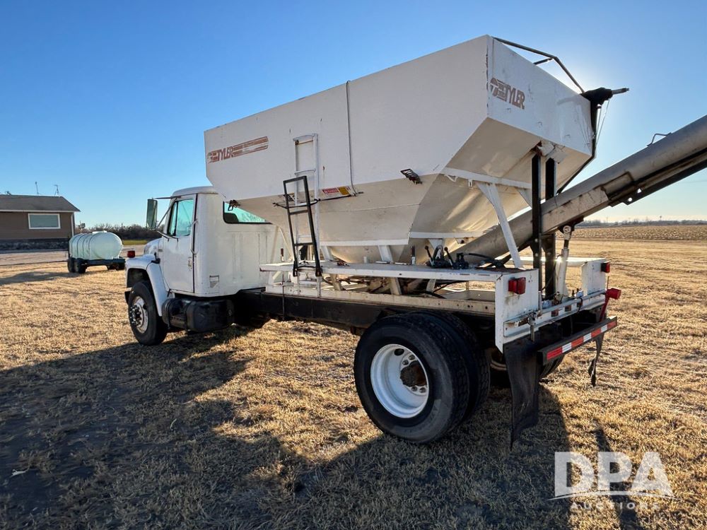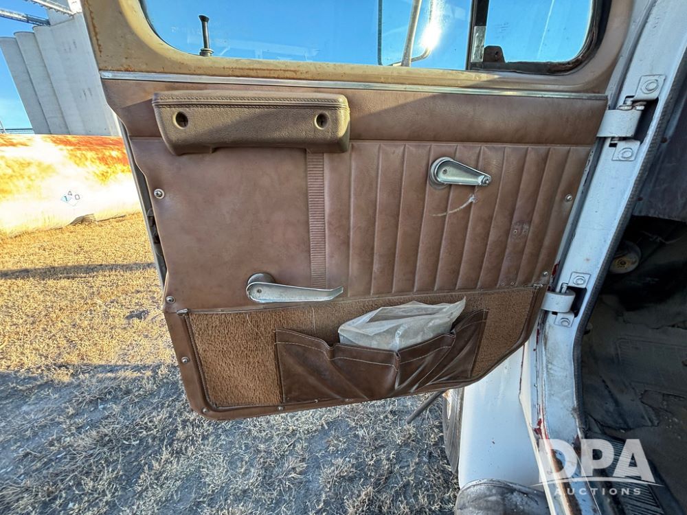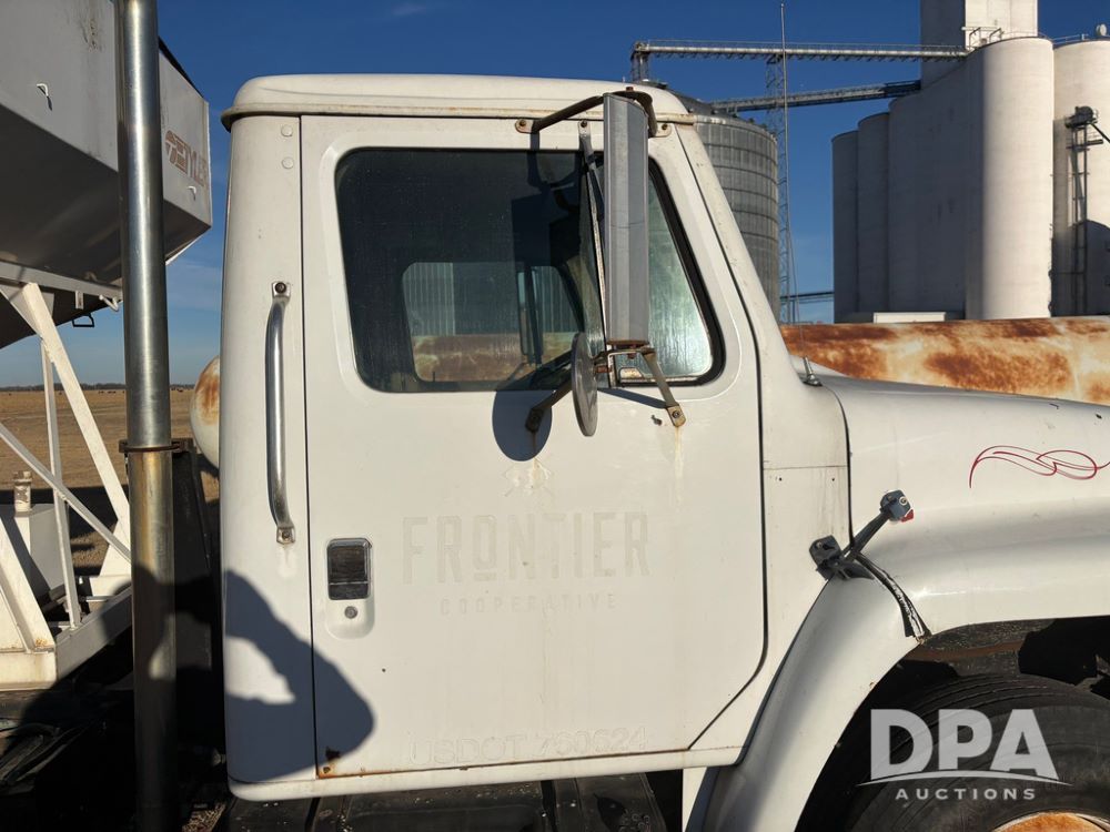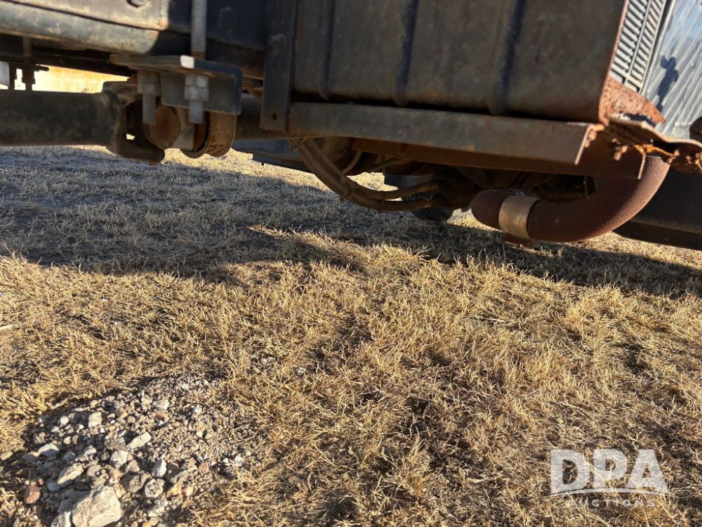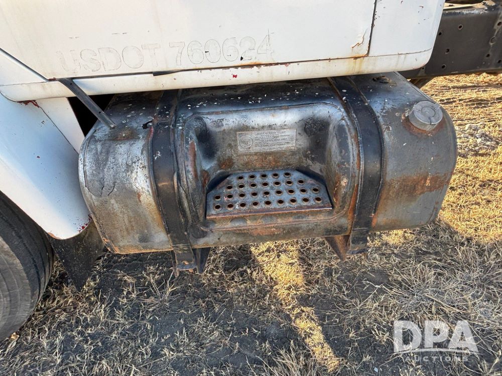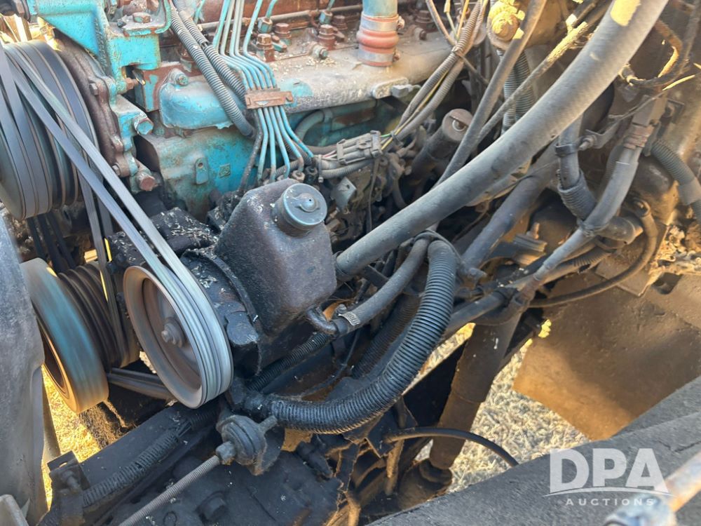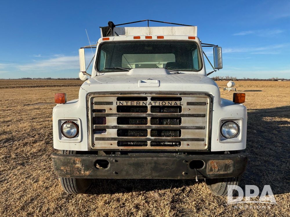 1985 IHC S1954 Dry Tender Truck (GP12272, Unit 2143), diesel engine, Spicer Double Duty D transmission, with 2 speed rear end, heat, Am/Fm radio, single axle, spring suspension, Tyler 10 ton dry tender box, rear discharge auger, all hydraulic, roll over tarp, 11R22.5 tires, shows 286,109 miles.