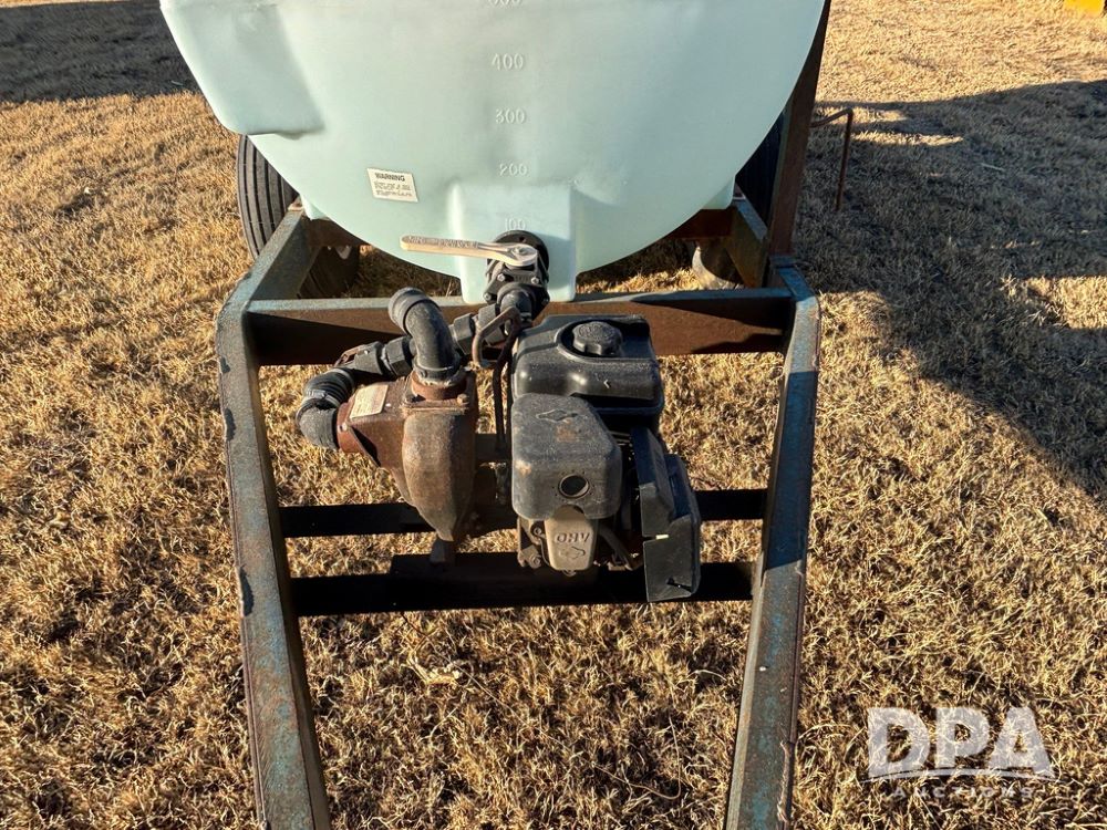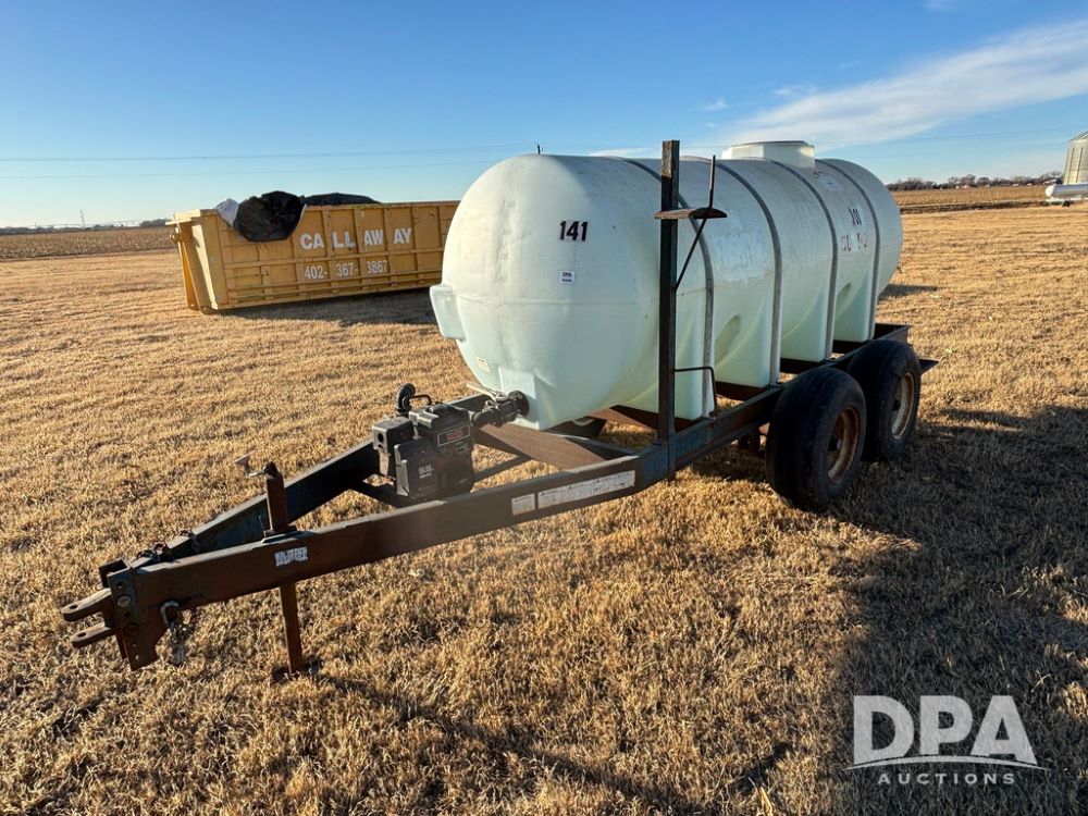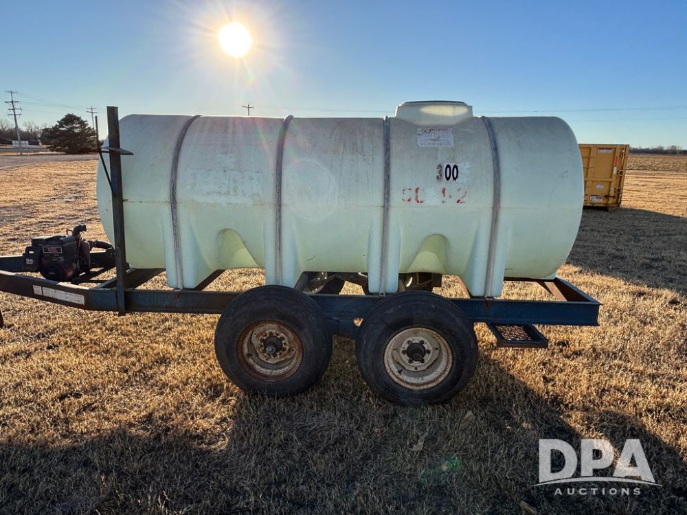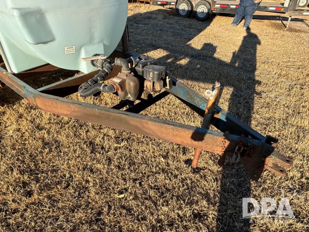 Poly Liquid Nurse Trailer (GP12275, Unit 141), 1000 gallon poly liquid nurse tank, Briggs & Stratton 5.5 hp gas engine, Banjo pump, tandem axle gear, 11L-15 flotation tires.