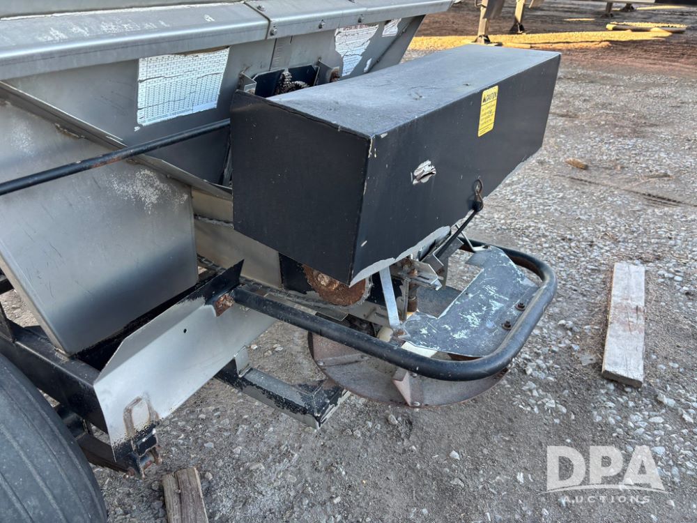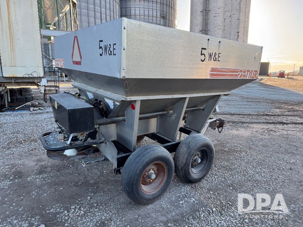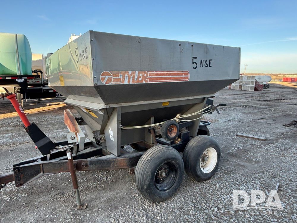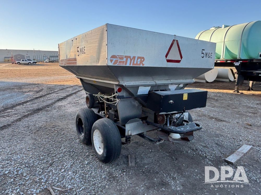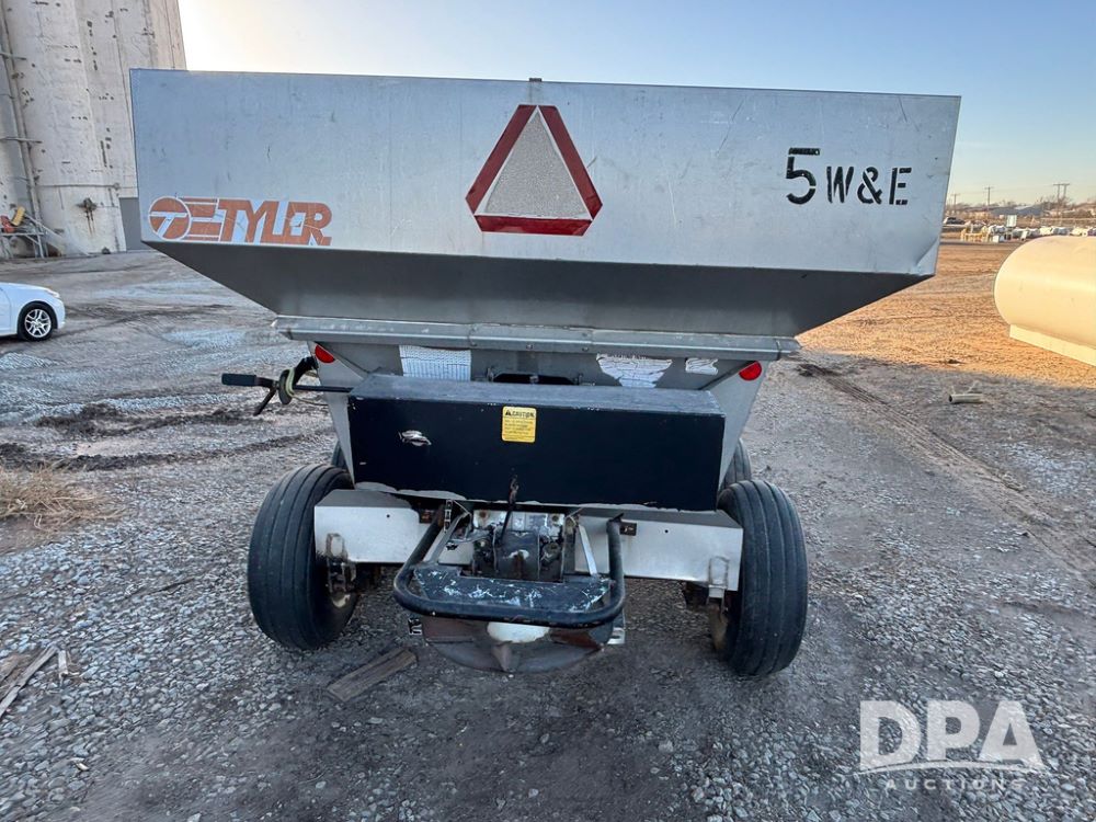 Tyler Dry Spreader (GP12327, Unit 5), Tyler stainless steel dry spreader, single spinner, PTO, tandem axle, 11L-15 flotation tires.