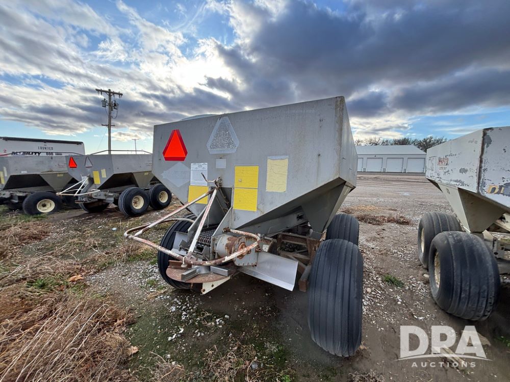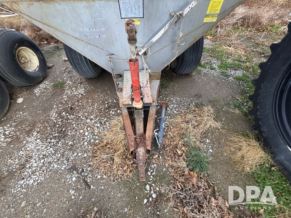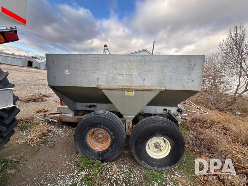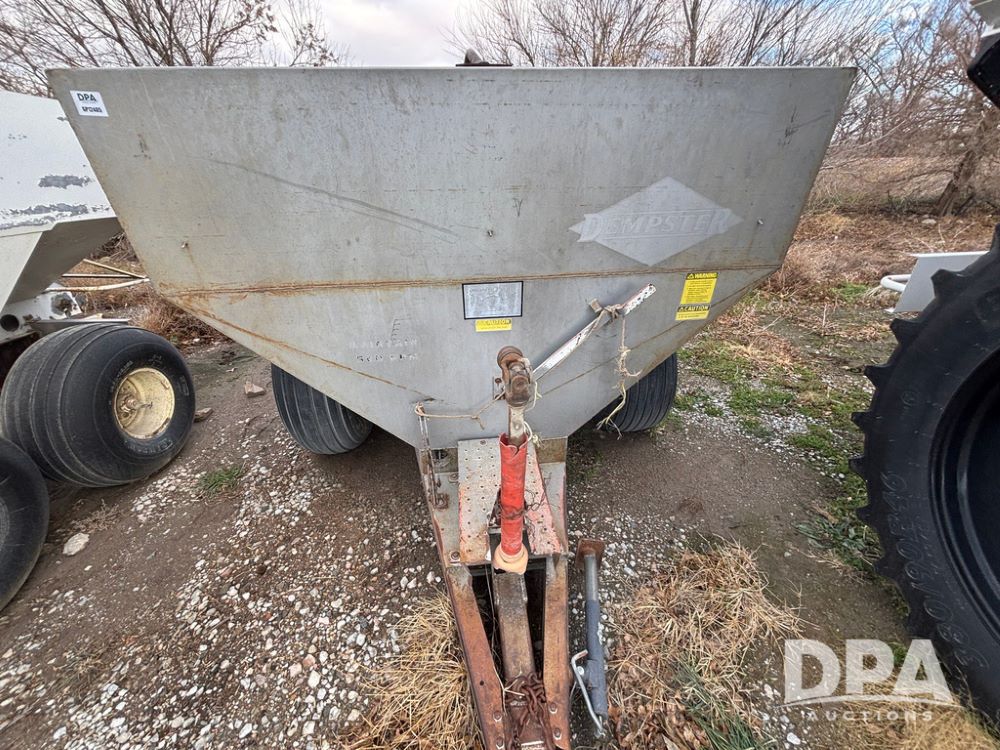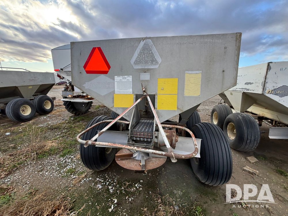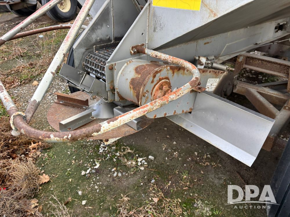 Dempster Dry Spreader (GP12405, Unit 6), Dempster Clipper 200S stainless steel dry spreader, single spinner, tandem axle, 16.5L-16.1 flotation tires.