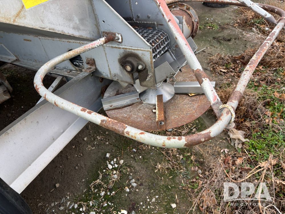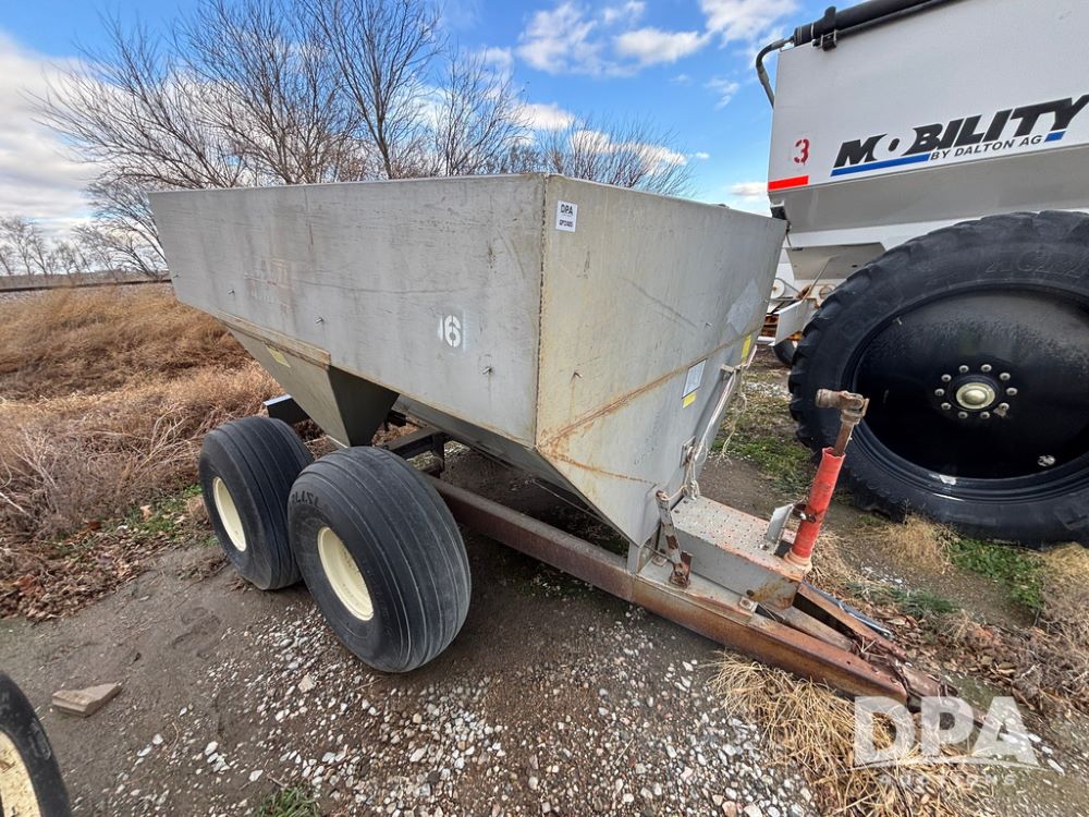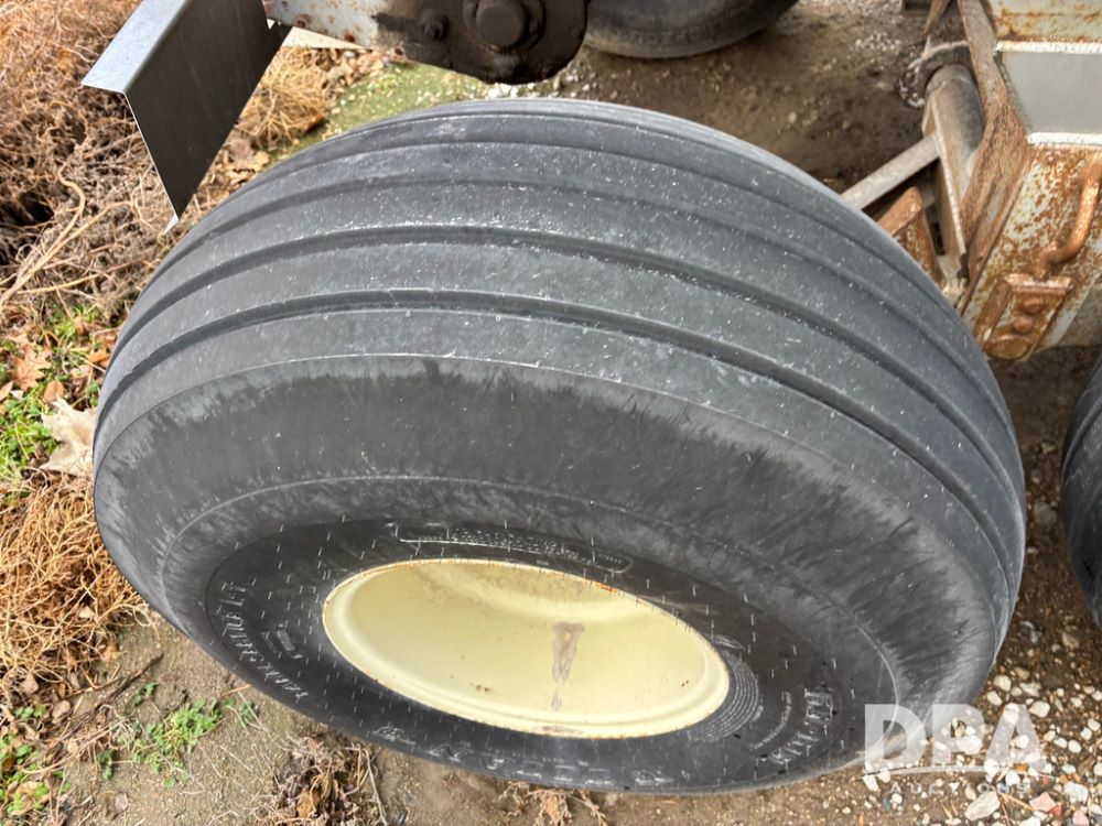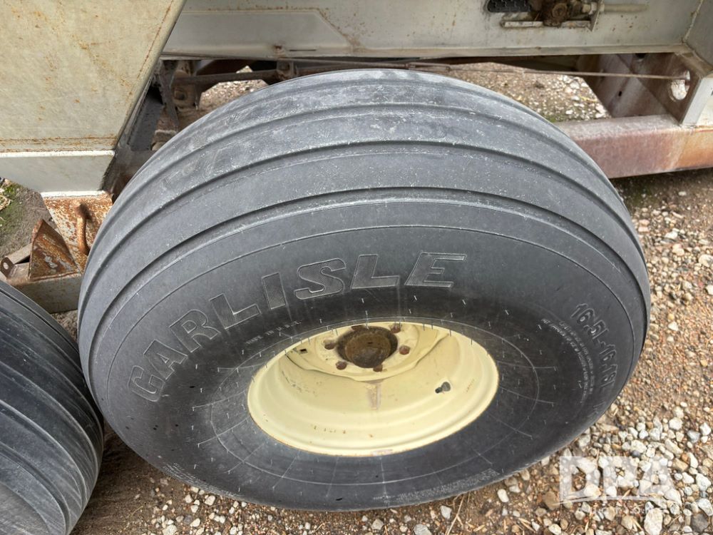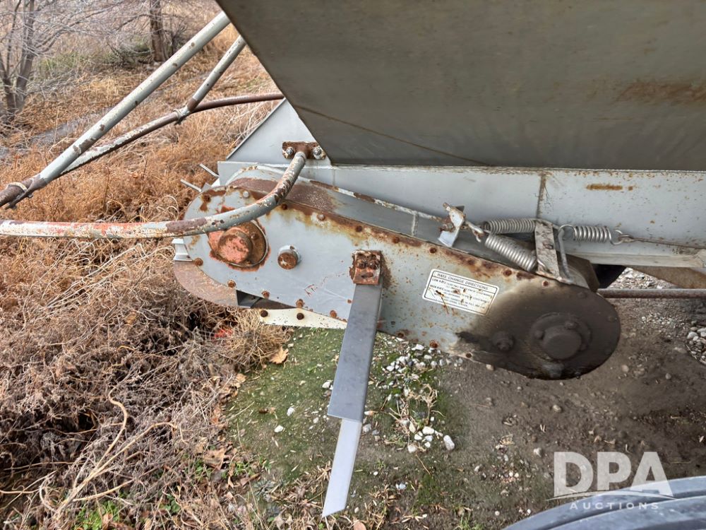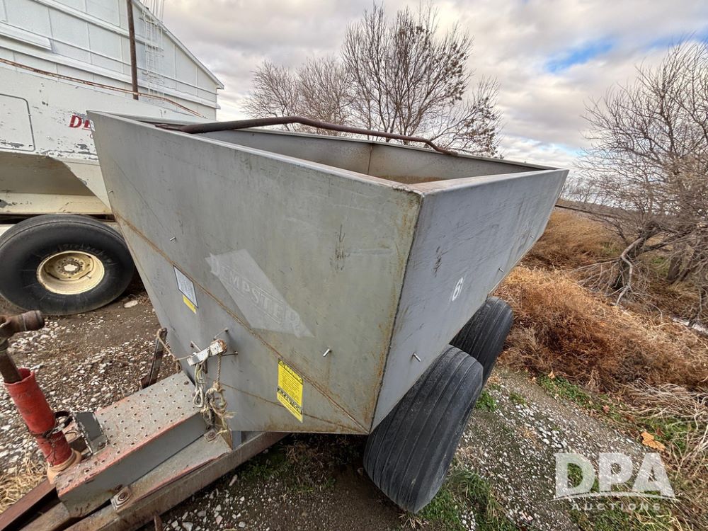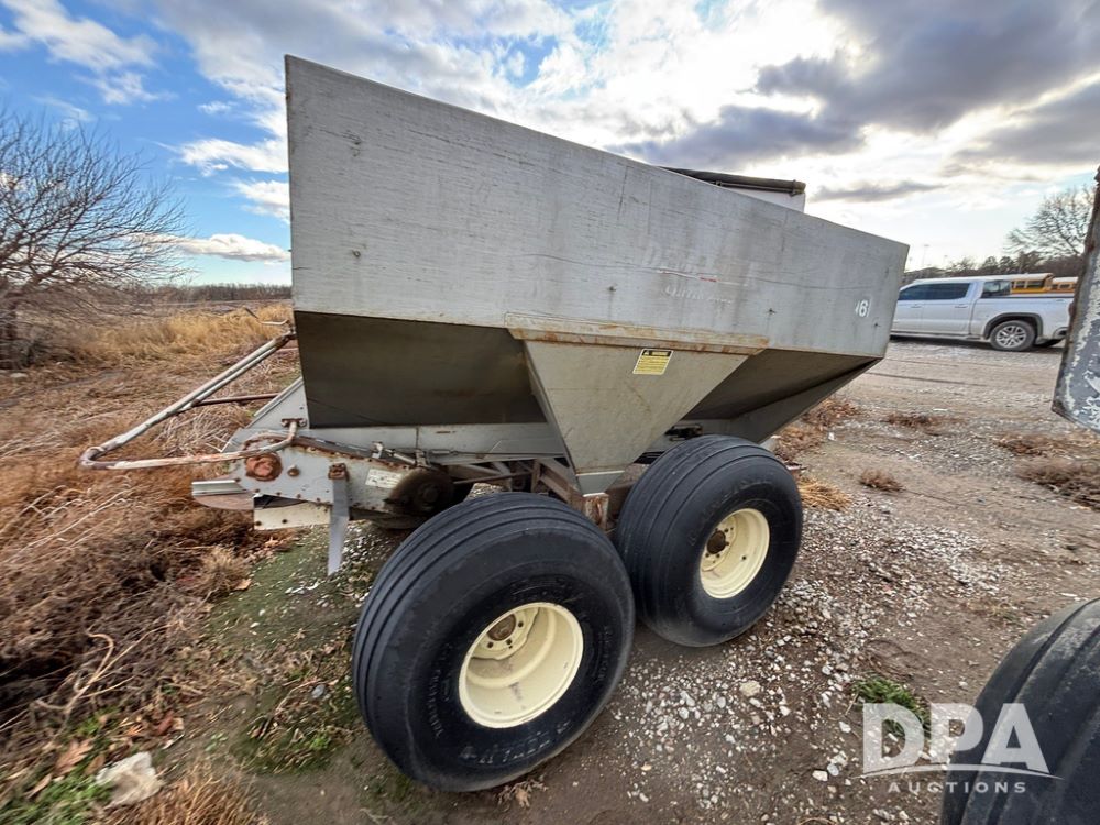 Dempster Dry Spreader (GP12405, Unit 6), Dempster Clipper 200S stainless steel dry spreader, single spinner, tandem axle, 16.5L-16.1 flotation tires.