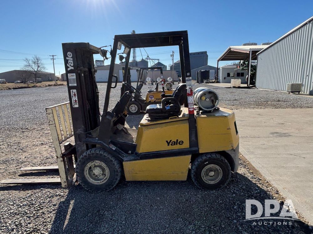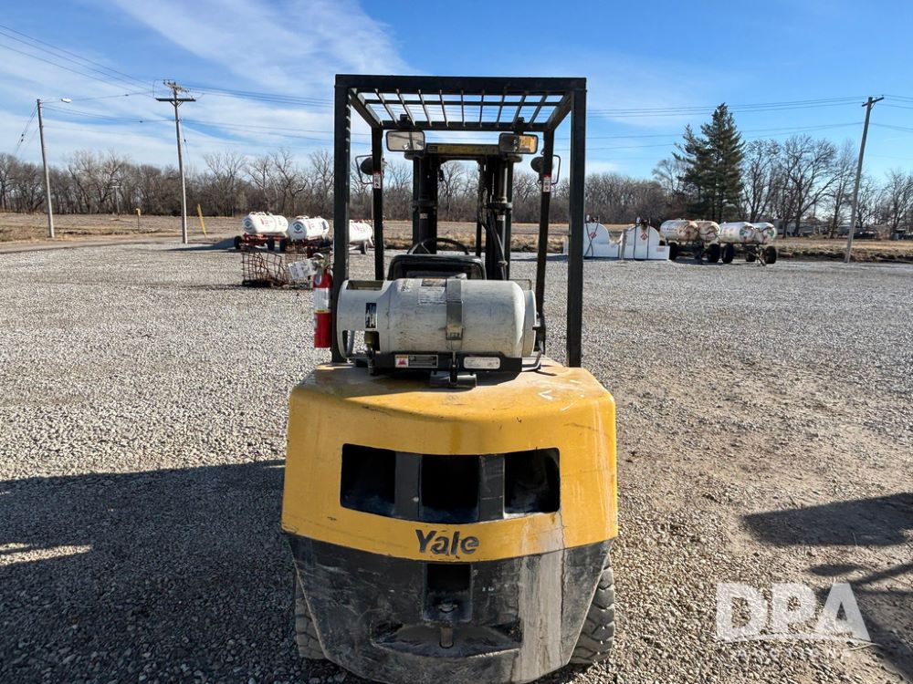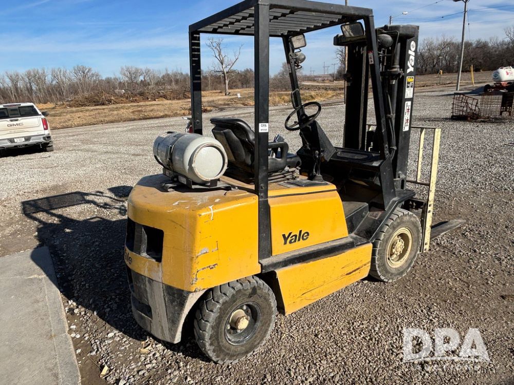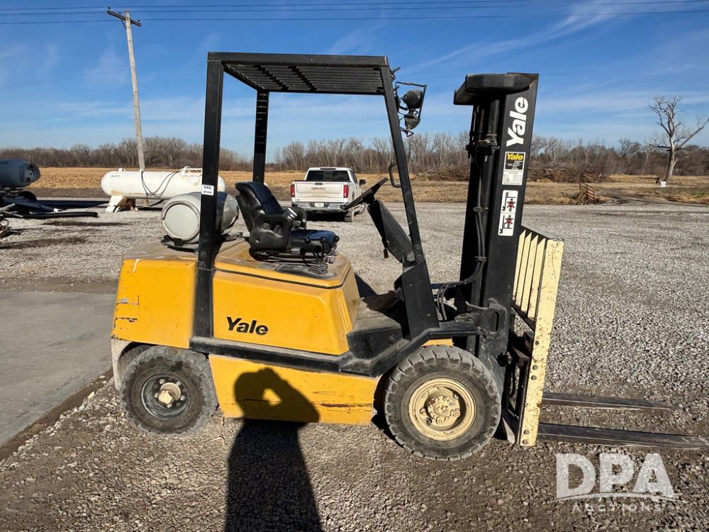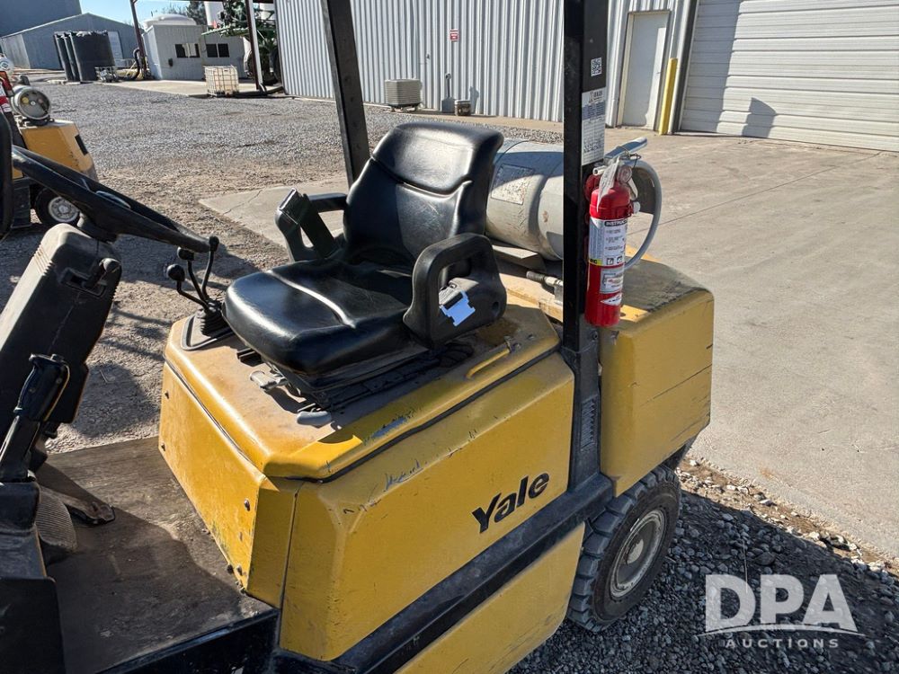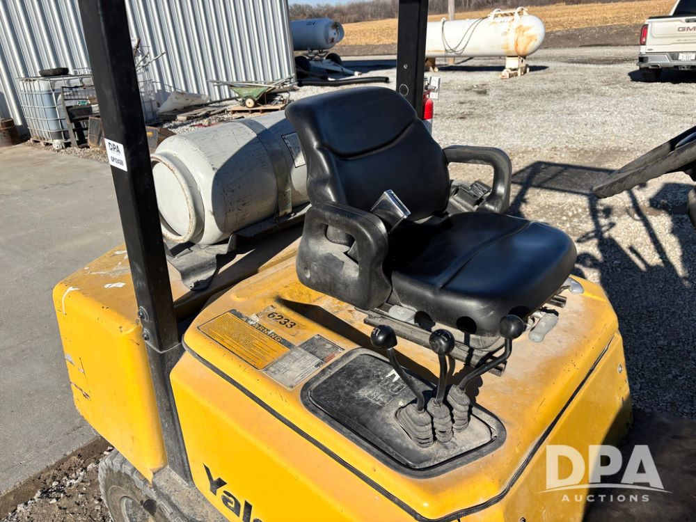 2001 Yale model GLP060 Forklift (GP12438, Unit 6233), LP gas engine, shuttle shift transmission, canopy, lights, forks, side shift, 7.00-12 front tires, 6.50-10 rear tires, shows 7,632 hours.
