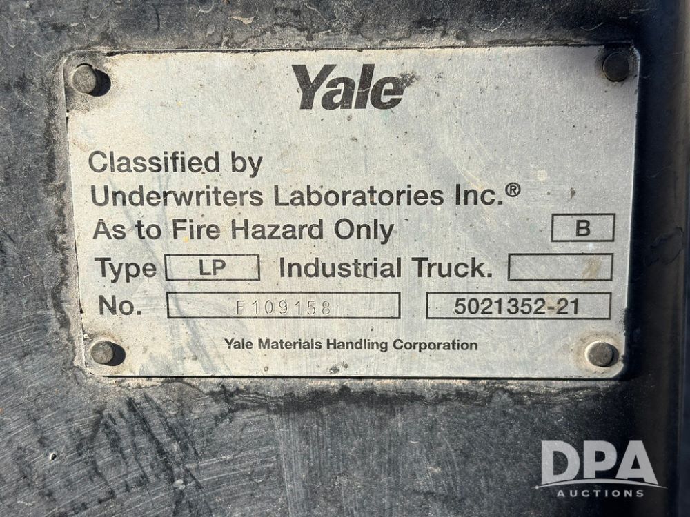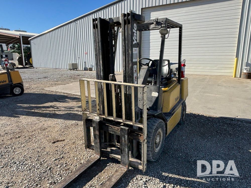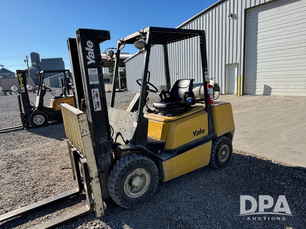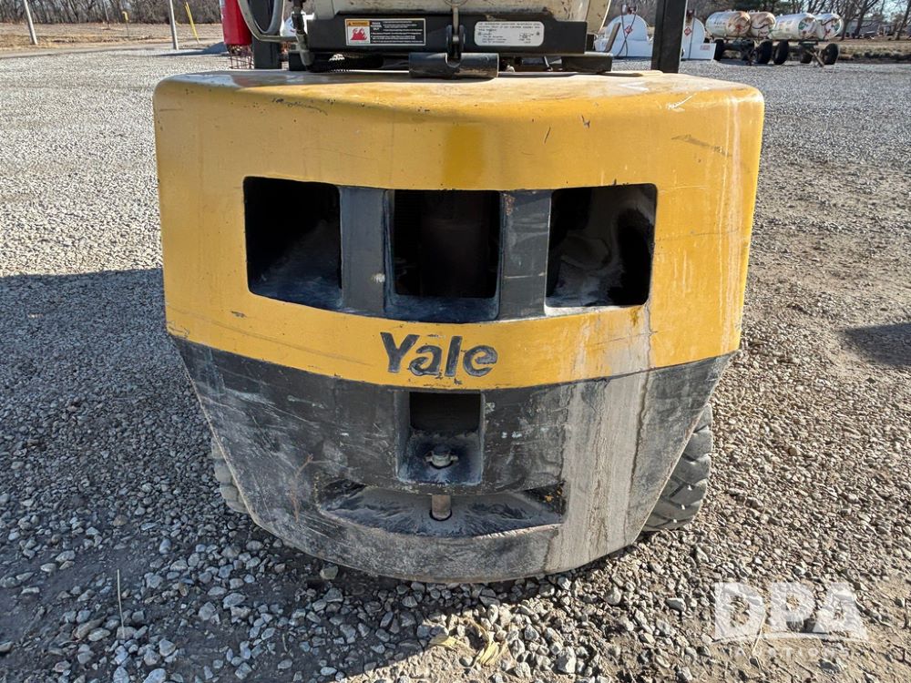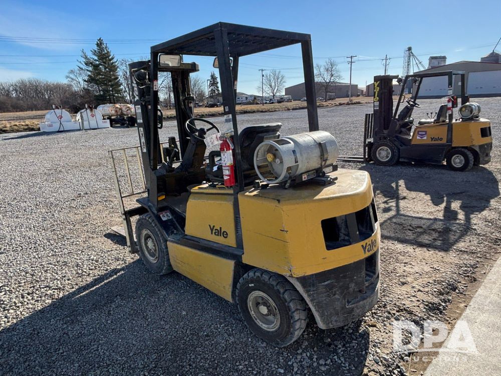 2001 Yale model GLP060 Forklift (GP12438, Unit 6233), LP gas engine, shuttle shift transmission, canopy, lights, forks, side shift, 7.00-12 front tires, 6.50-10 rear tires, shows 7,632 hours.