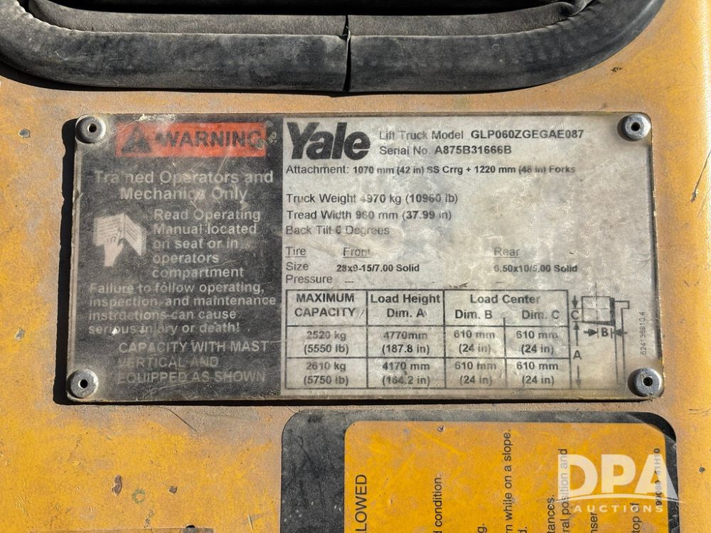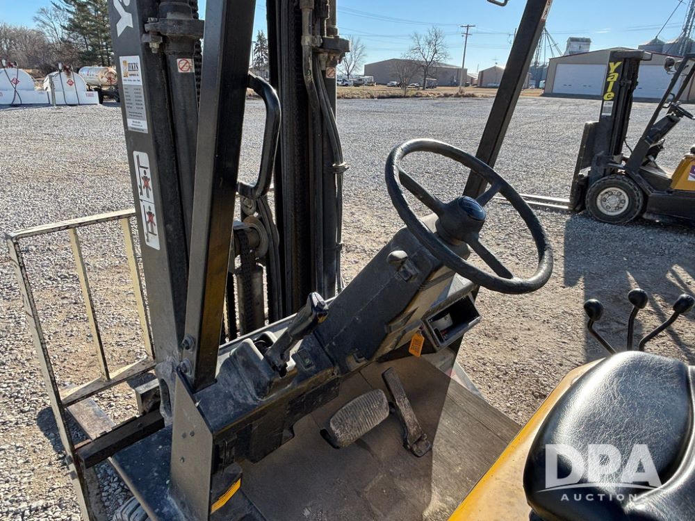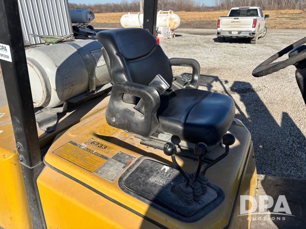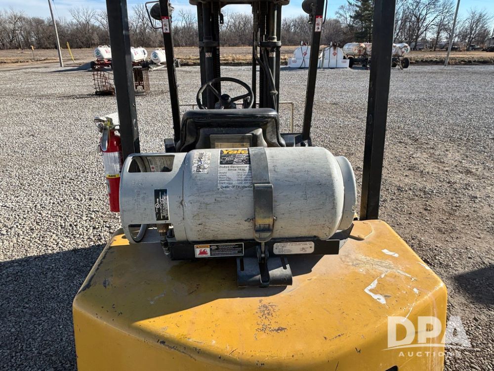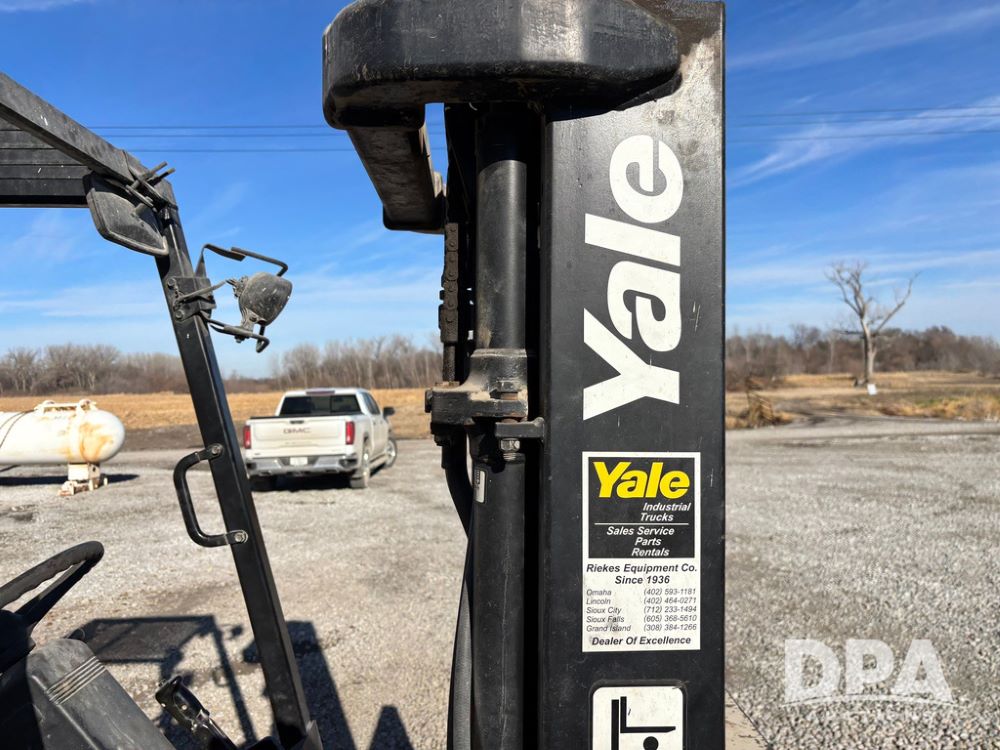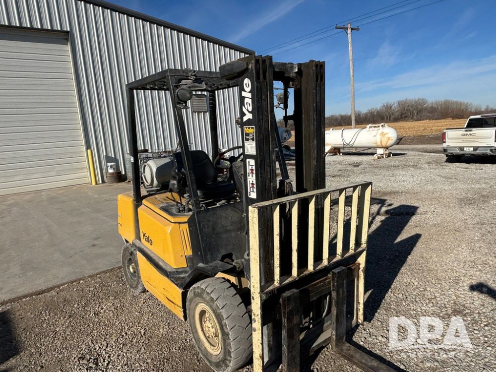 2001 Yale model GLP060 Forklift (GP12438, Unit 6233), LP gas engine, shuttle shift transmission, canopy, lights, forks, side shift, 7.00-12 front tires, 6.50-10 rear tires, shows 7,632 hours.