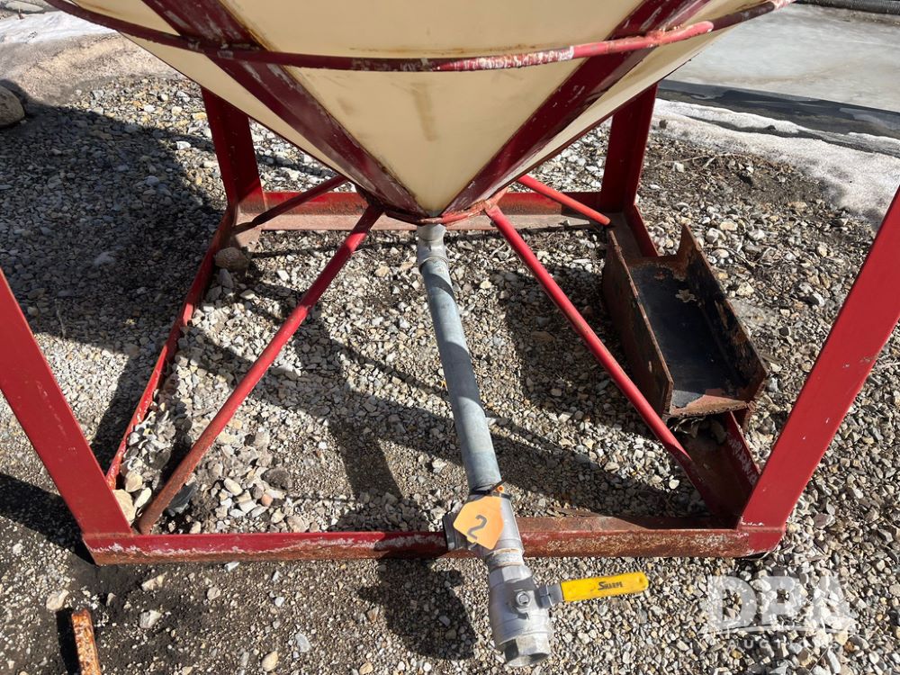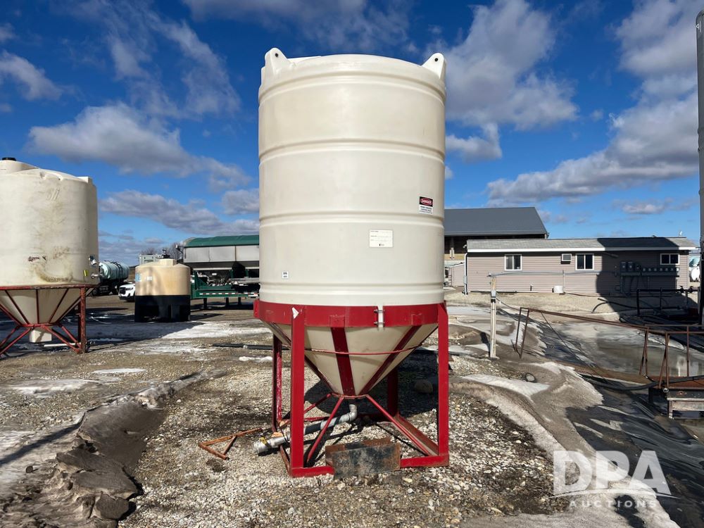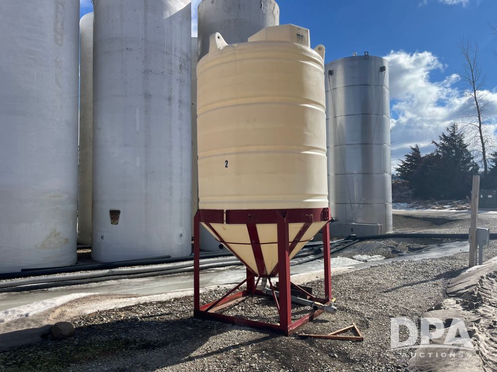 Poly Liquid Tank (JN3925, Unit 2), Approx. 1,225 gallon poly cone bottom liquid tank, steel stand.