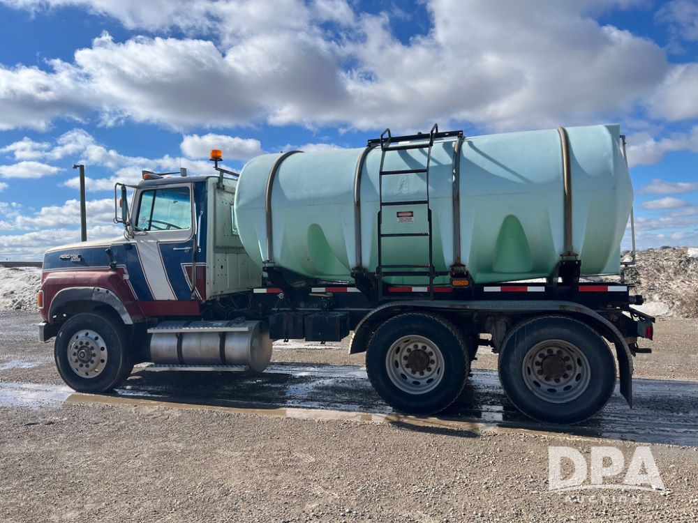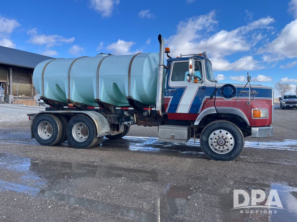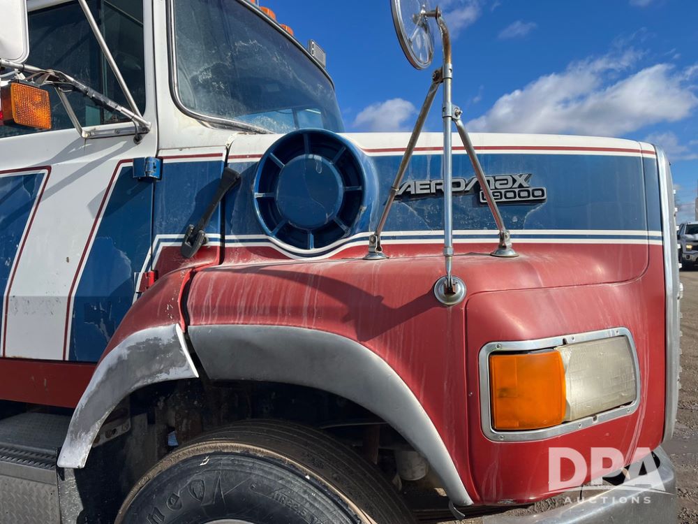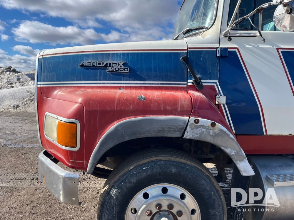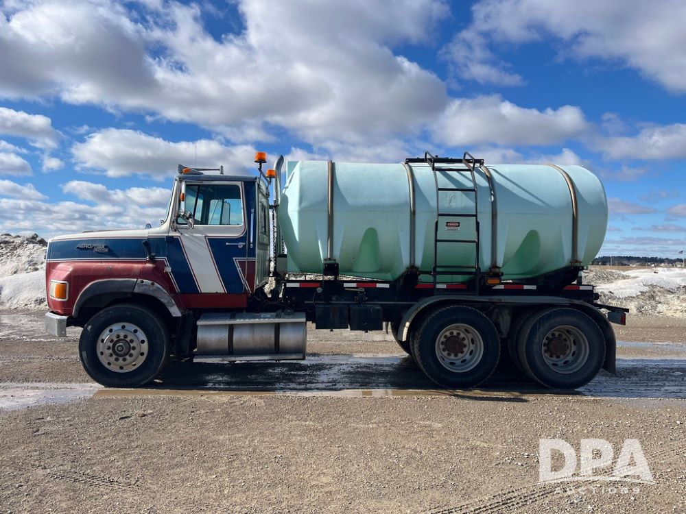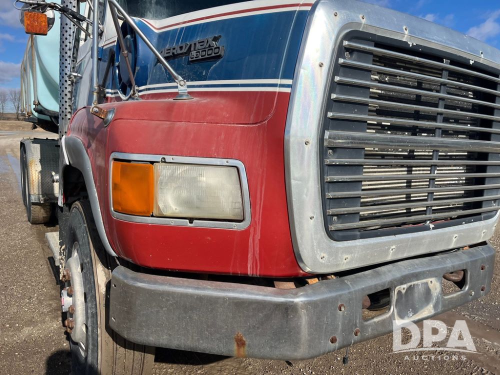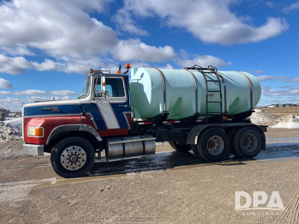 1990 Ford Aeromax L9000 Liquid Nurse Truck (JN3927, Unit 33436), Cat diesel engine, 13 speed transmission, air conditioning, heat, Am/Fm radio, tandem axle, full screw, air ride suspension, 3,000 gallon poly liquid nurse tank, ladder, 11R22.5 tires, aluminum rims, rear fenders.