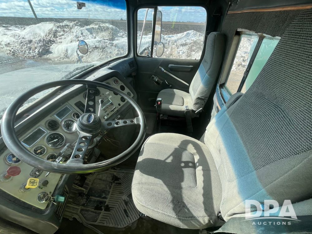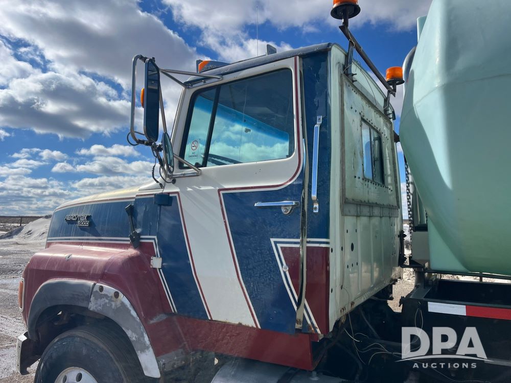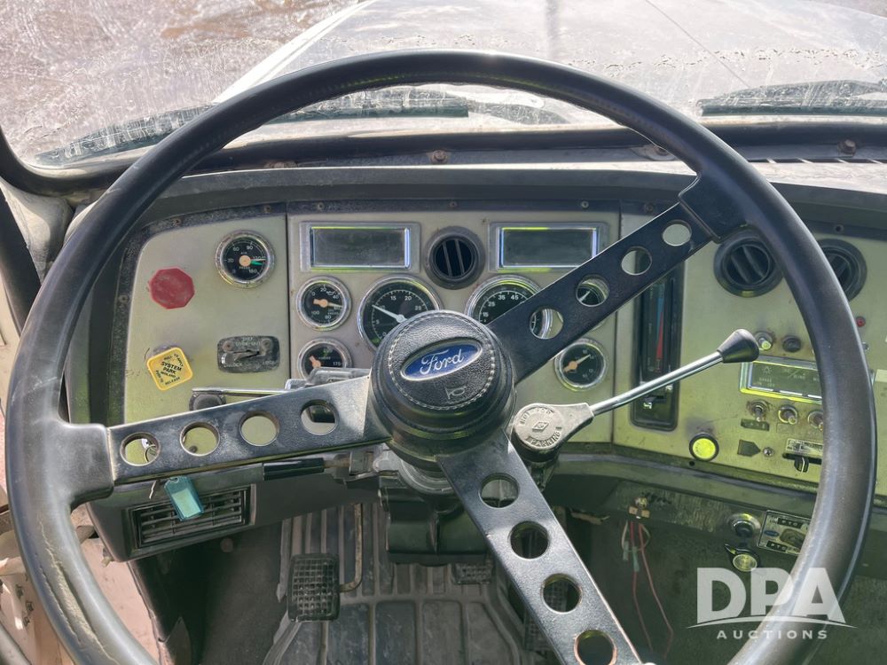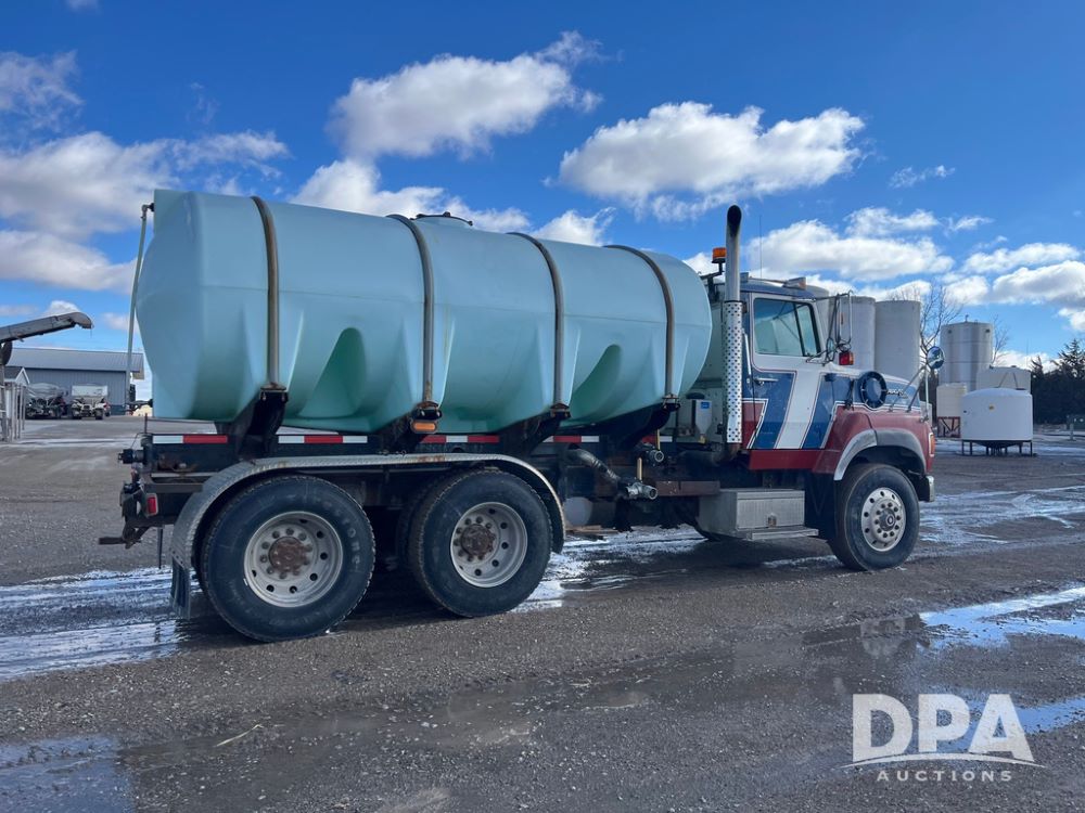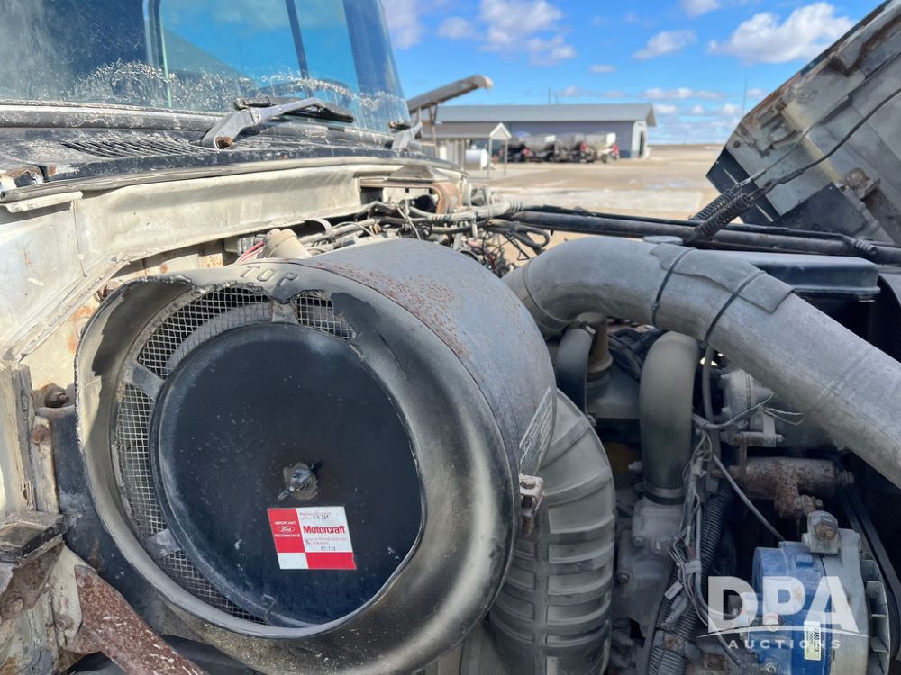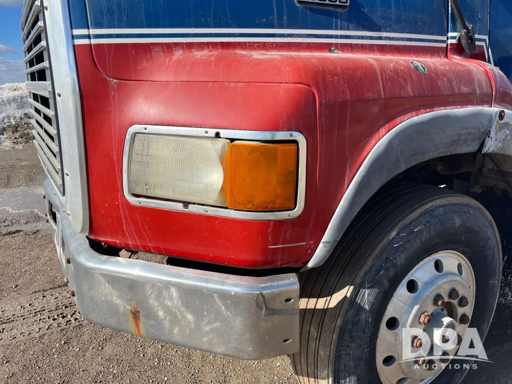 1990 Ford Aeromax L9000 Liquid Nurse Truck (JN3927, Unit 33436), Cat diesel engine, 13 speed transmission, air conditioning, heat, Am/Fm radio, tandem axle, full screw, air ride suspension, 3,000 gallon poly liquid nurse tank, ladder, 11R22.5 tires, aluminum rims, rear fenders.