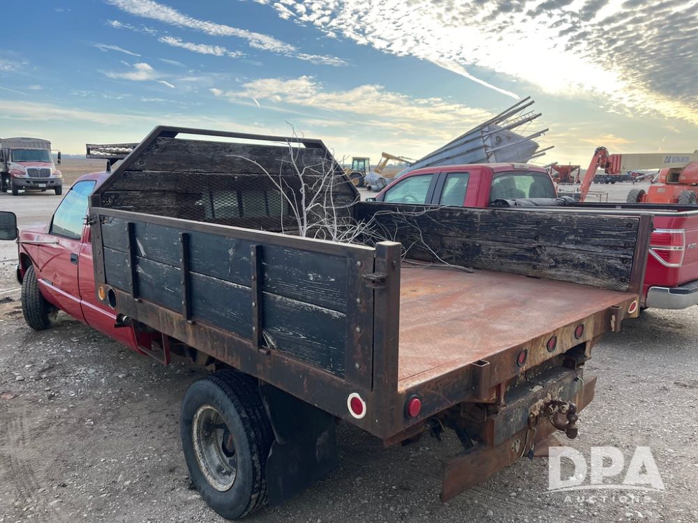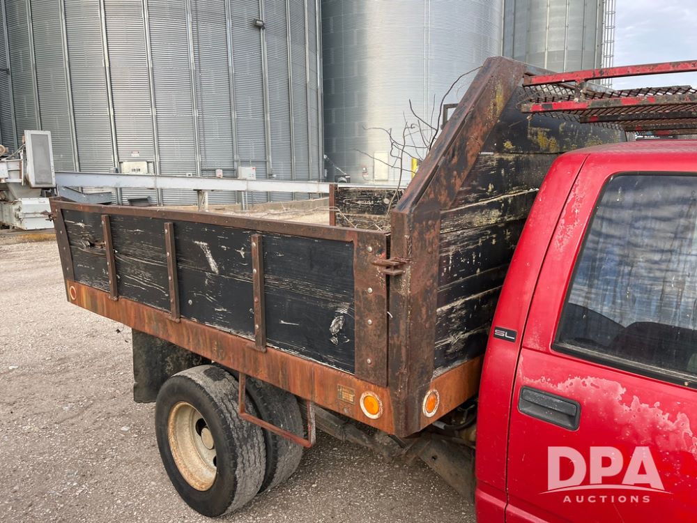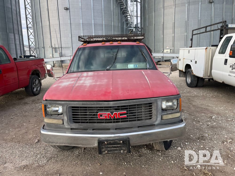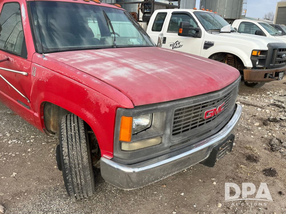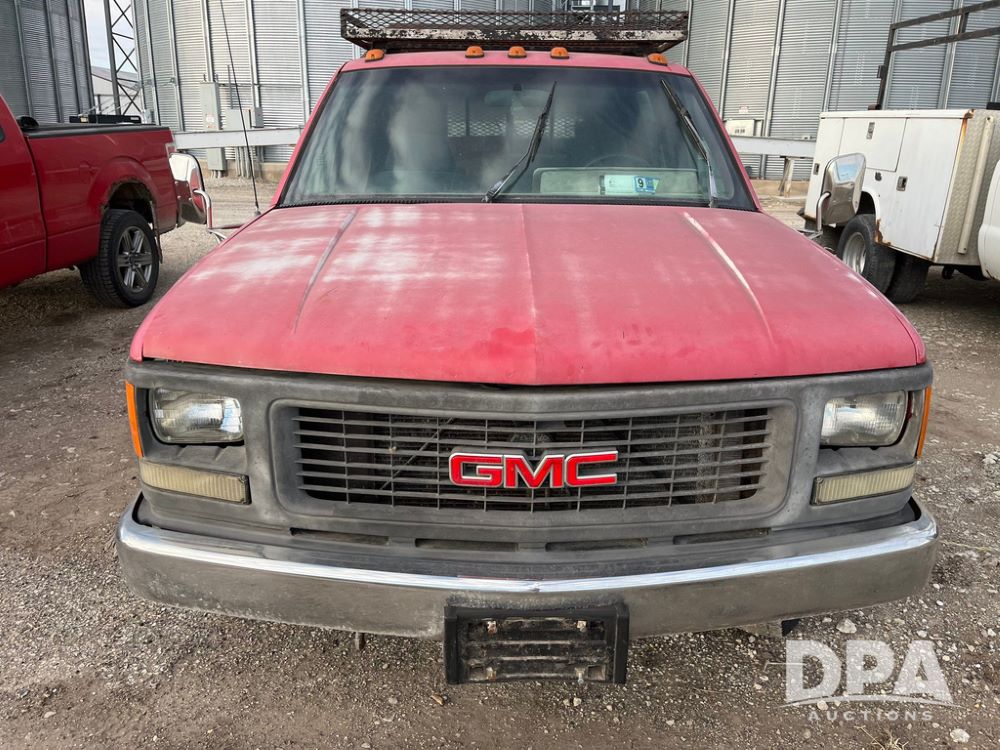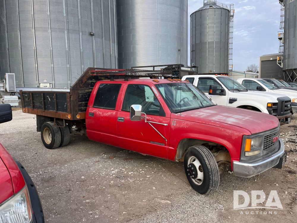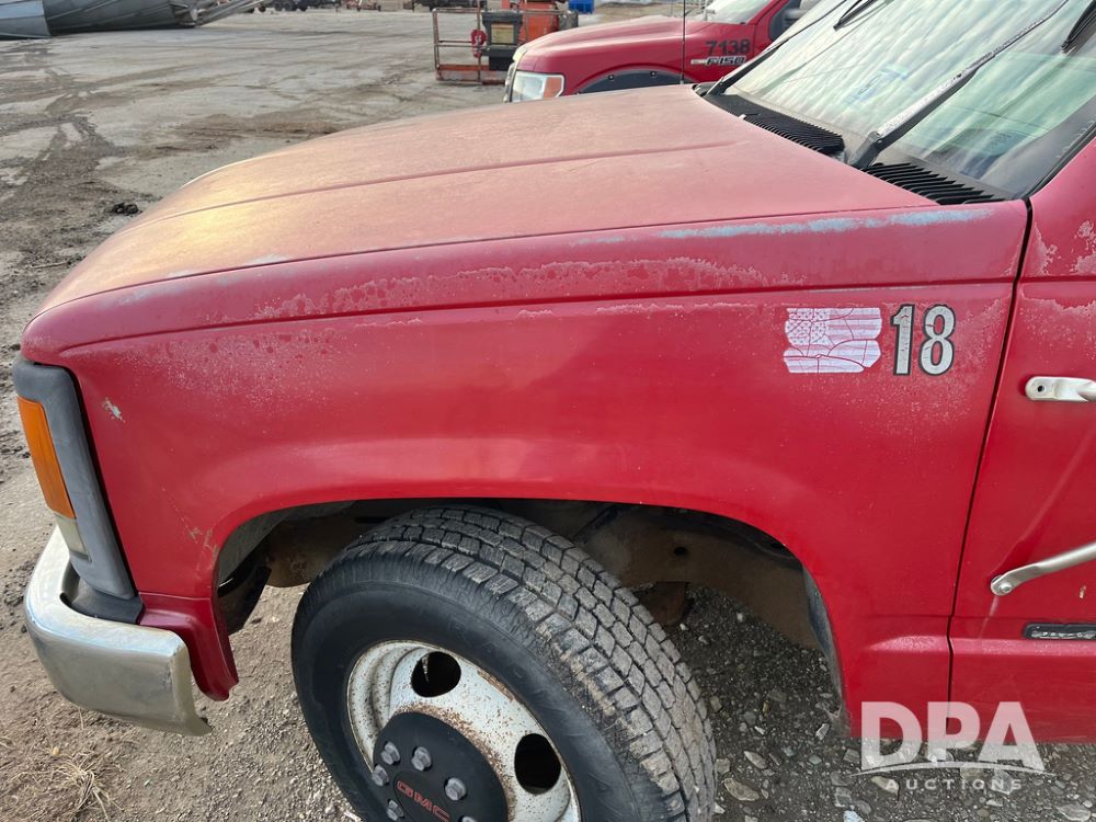1994 GMC 3500 4 Door Flatbed (JN3970, Unit 7121), gas engine, 3 speed transmission, heat, Am/Fm radio, dually, steel flatbed, wood sides, rear hitch, LT225/75R16 tires, shows 201,798 miles.