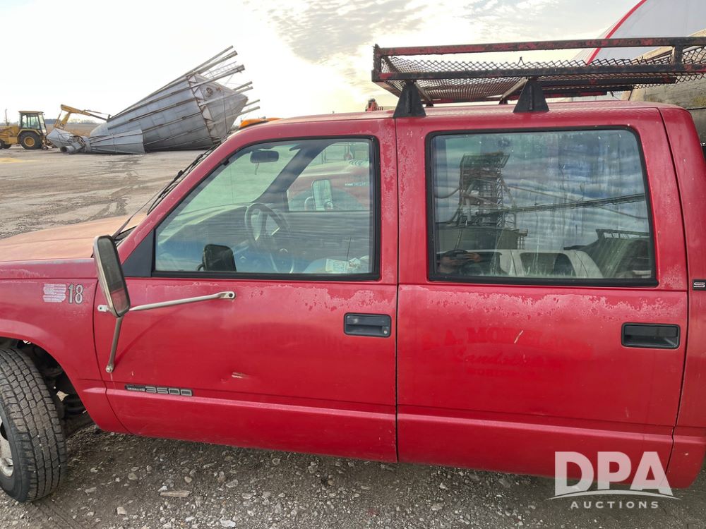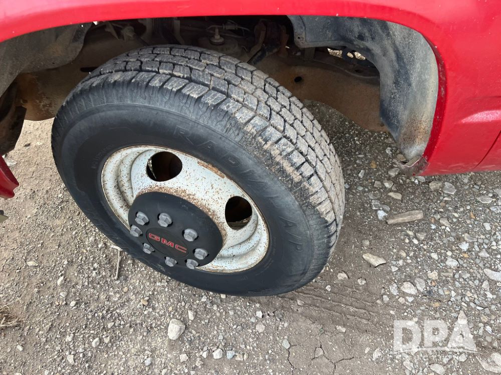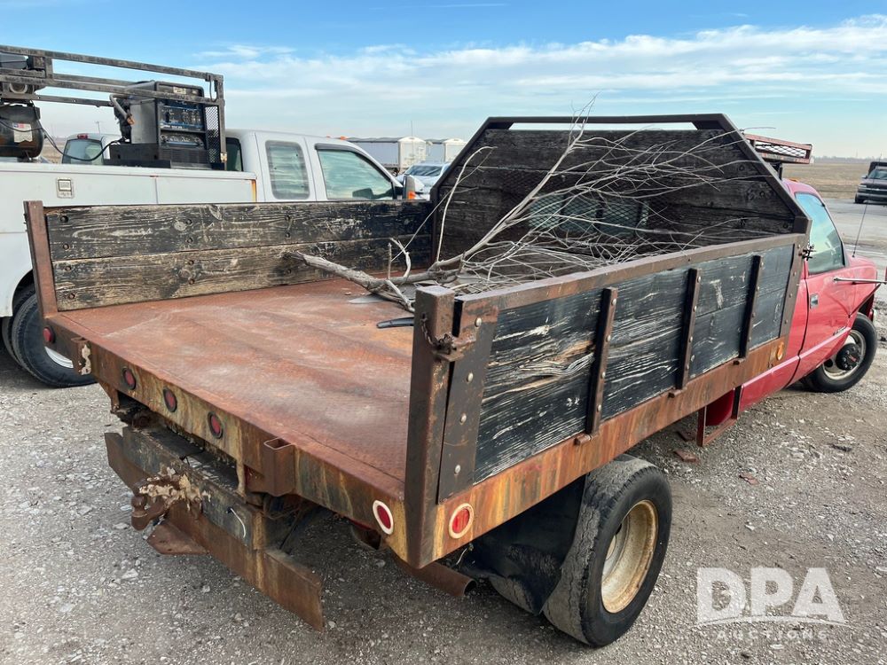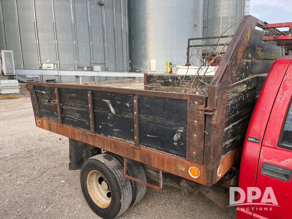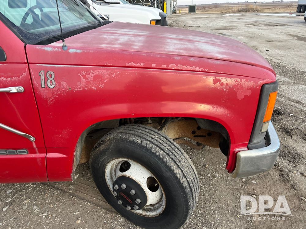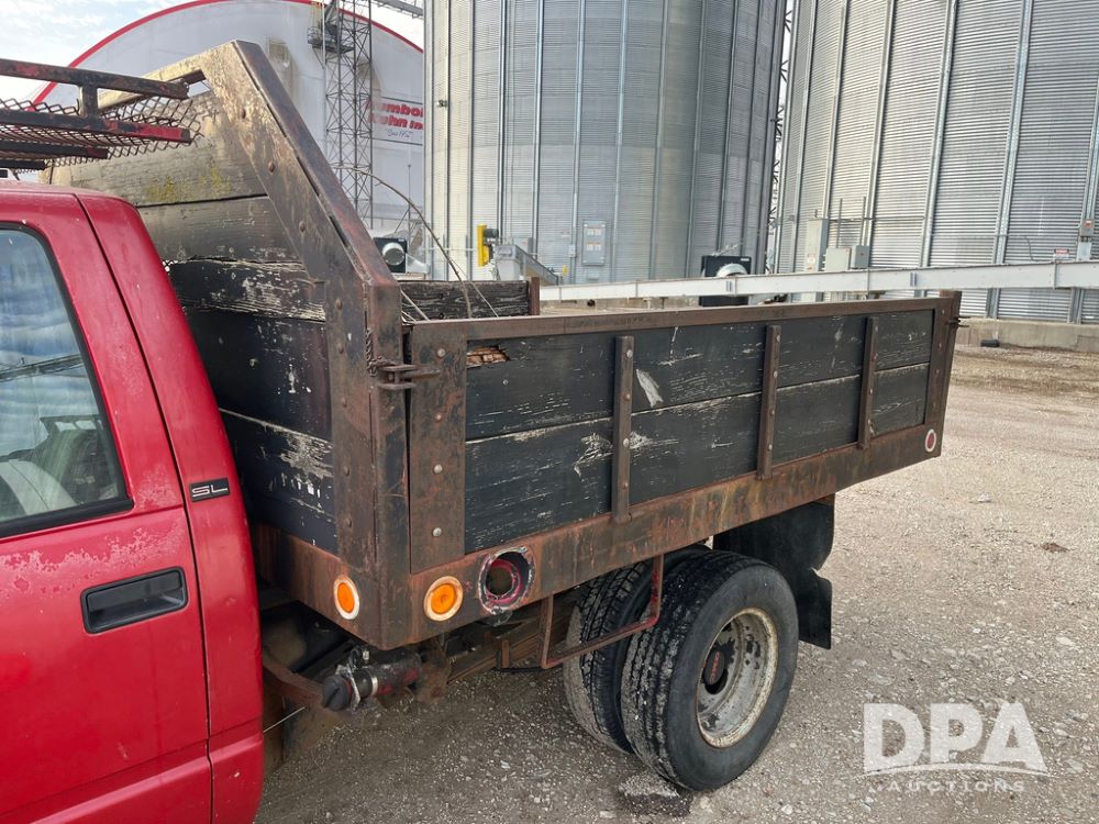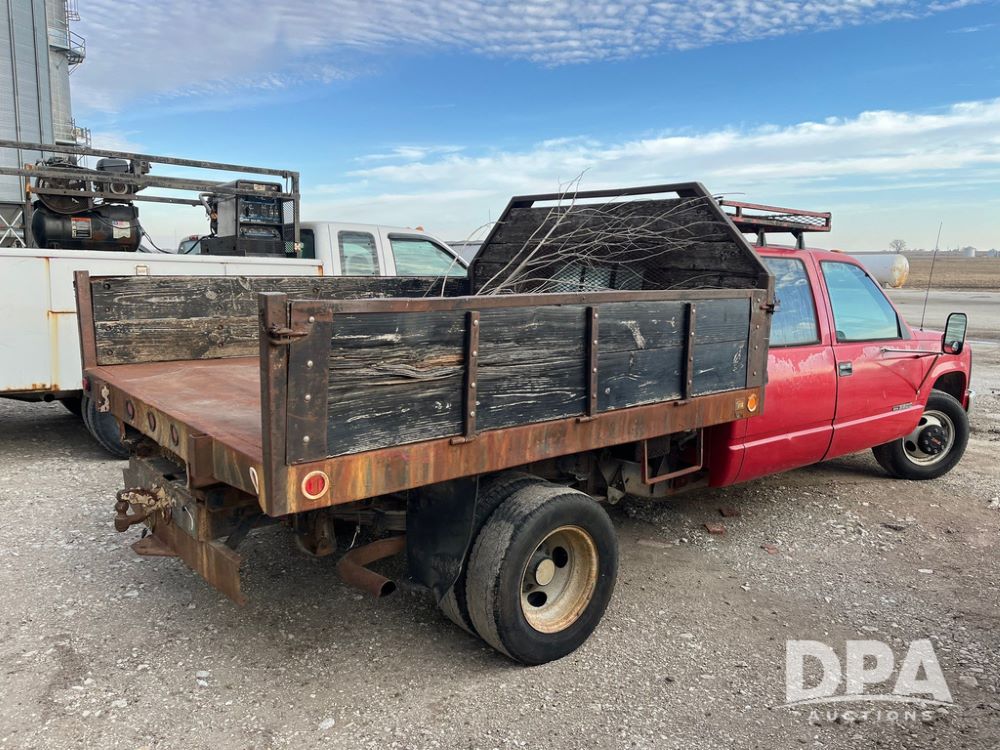 1994 GMC 3500 4 Door Flatbed (JN3970, Unit 7121), gas engine, 3 speed transmission, heat, Am/Fm radio, dually, steel flatbed, wood sides, rear hitch, LT225/75R16 tires, shows 201,798 miles.
