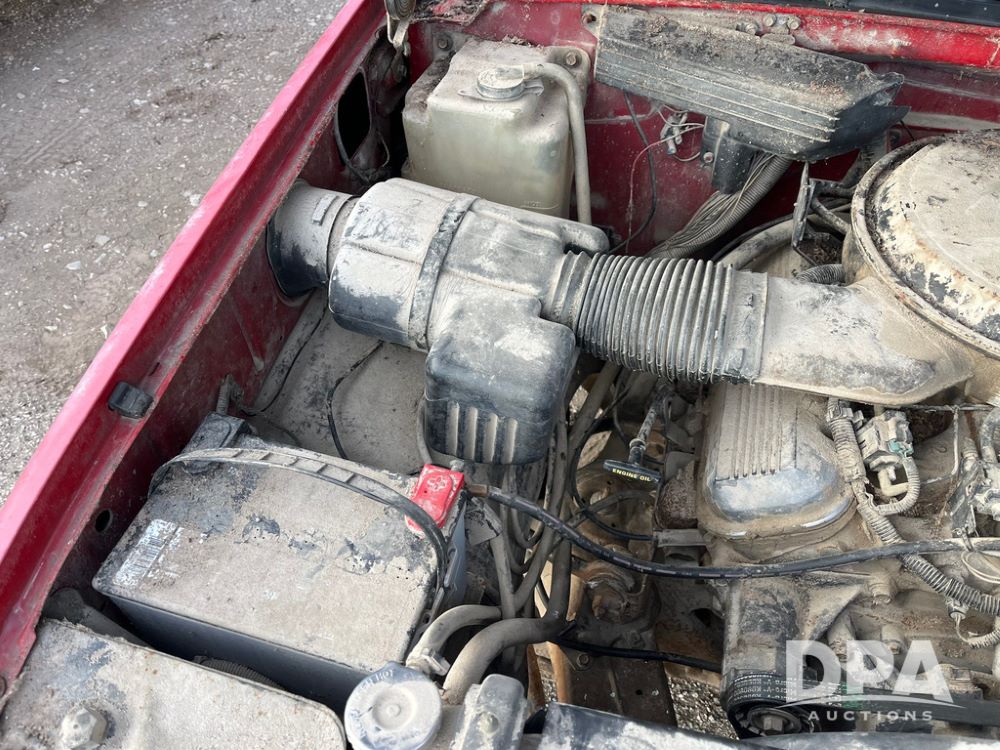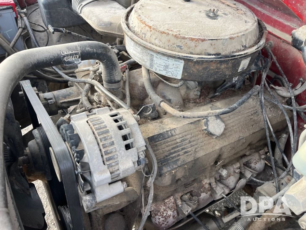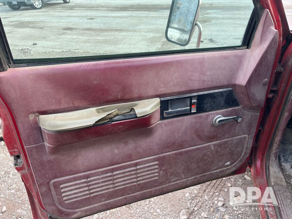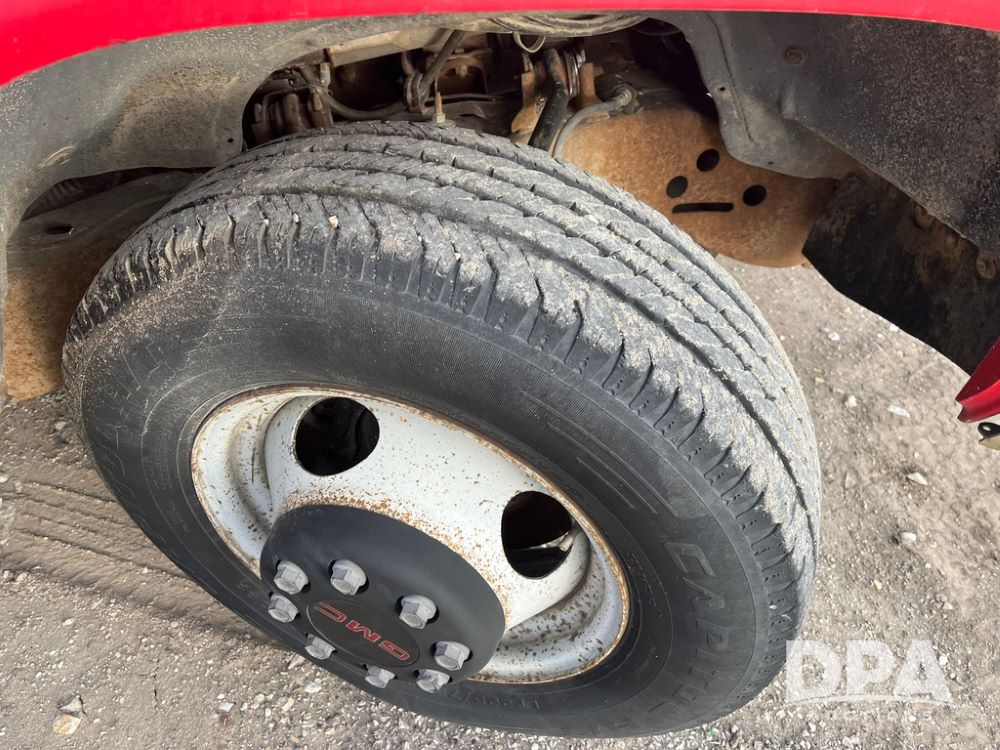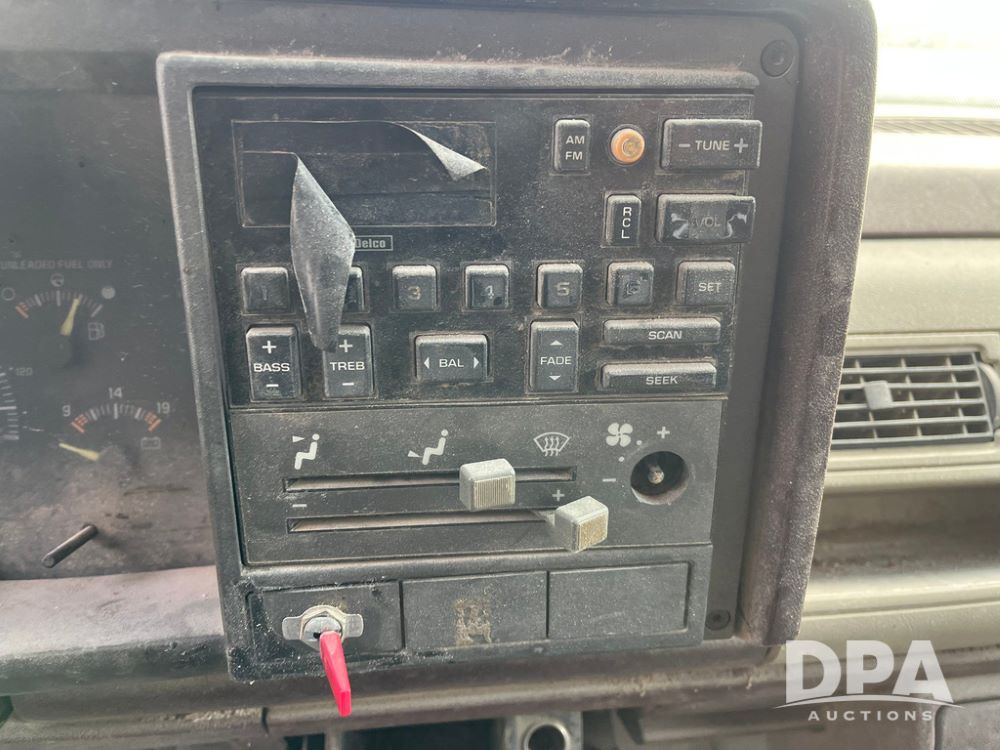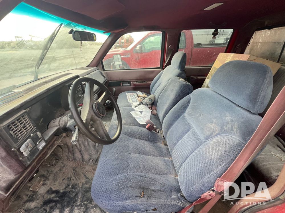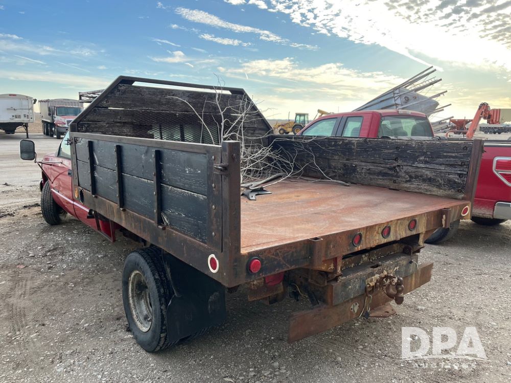 1994 GMC 3500 4 Door Flatbed (JN3970, Unit 7121), gas engine, 3 speed transmission, heat, Am/Fm radio, dually, steel flatbed, wood sides, rear hitch, LT225/75R16 tires, shows 201,798 miles.