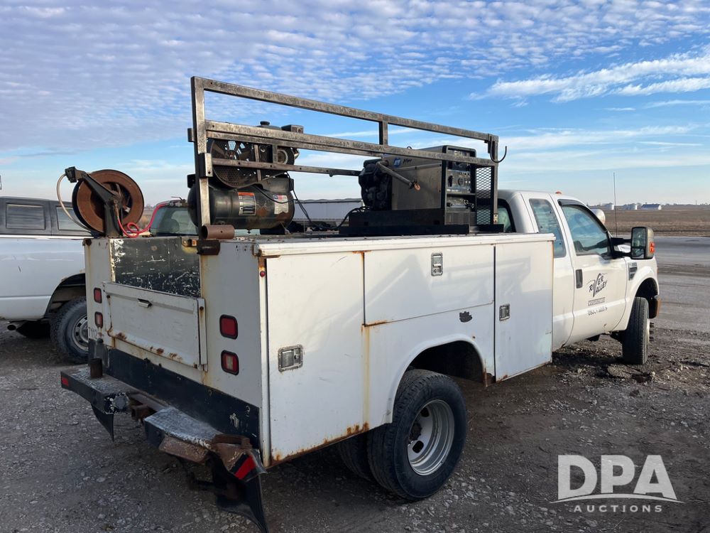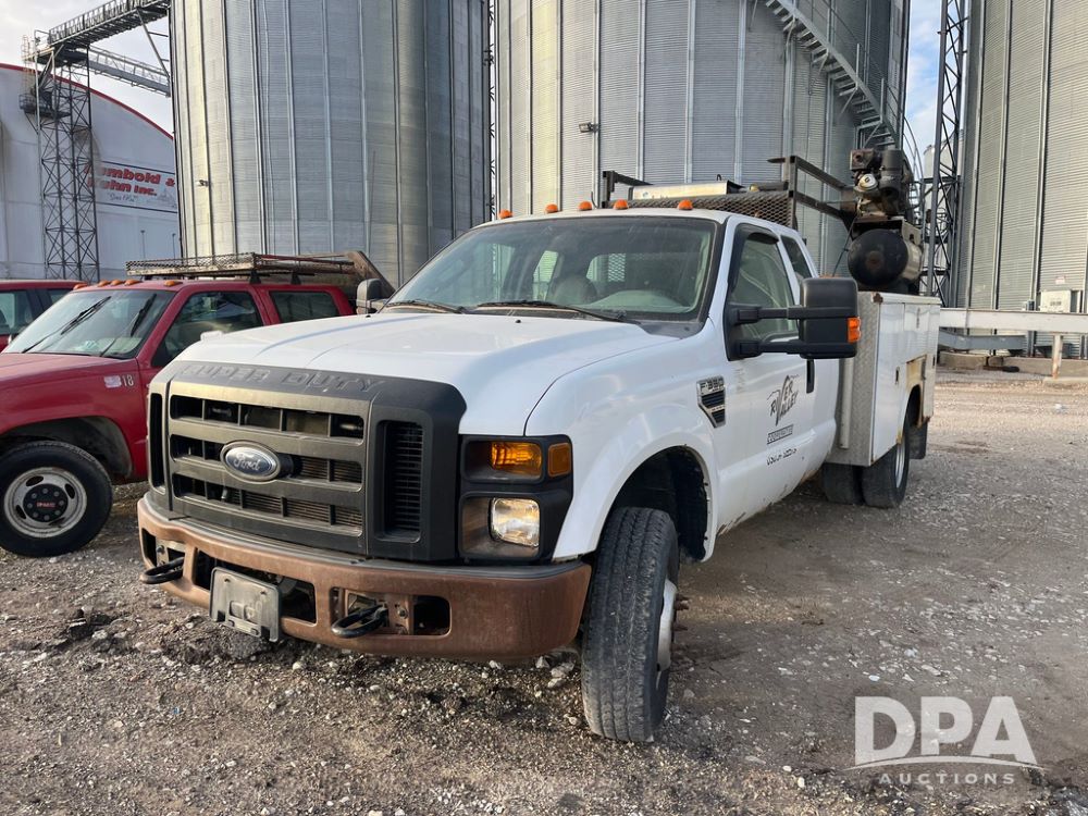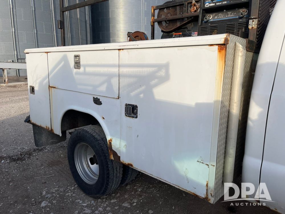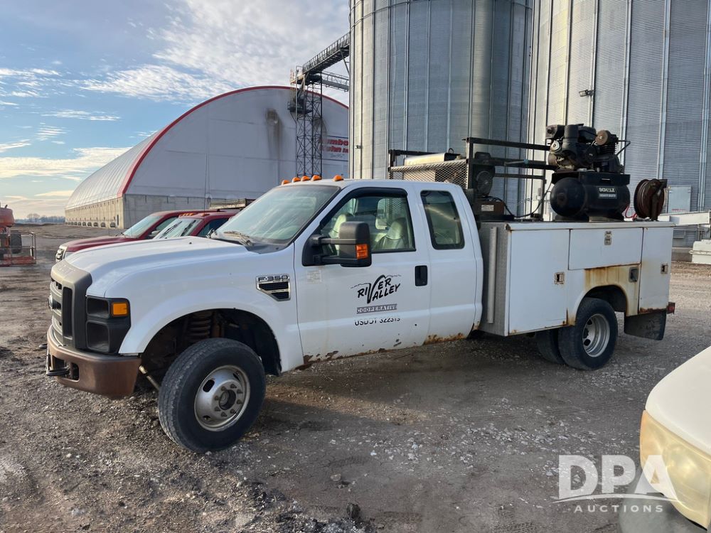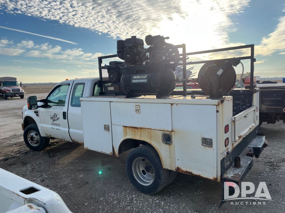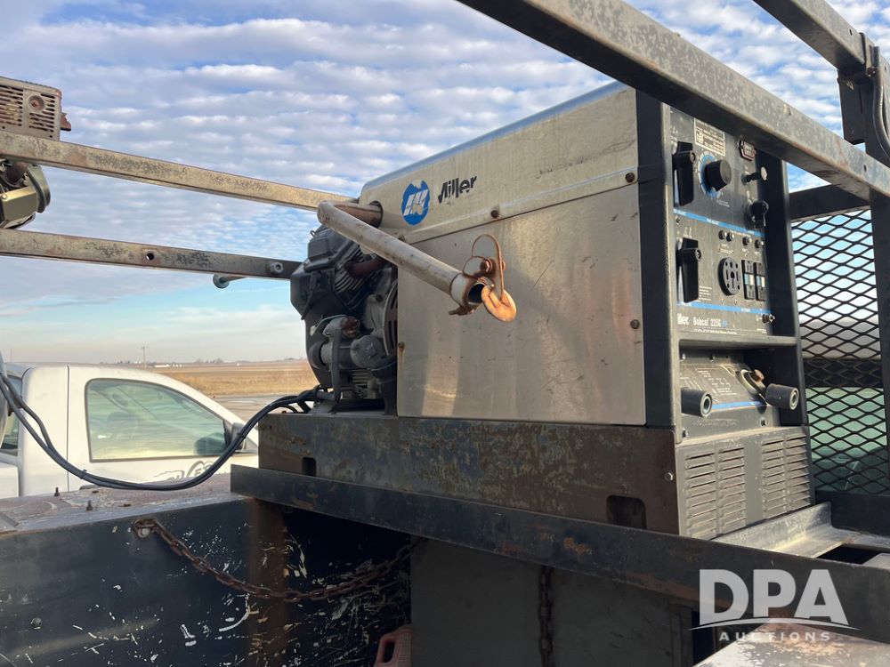 2008 Ford F350XL Super Duty Extended Cab Service Truck (JN3972, Unit 7112), 4x4, Triton 6.8L gas engine, 4 speed transmission with overdrive, air conditioning, heat, Am/Fm radio, cruise control, power windows & locks, dually, Reading service body, Miller Bobcat 225G generator/welder, Schultz heavy duty 30 gallon air compressor, LT245/75R17 tires, shows 237,445 miles.