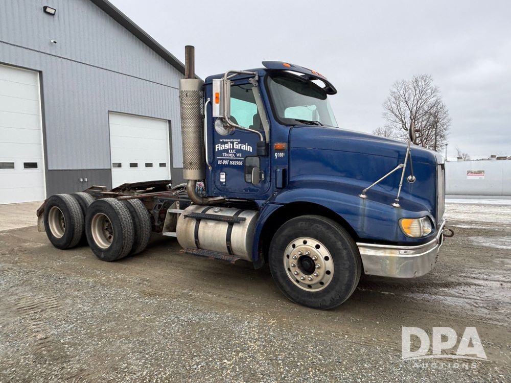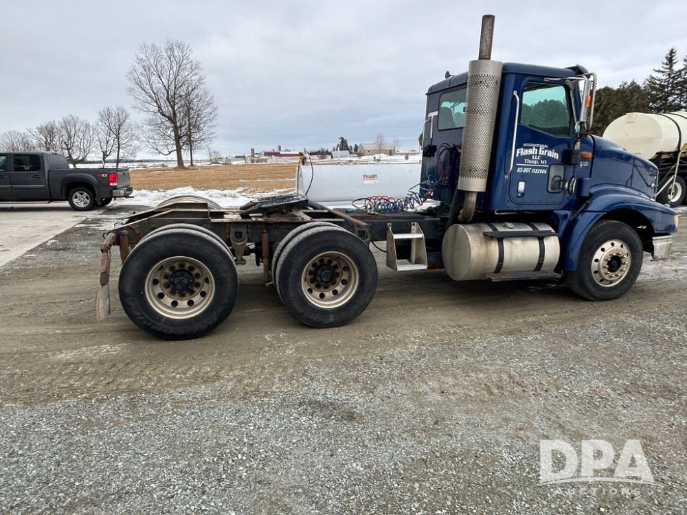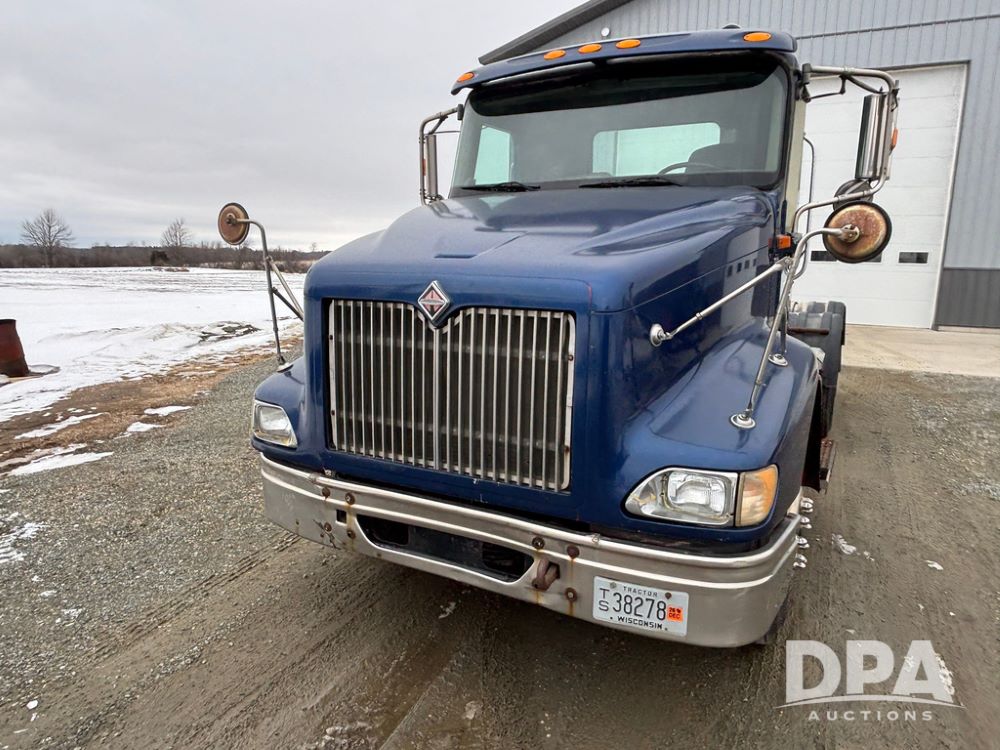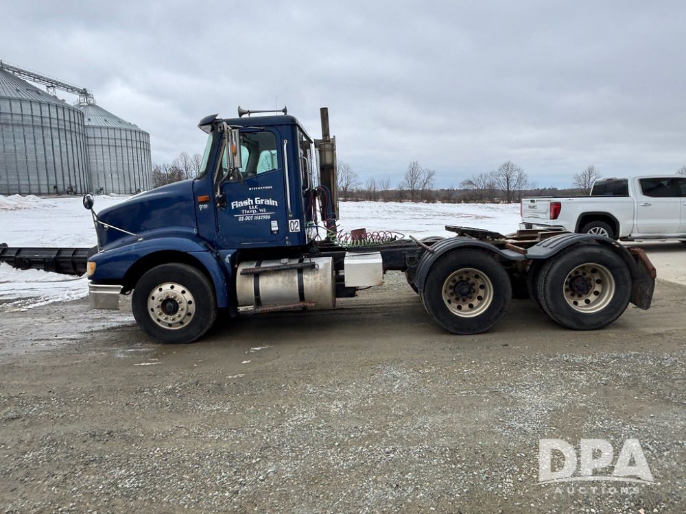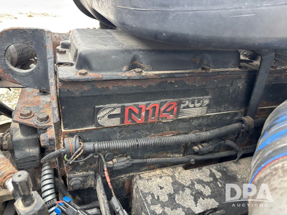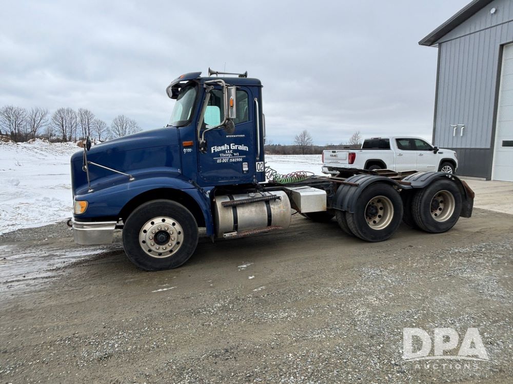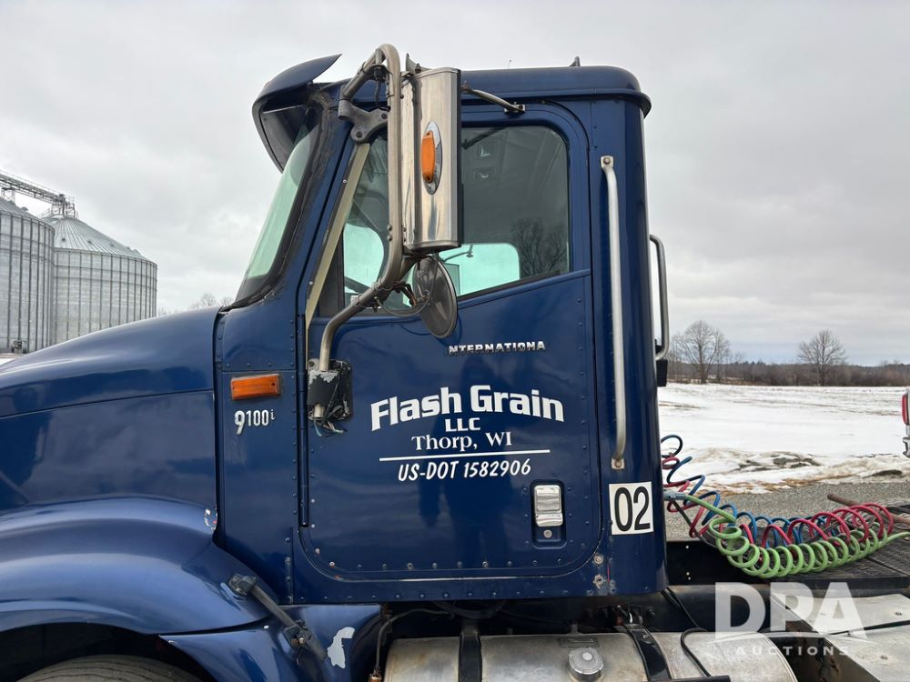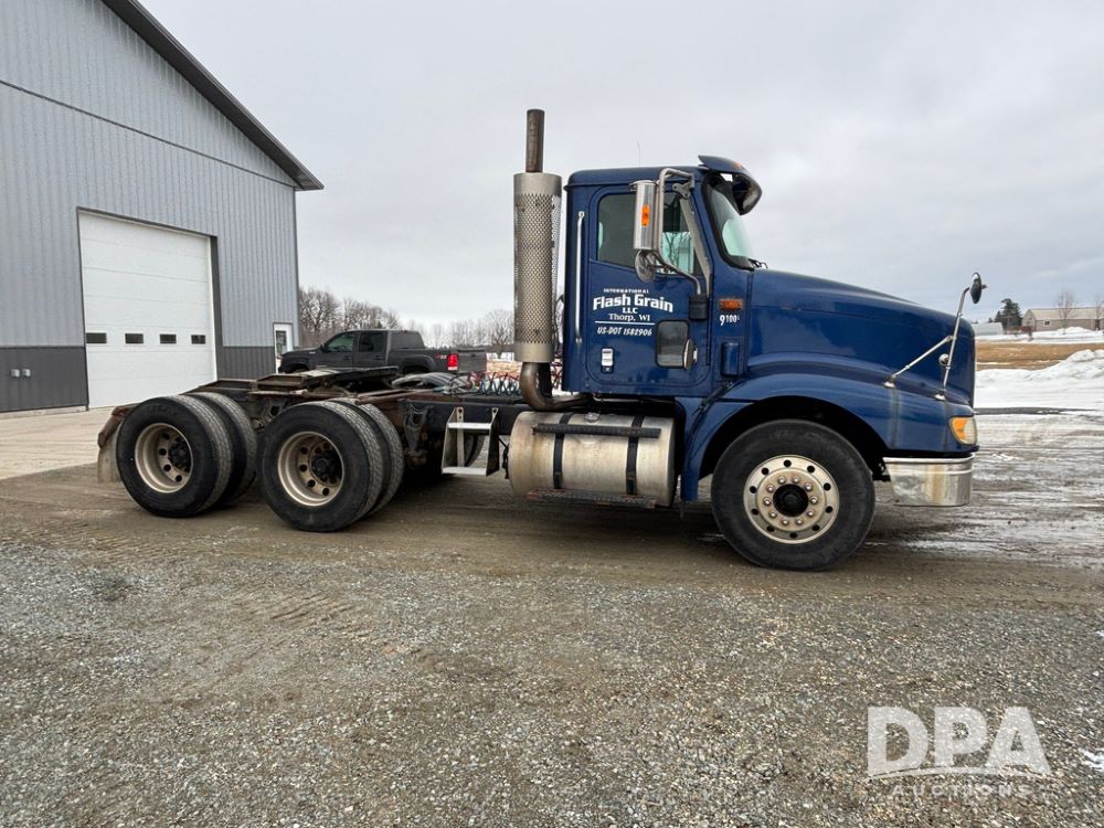 2002 International 9100i Day Cab Truck (GP12724), Cummins N14 Plus diesel engine, Eaton automatic transmission, heat, Am/Fm radio, cruise control, tandem axle, air ride suspension, 5th wheel plate, dual fuel tanks, single exhaust, 11R22.5 tires, GVWR 52,000 pounds, shows 350,731 miles.