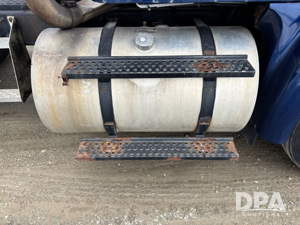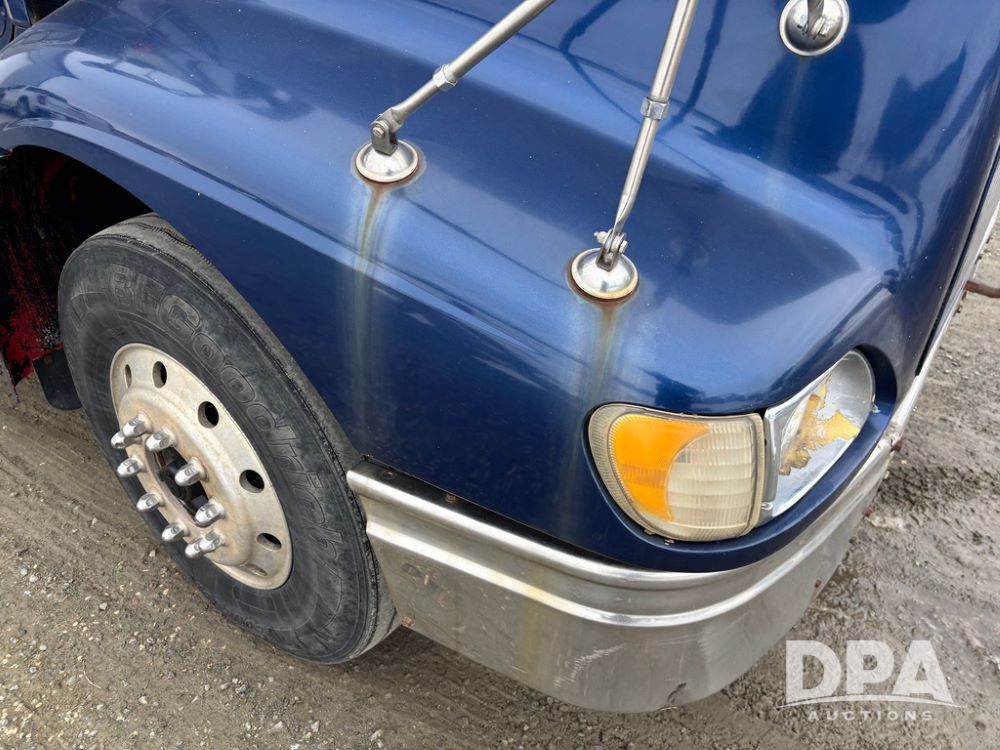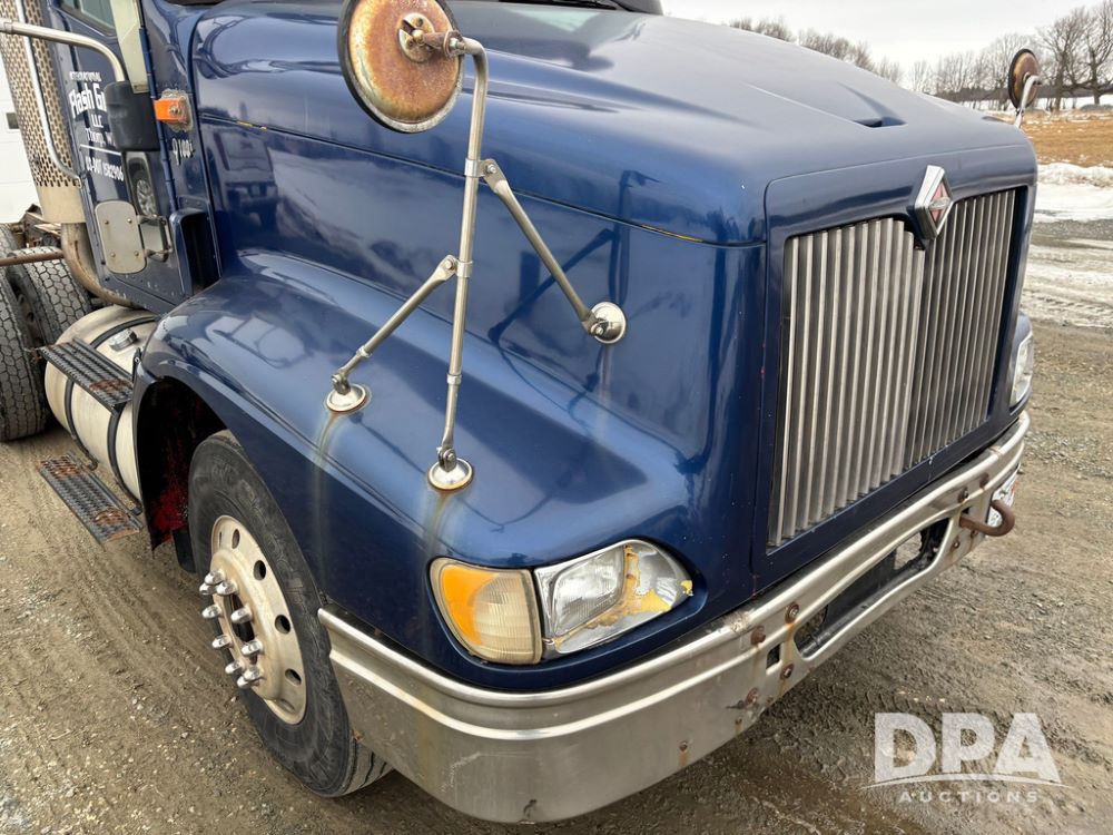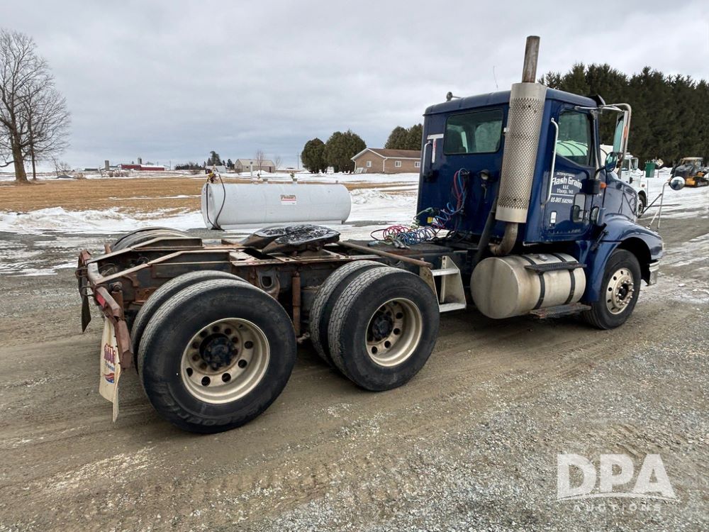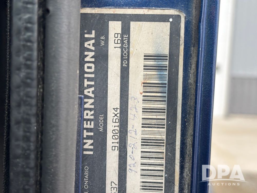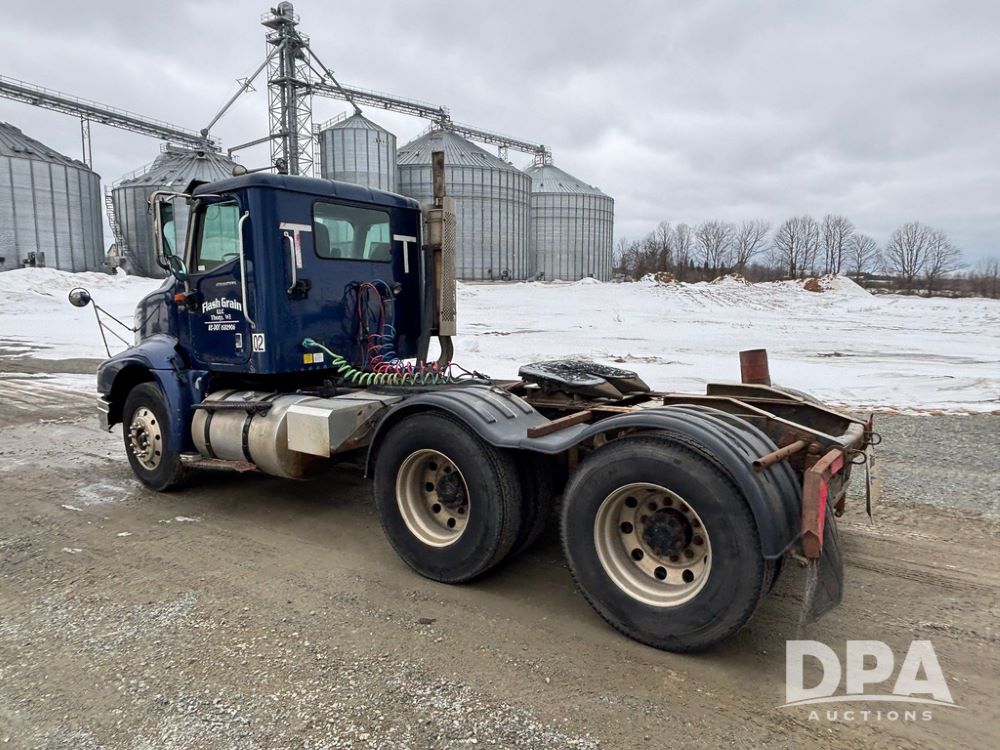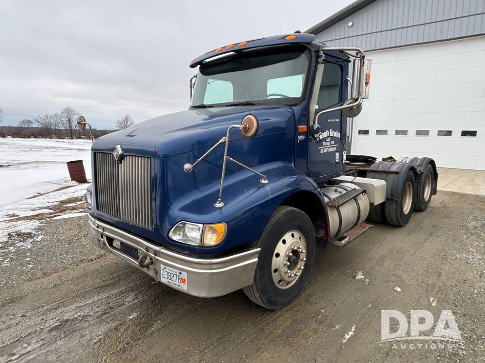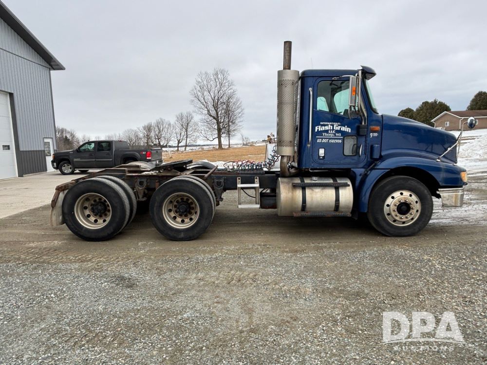 2002 International 9100i Day Cab Truck (GP12724), Cummins N14 Plus diesel engine, Eaton automatic transmission, heat, Am/Fm radio, cruise control, tandem axle, air ride suspension, 5th wheel plate, dual fuel tanks, single exhaust, 11R22.5 tires, GVWR 52,000 pounds, shows 350,731 miles.