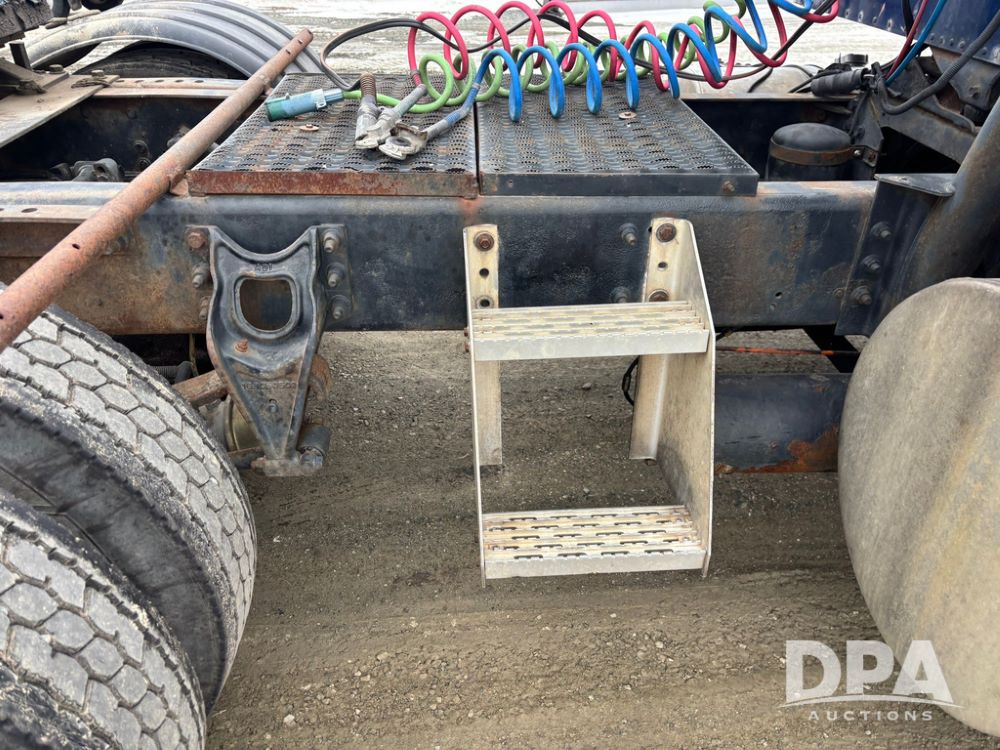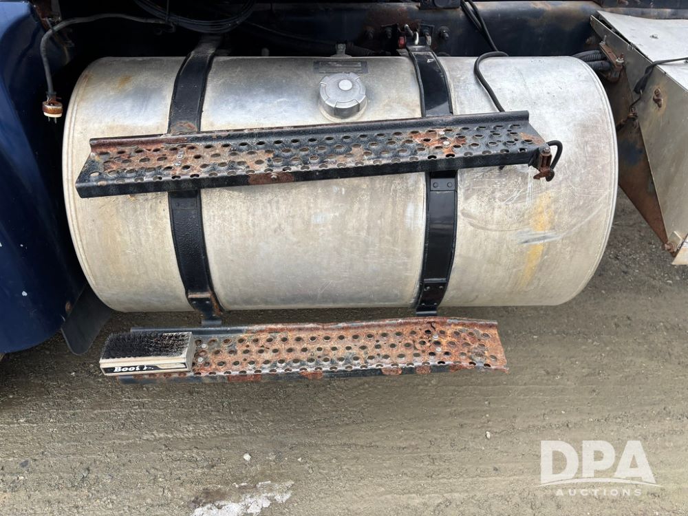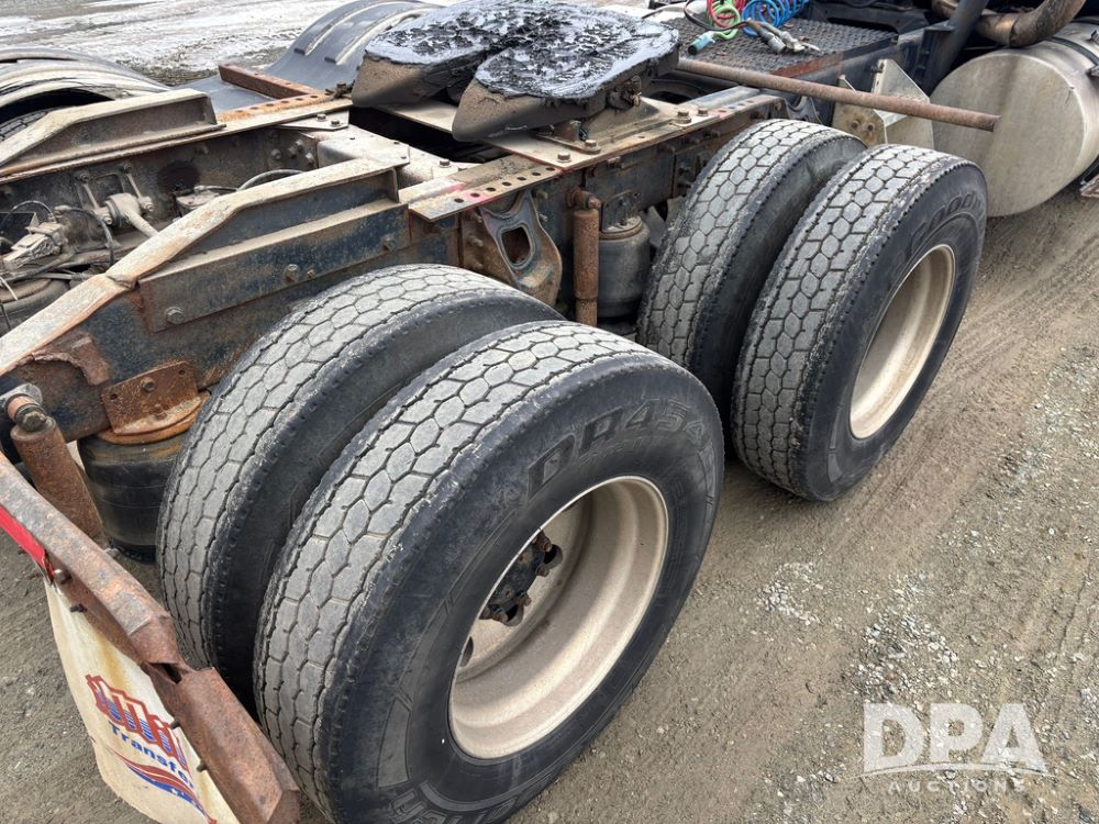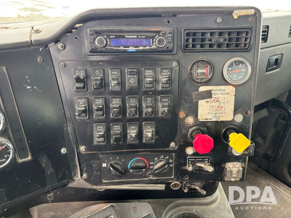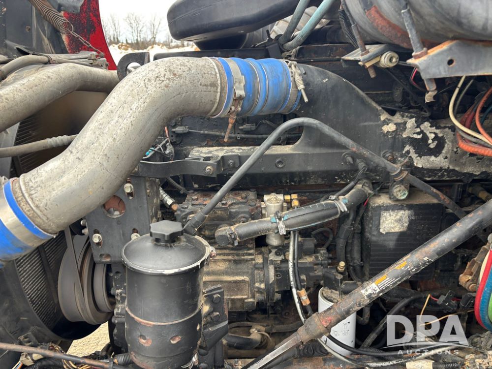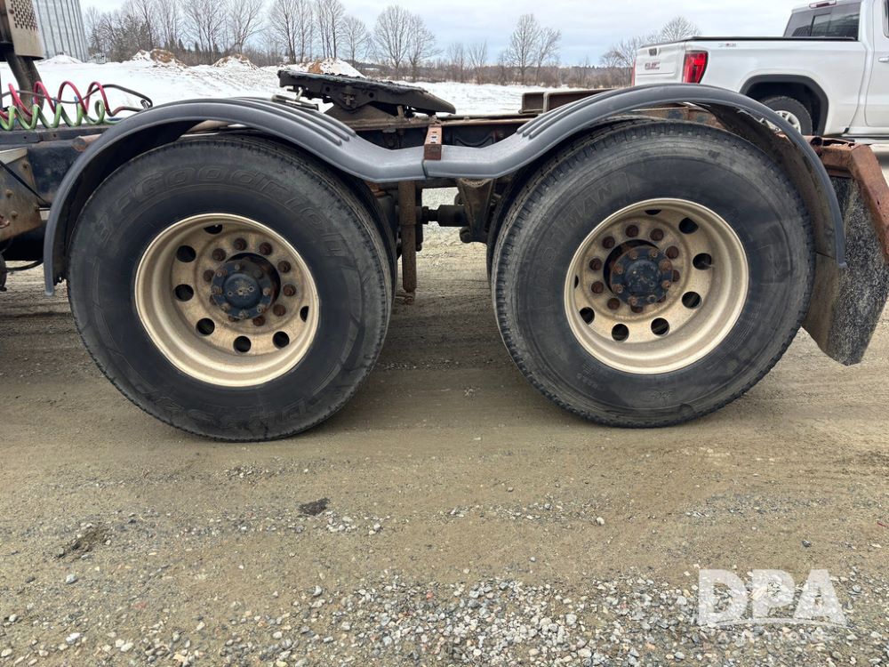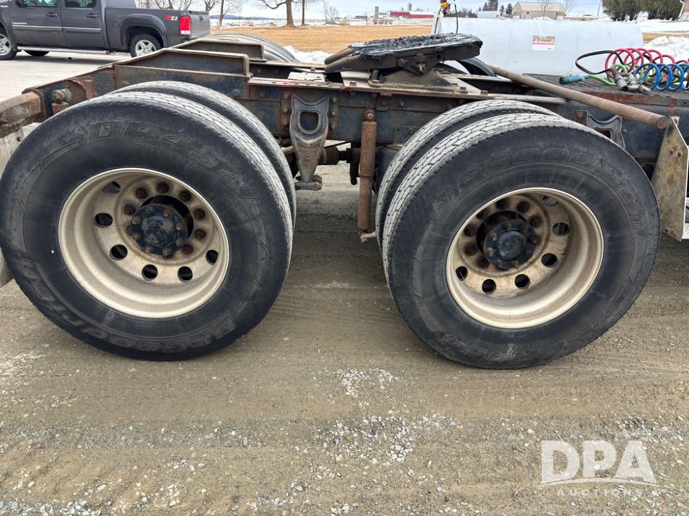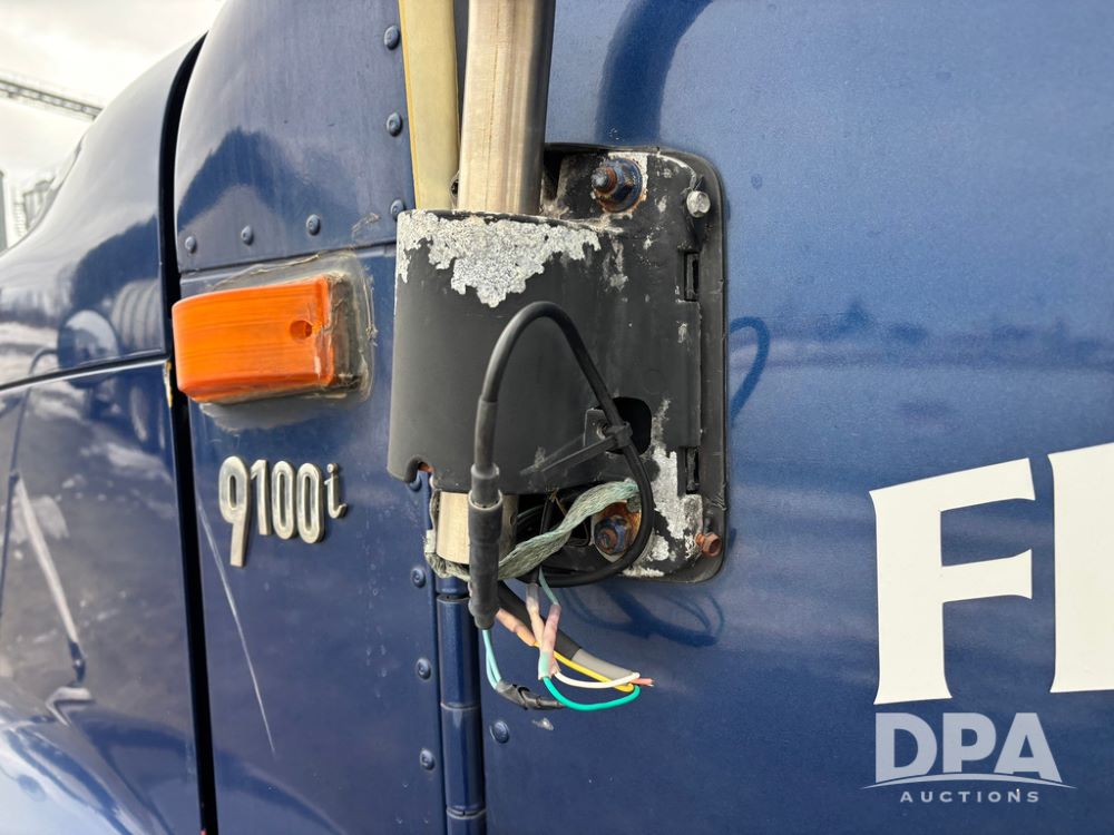 2002 International 9100i Day Cab Truck (GP12724), Cummins N14 Plus diesel engine, Eaton automatic transmission, heat, Am/Fm radio, cruise control, tandem axle, air ride suspension, 5th wheel plate, dual fuel tanks, single exhaust, 11R22.5 tires, GVWR 52,000 pounds, shows 350,731 miles.