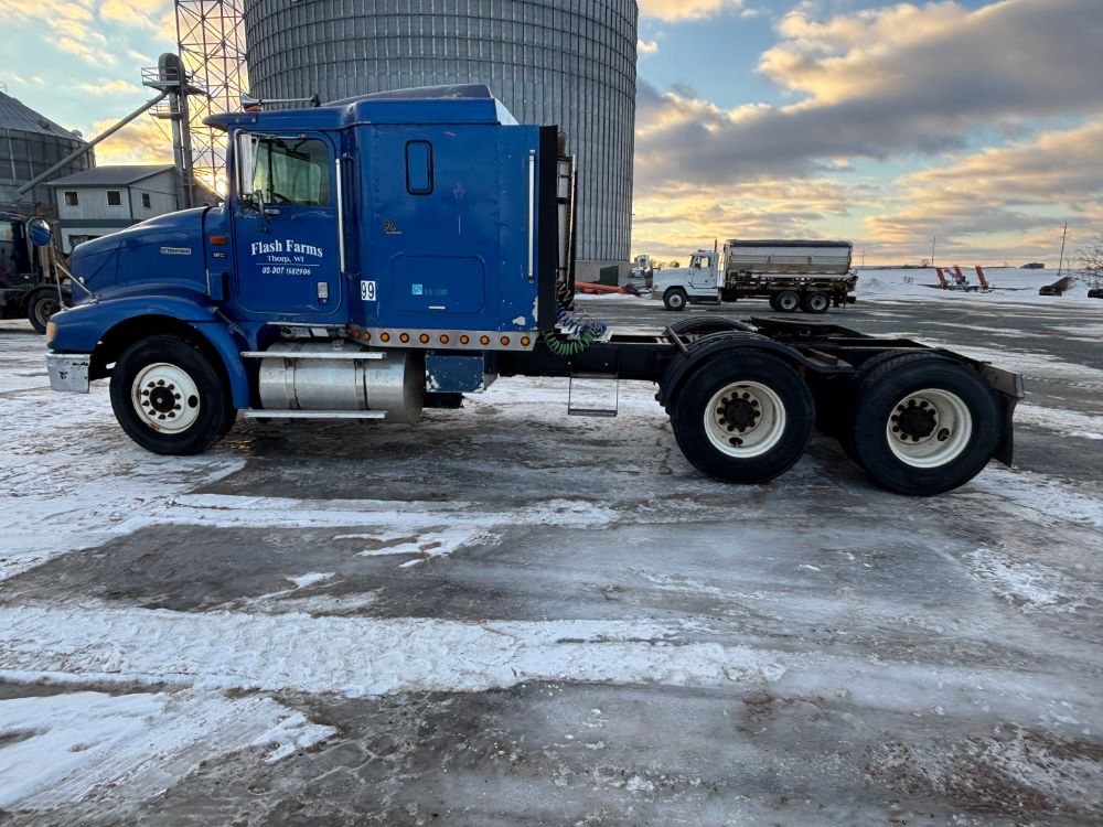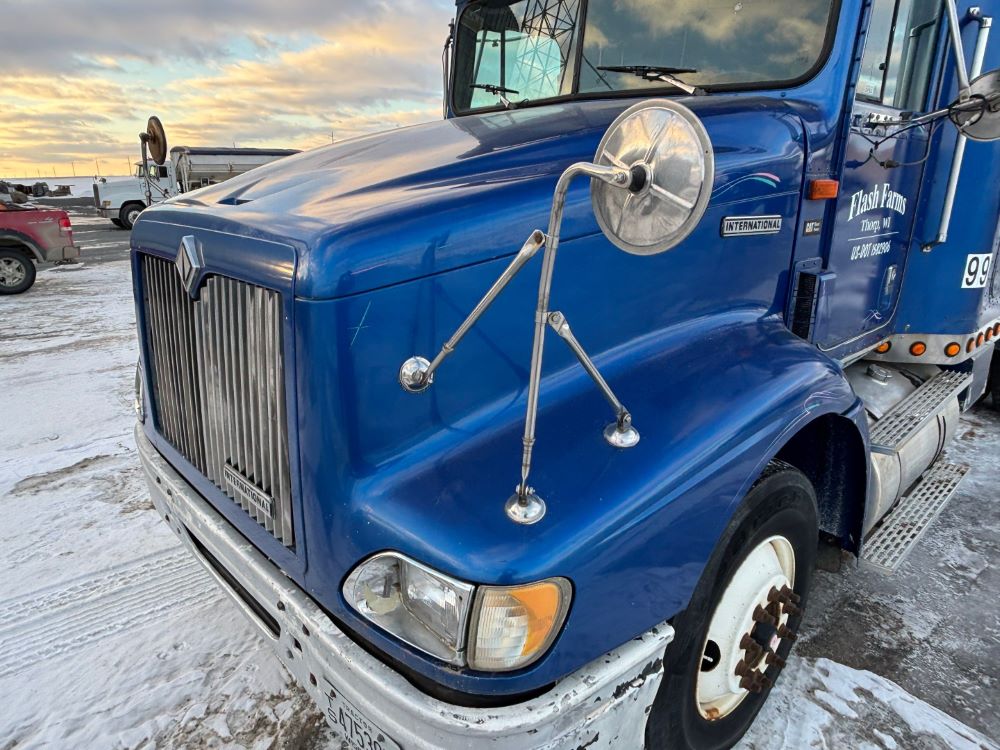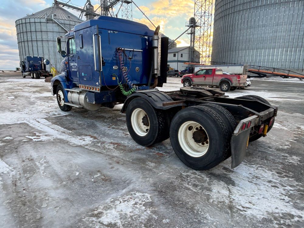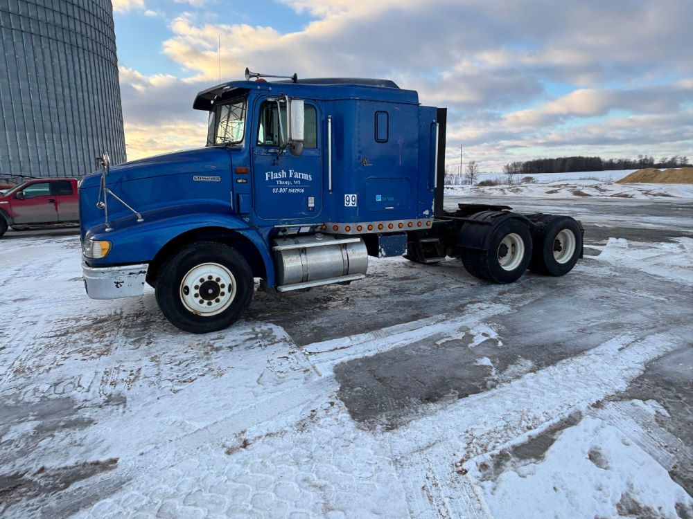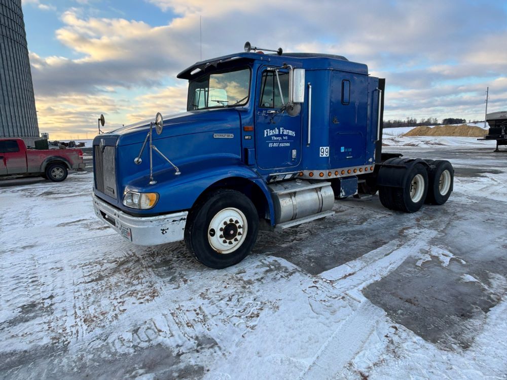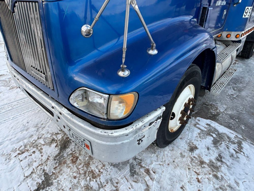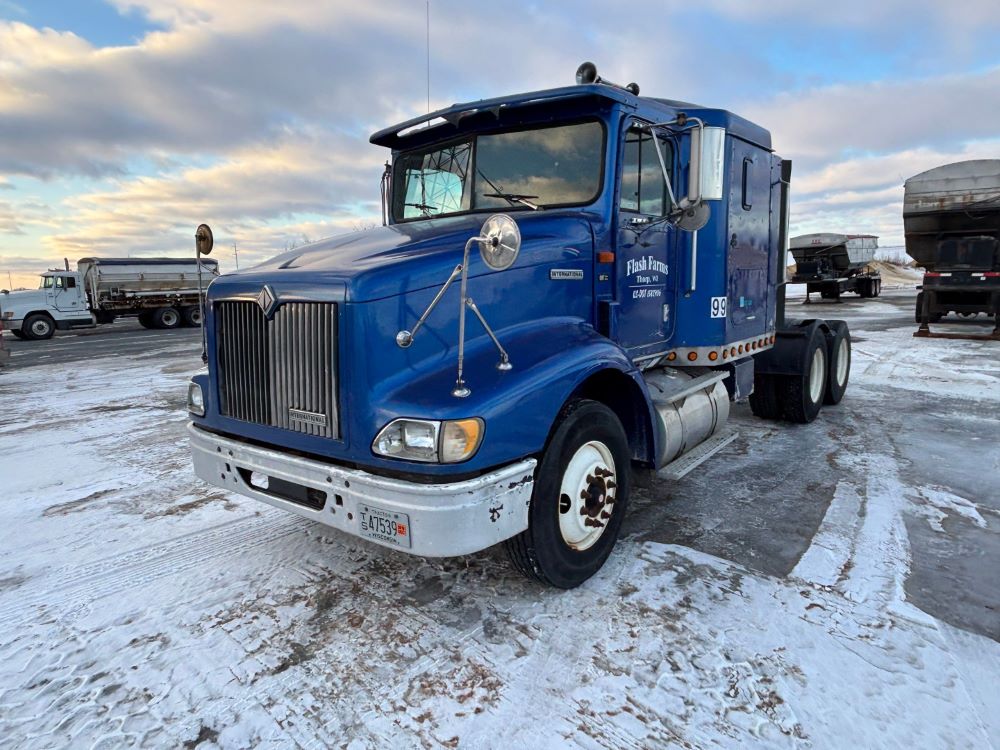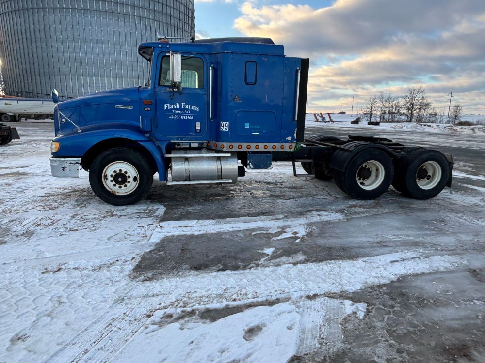1999 International 9200 Truck (GP12736, Unit 99), Cat C-12 diesel engine, Eaton Fuller 13 speed transmission, heat, Am/Fm radio, Pro Sleeper, cruise control, tandem axle, air ride suspension, 5th wheel plate, dual fuel tanks, single exhaust, 11R22.5 tires, engine heater, GVWR 52,000 pounds, shows 978,850 miles.