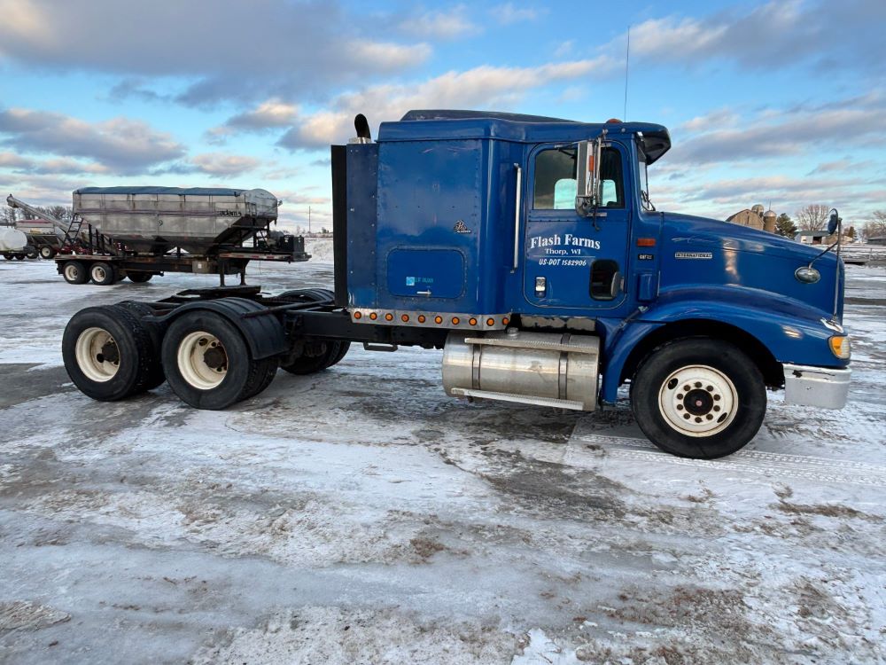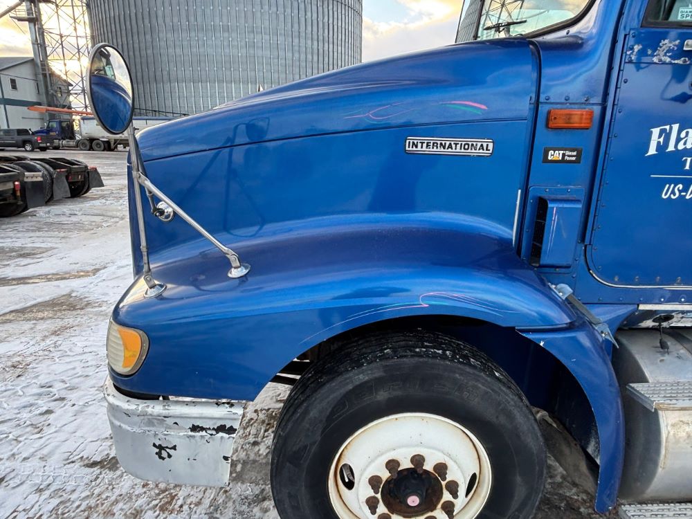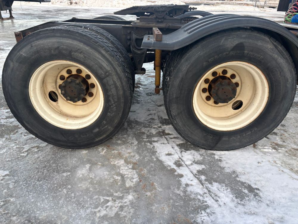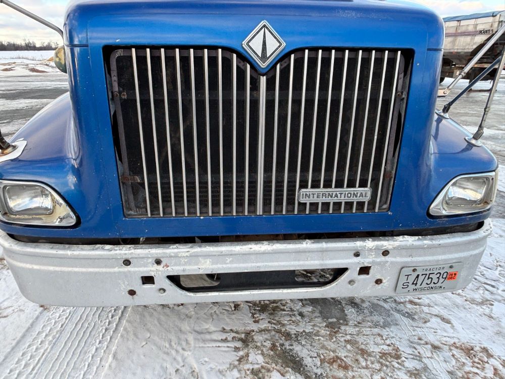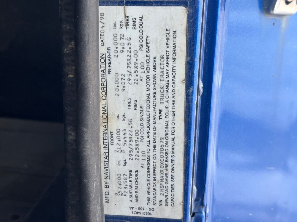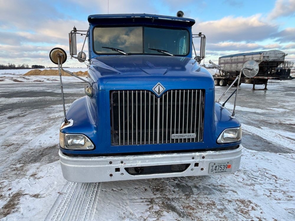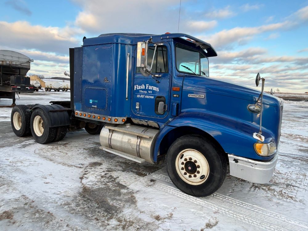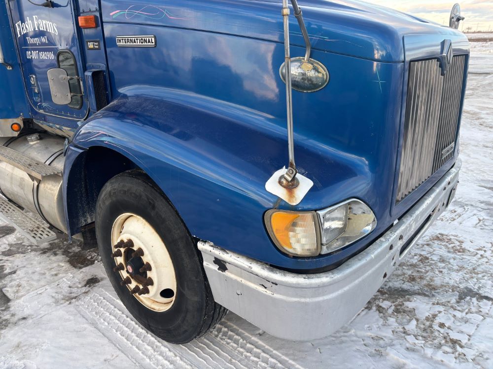 1999 International 9200 Truck (GP12736, Unit 99), Cat C-12 diesel engine, Eaton Fuller 13 speed transmission, heat, Am/Fm radio, Pro Sleeper, cruise control, tandem axle, air ride suspension, 5th wheel plate, dual fuel tanks, single exhaust, 11R22.5 tires, engine heater, GVWR 52,000 pounds, shows 978,850 miles.