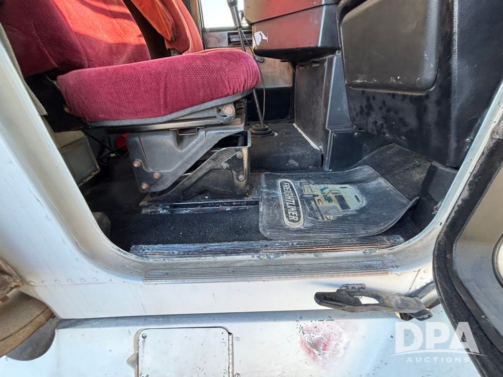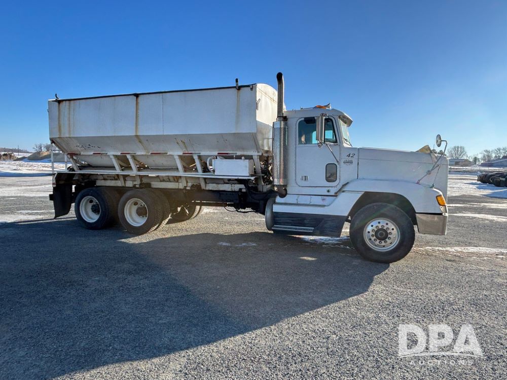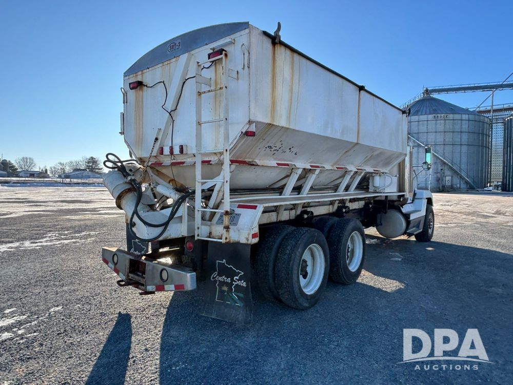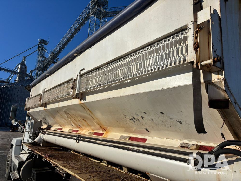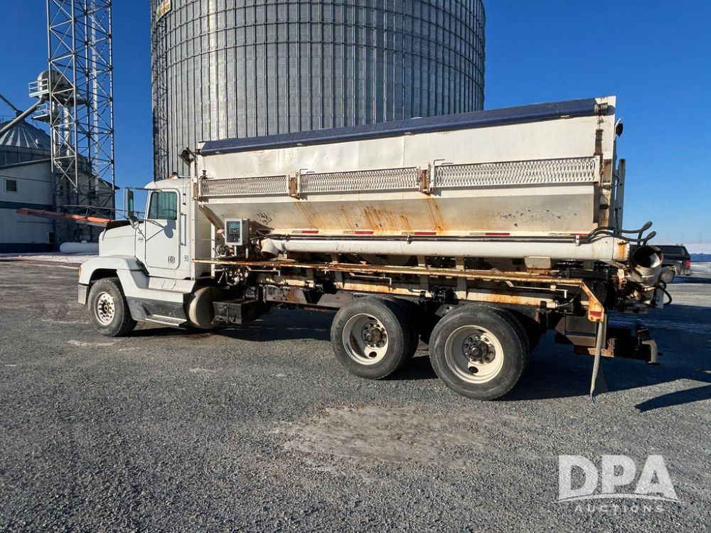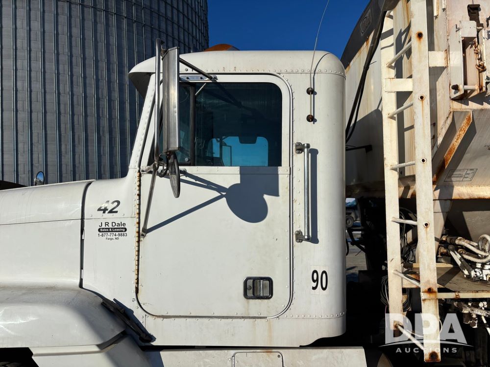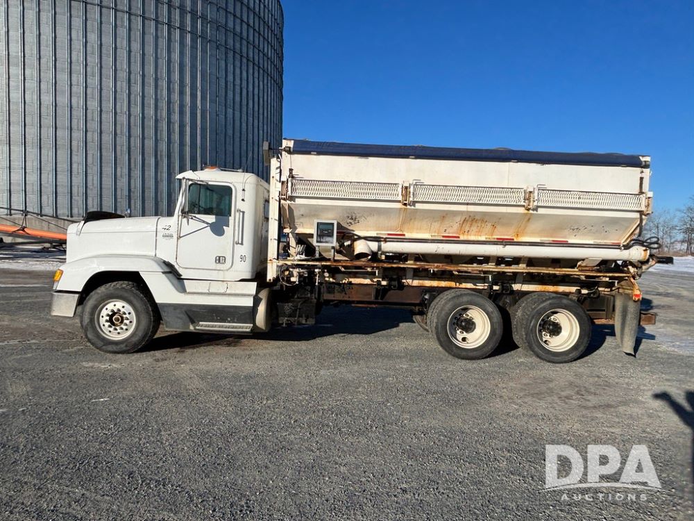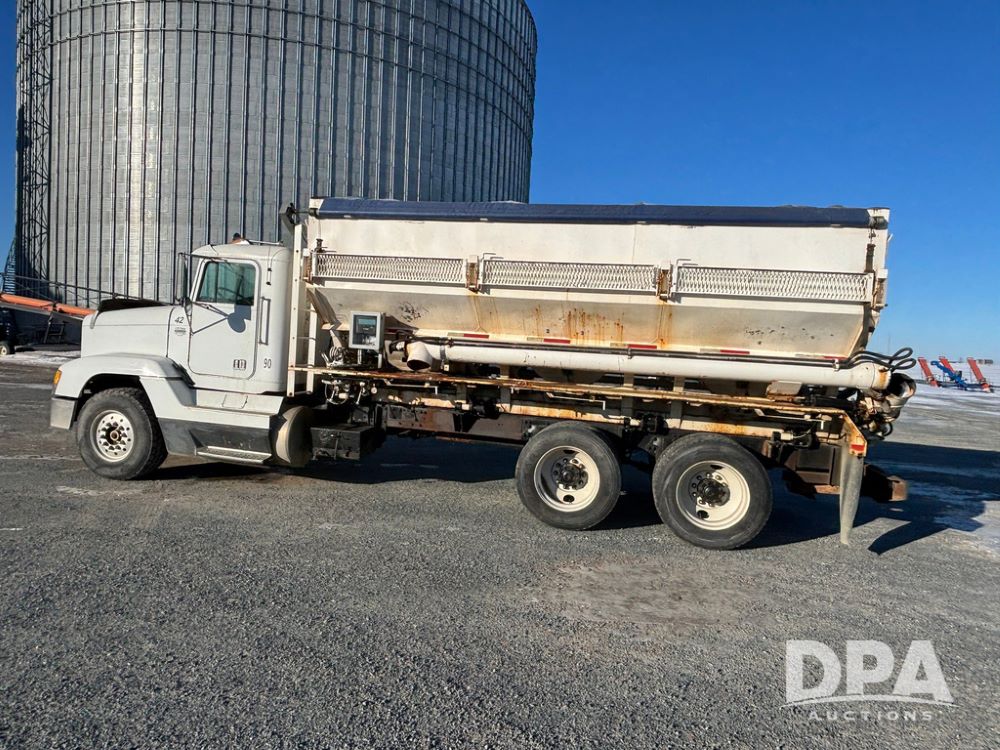 1990 Freightliner Dry Tender Truck (GP12734, Unit 90), Cat diesel engine, Eaton Fuller Roadranger 9 speed transmission, heat, Am/Fm radio, air ride cab, tandem axle, air ride suspension, 18 ton dry tender box, side discharge auger, hydraulic, electric roll tarp, Scale Tec digital scale, 385/65R22.5 front tires, 285/75R24.5 rear tires, shows 975,490 miles.