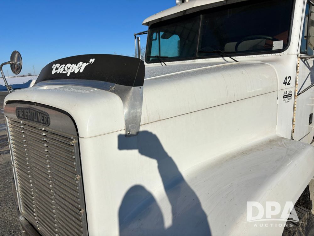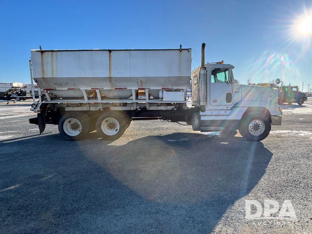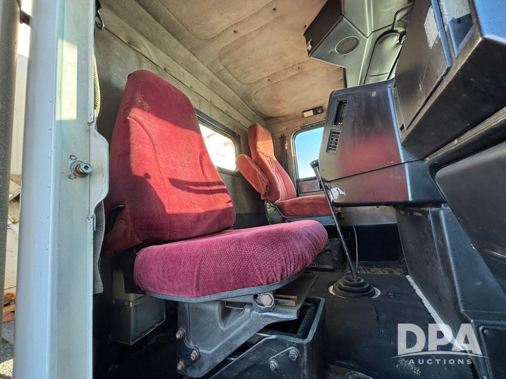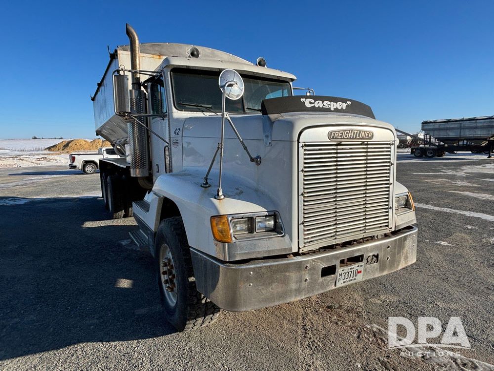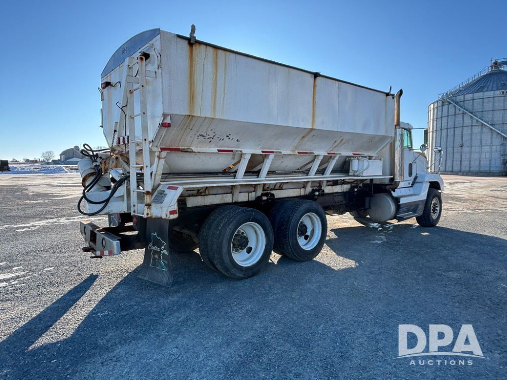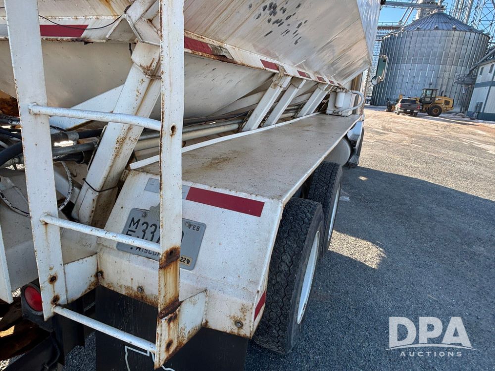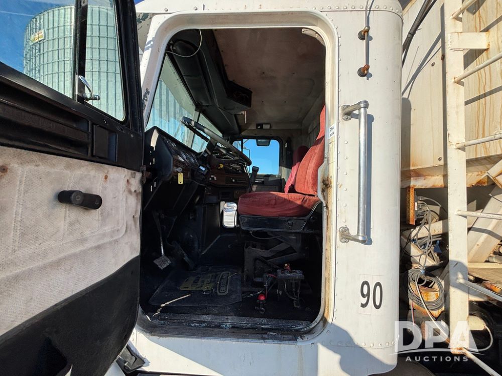 1990 Freightliner Dry Tender Truck (GP12734, Unit 90), Cat diesel engine, Eaton Fuller Roadranger 9 speed transmission, heat, Am/Fm radio, air ride cab, tandem axle, air ride suspension, 18 ton dry tender box, side discharge auger, hydraulic, electric roll tarp, Scale Tec digital scale, 385/65R22.5 front tires, 285/75R24.5 rear tires, shows 975,490 miles.