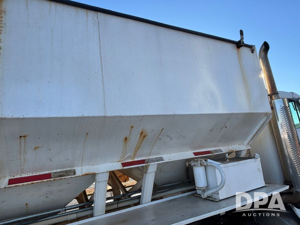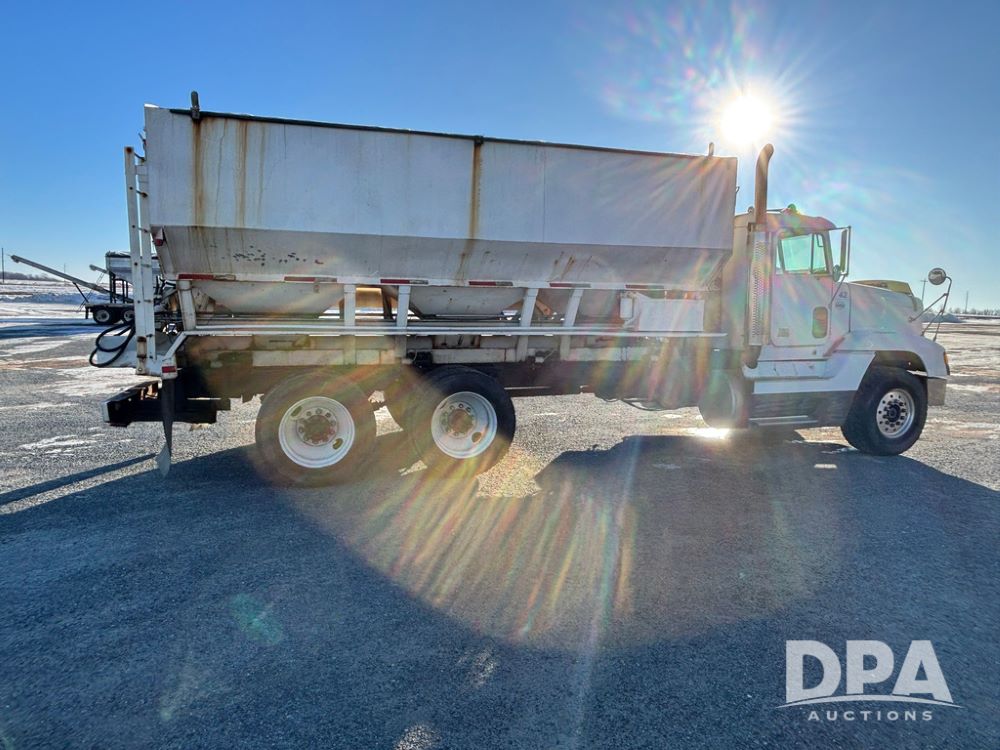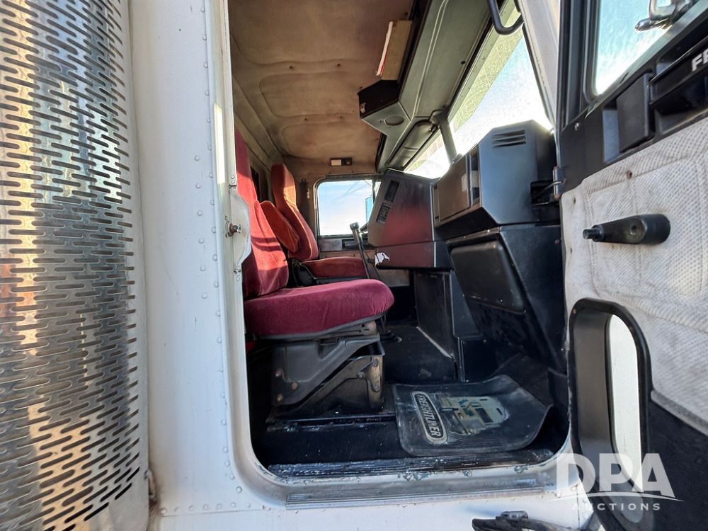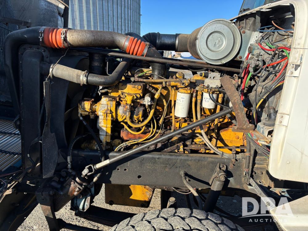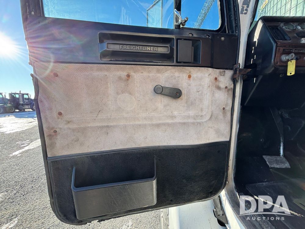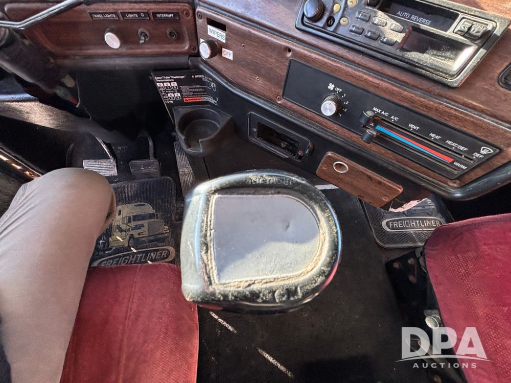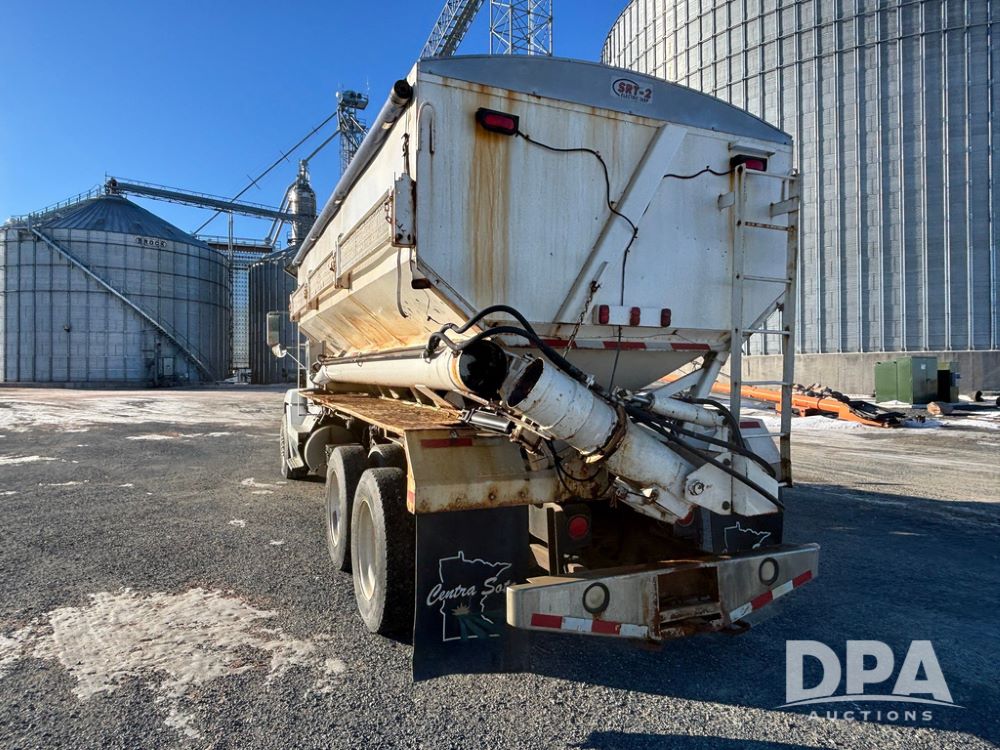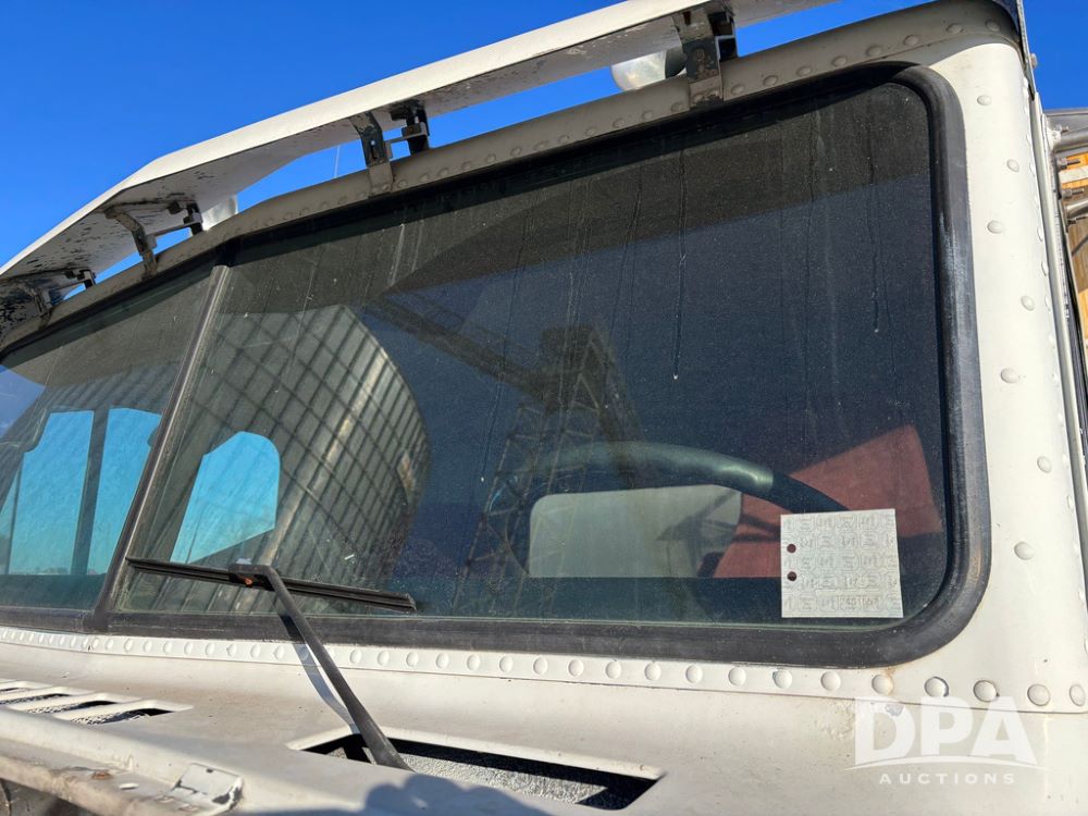 1990 Freightliner Dry Tender Truck (GP12734, Unit 90), Cat diesel engine, Eaton Fuller Roadranger 9 speed transmission, heat, Am/Fm radio, air ride cab, tandem axle, air ride suspension, 18 ton dry tender box, side discharge auger, hydraulic, electric roll tarp, Scale Tec digital scale, 385/65R22.5 front tires, 285/75R24.5 rear tires, shows 975,490 miles.