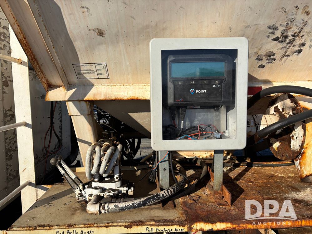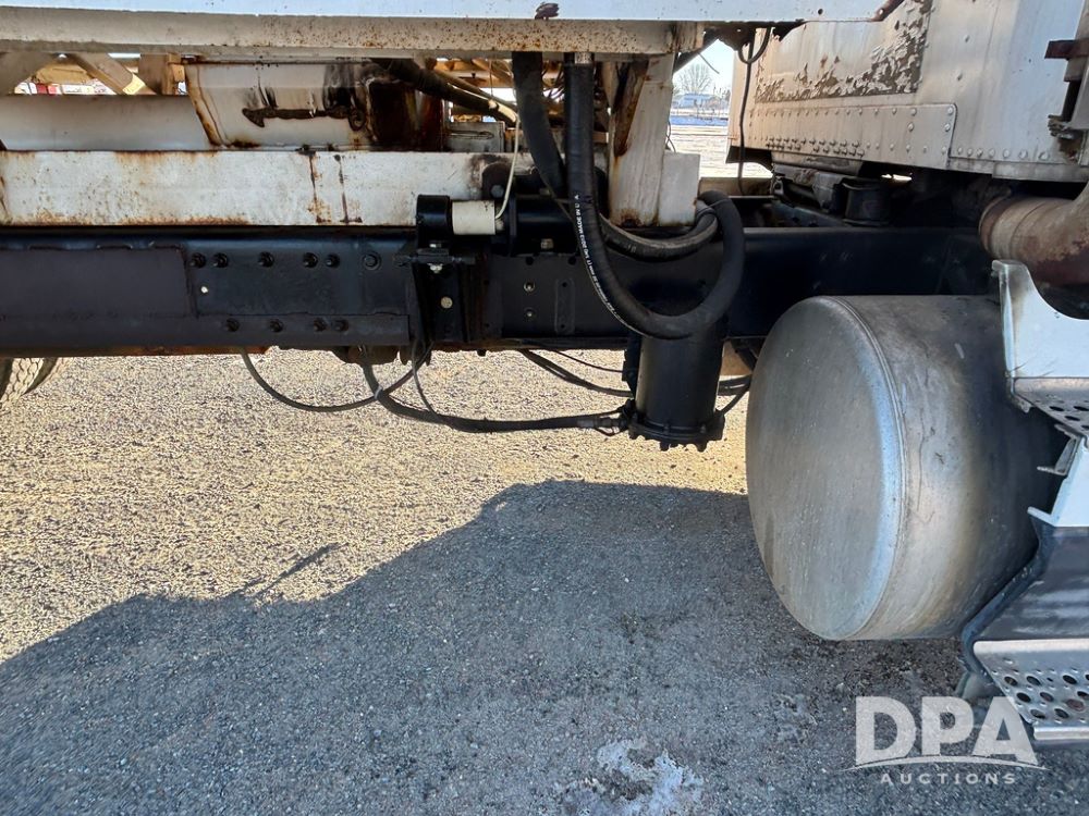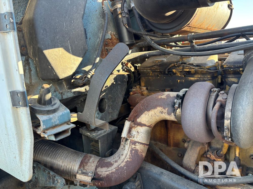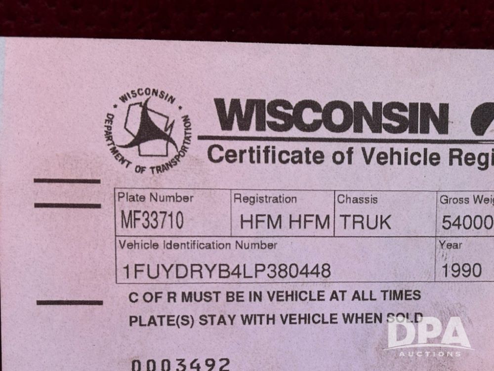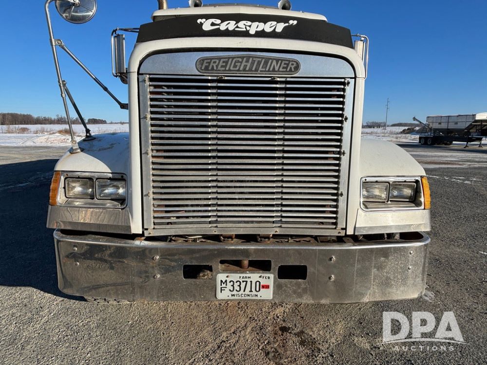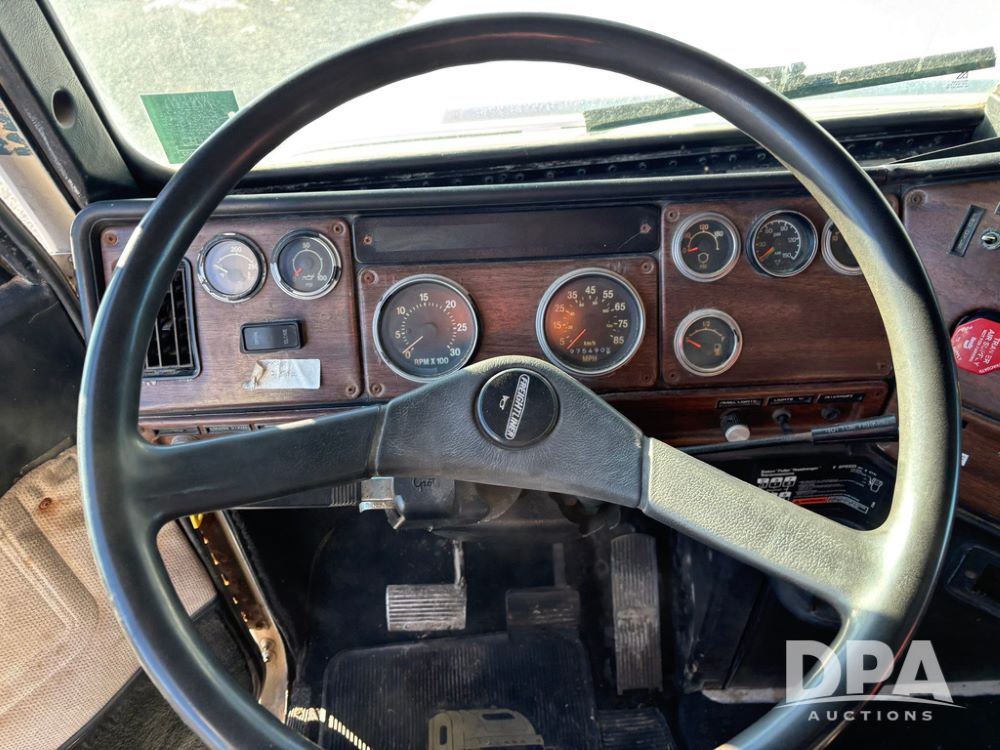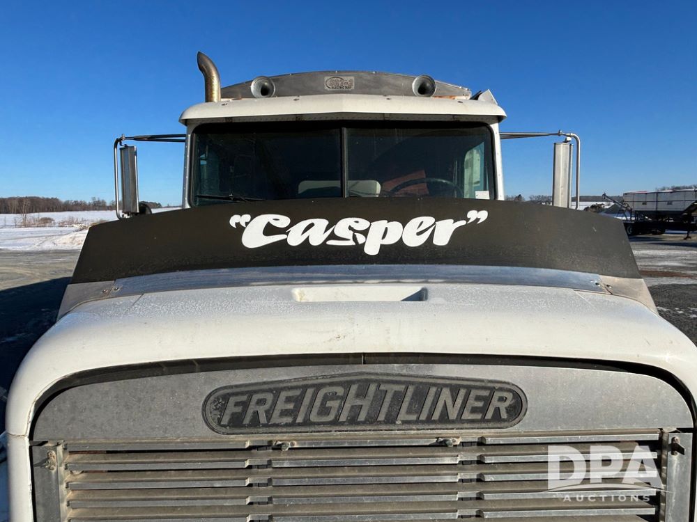 1990 Freightliner Dry Tender Truck (GP12734, Unit 90), Cat diesel engine, Eaton Fuller Roadranger 9 speed transmission, heat, Am/Fm radio, air ride cab, tandem axle, air ride suspension, 18 ton dry tender box, side discharge auger, hydraulic, electric roll tarp, Scale Tec digital scale, 385/65R22.5 front tires, 285/75R24.5 rear tires, shows 975,490 miles.
