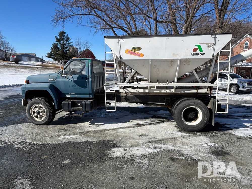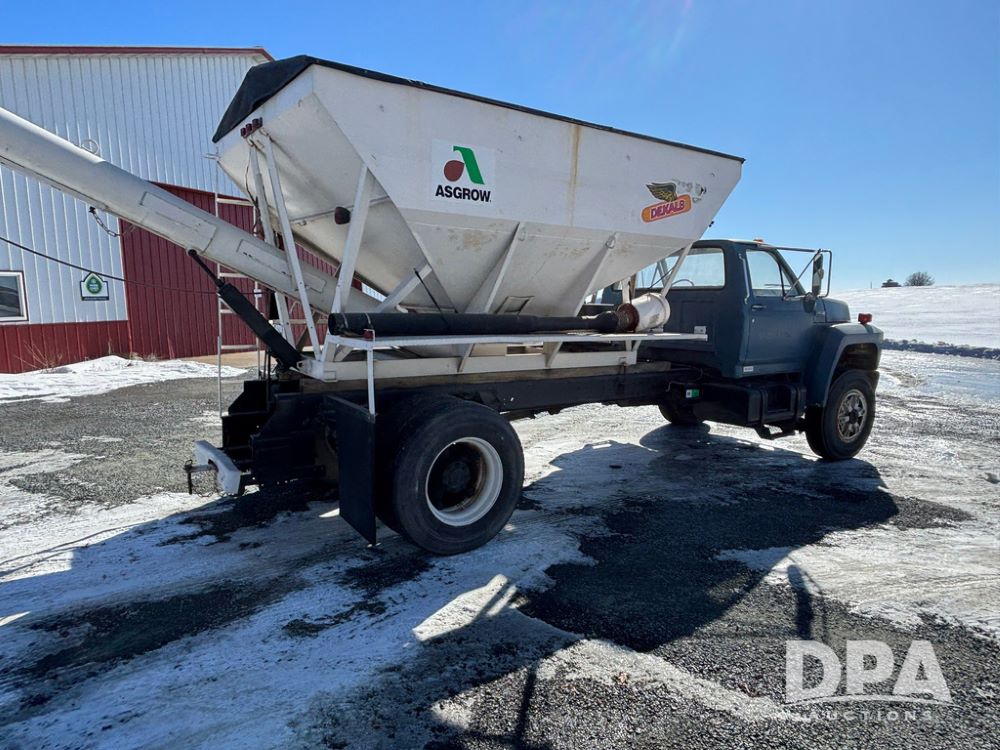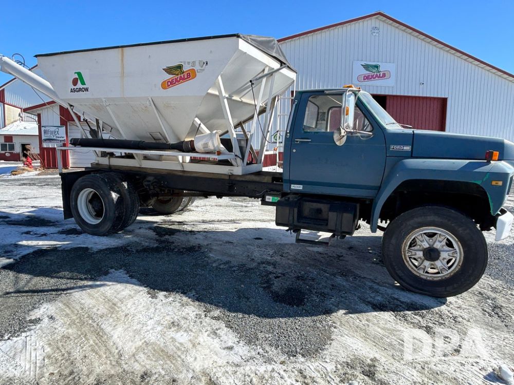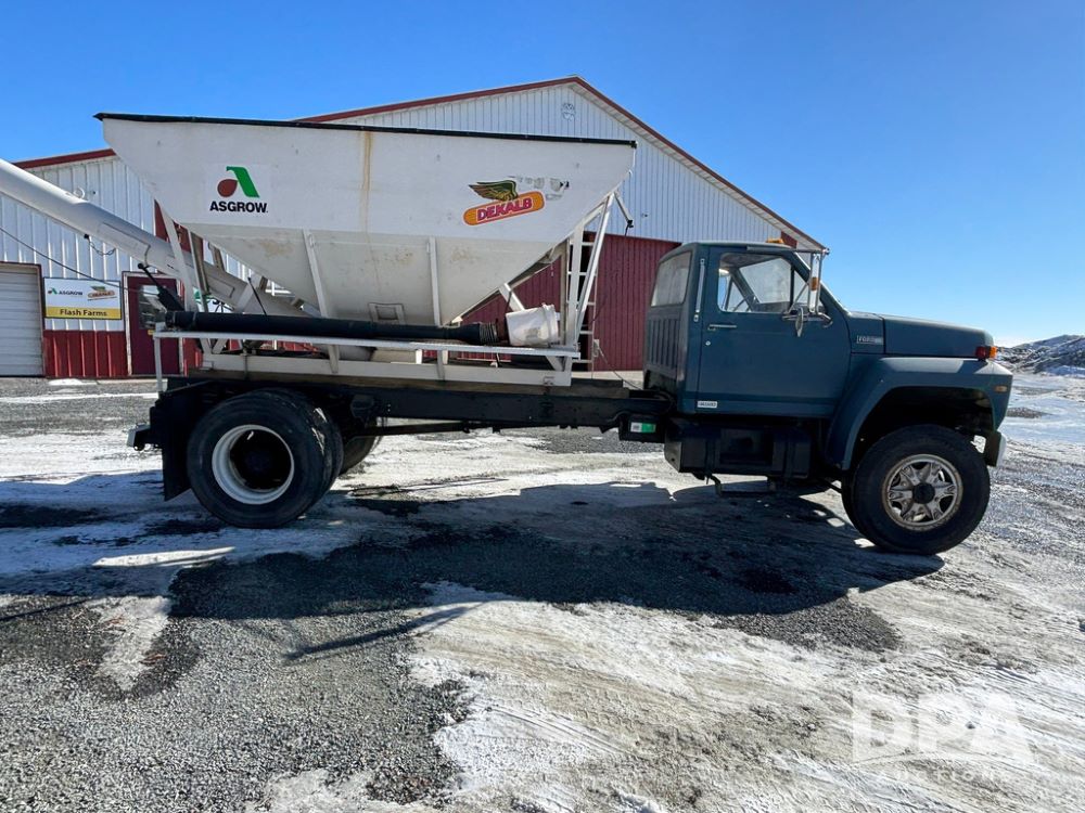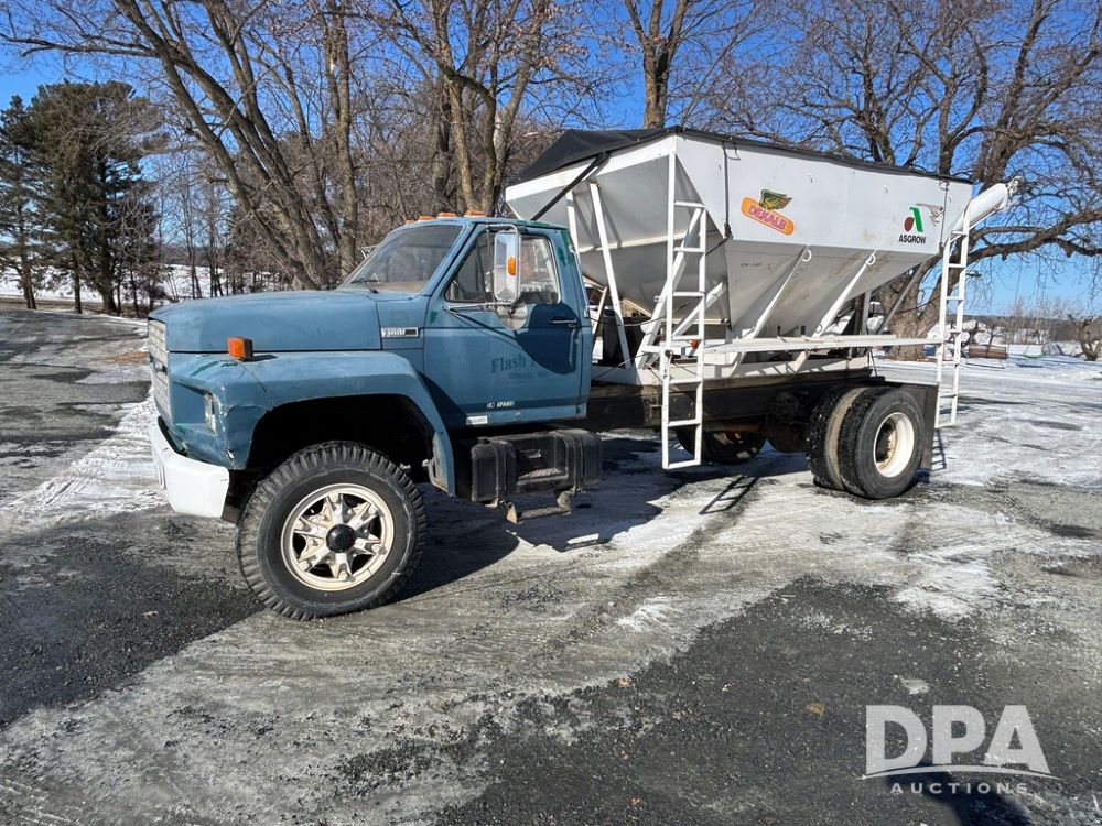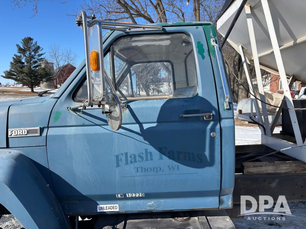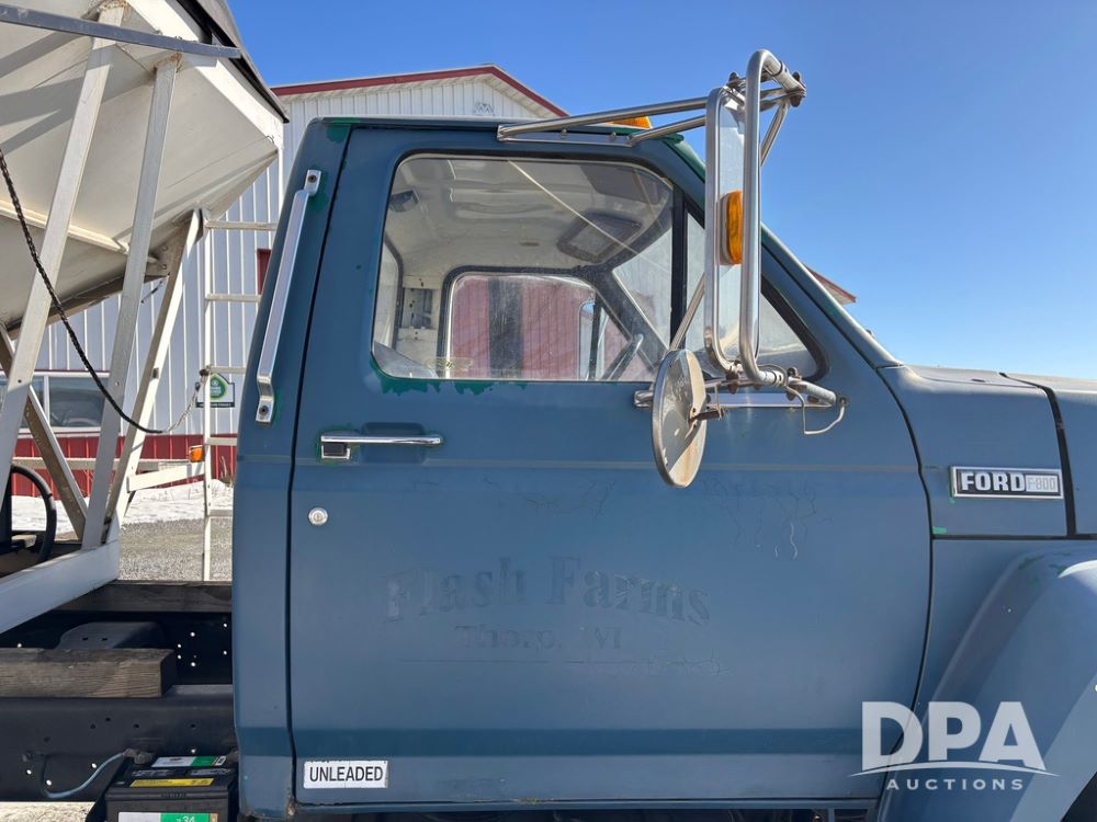 1986 Ford F-800 Dry Tender Truck (GP12746), 429-4V gas engine, 5x2 transmission, heat, Am/Fm radio, single axle, spring suspension, dry tender box, rear discharge auger, hydraulic, tarp, 10.00-20 front tires, 11R22.5 rear tires, shows 155,392 miles.