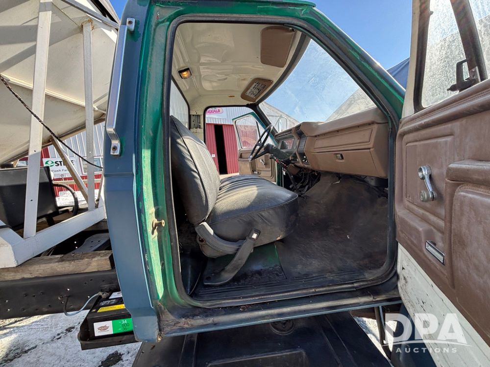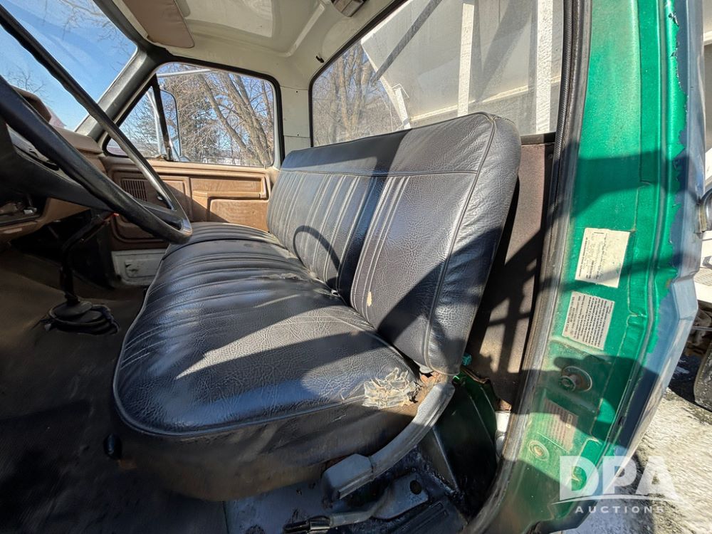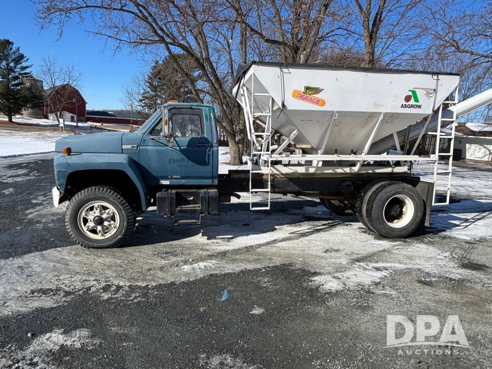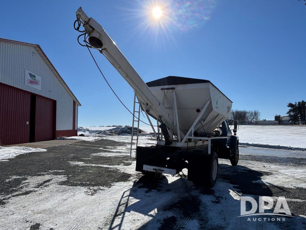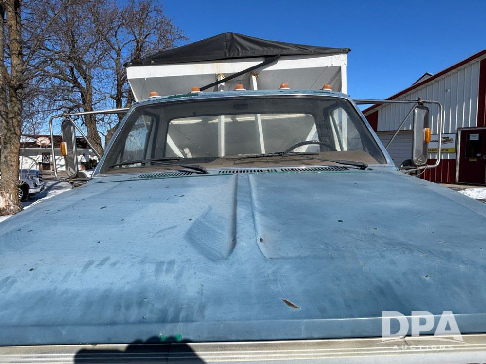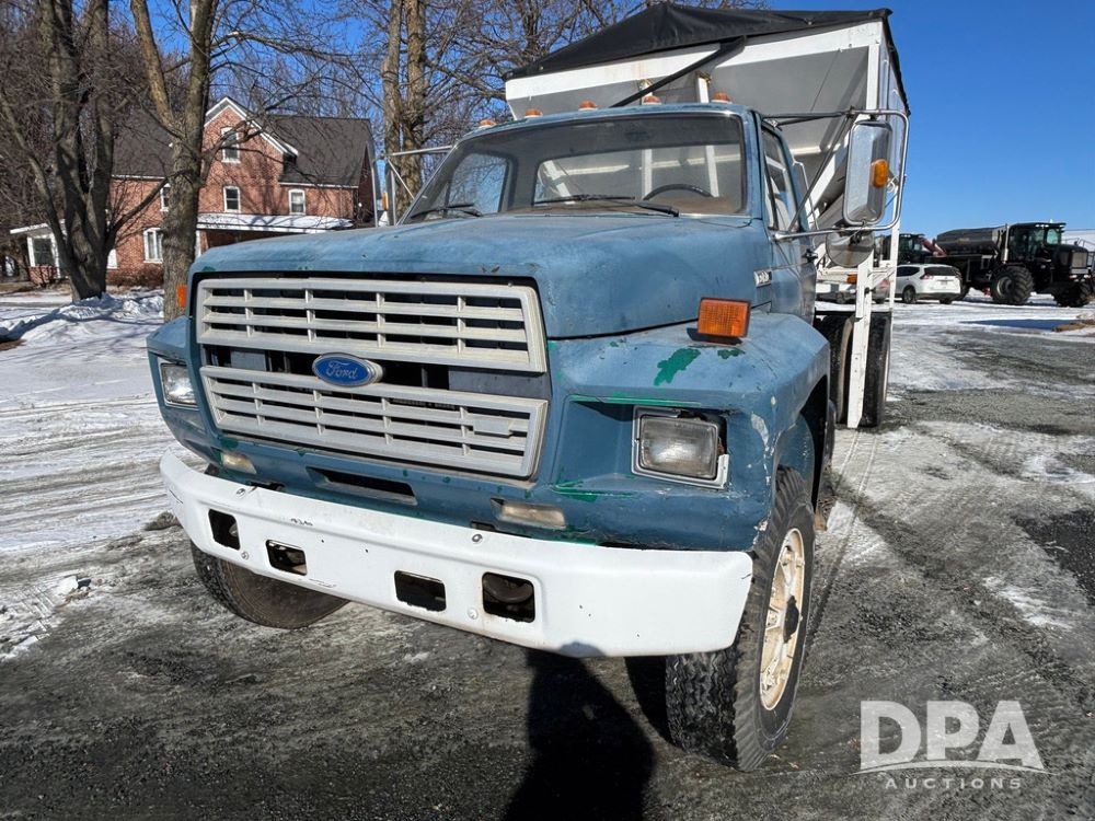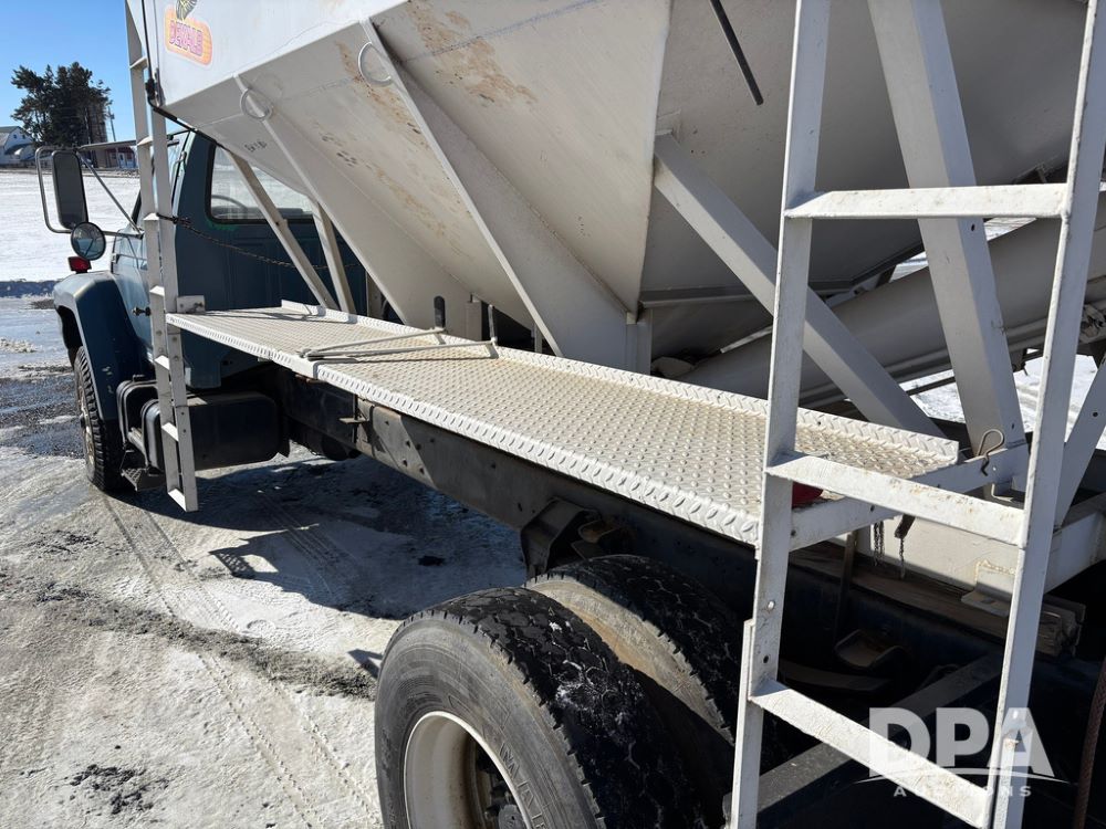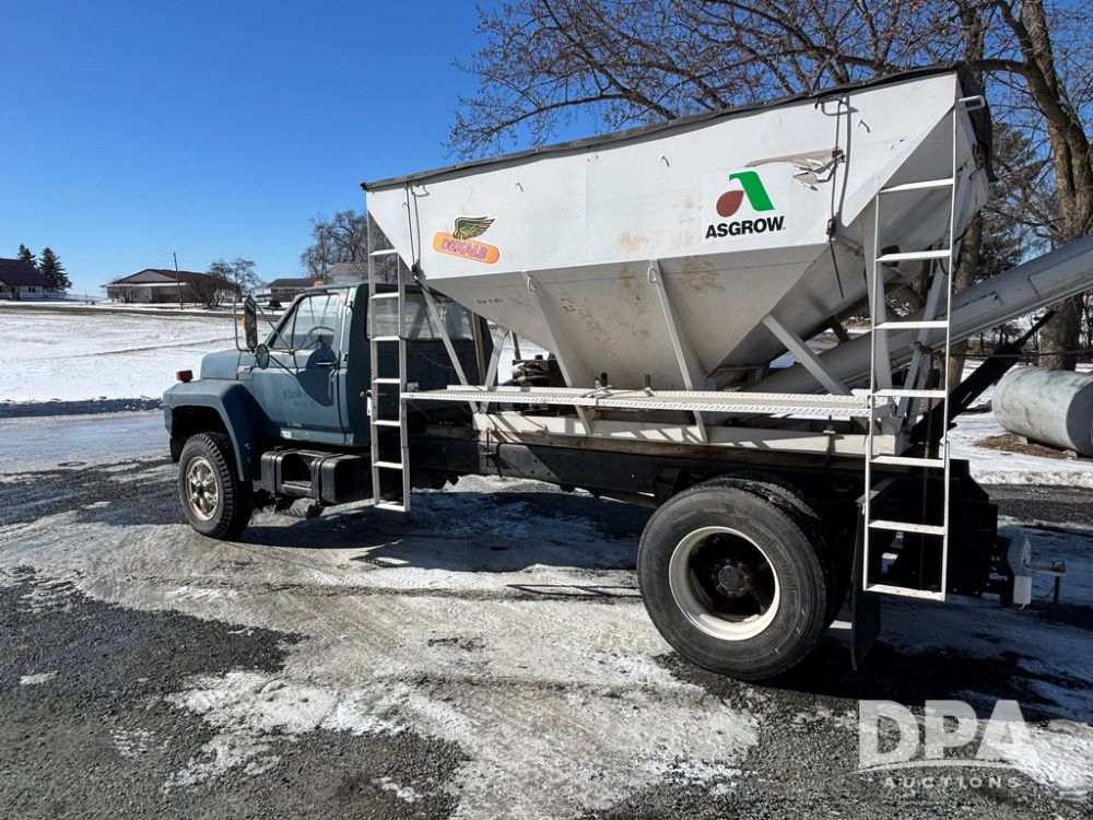 1986 Ford F-800 Dry Tender Truck (GP12746), 429-4V gas engine, 5x2 transmission, heat, Am/Fm radio, single axle, spring suspension, dry tender box, rear discharge auger, hydraulic, tarp, 10.00-20 front tires, 11R22.5 rear tires, shows 155,392 miles.