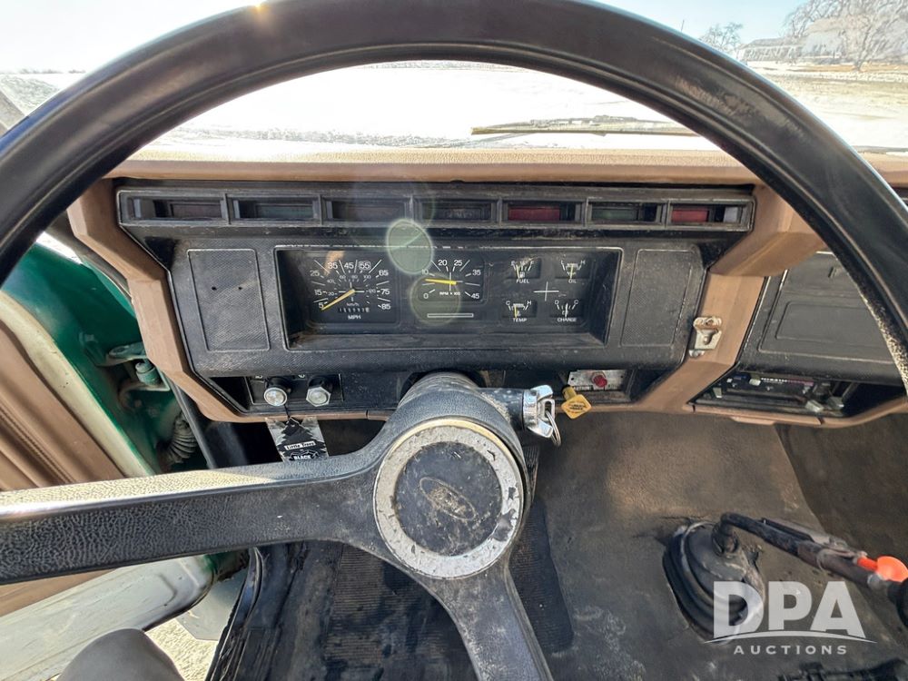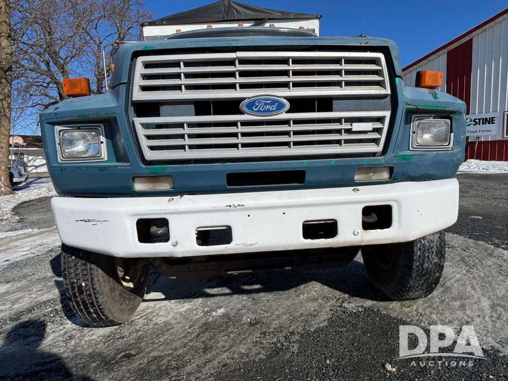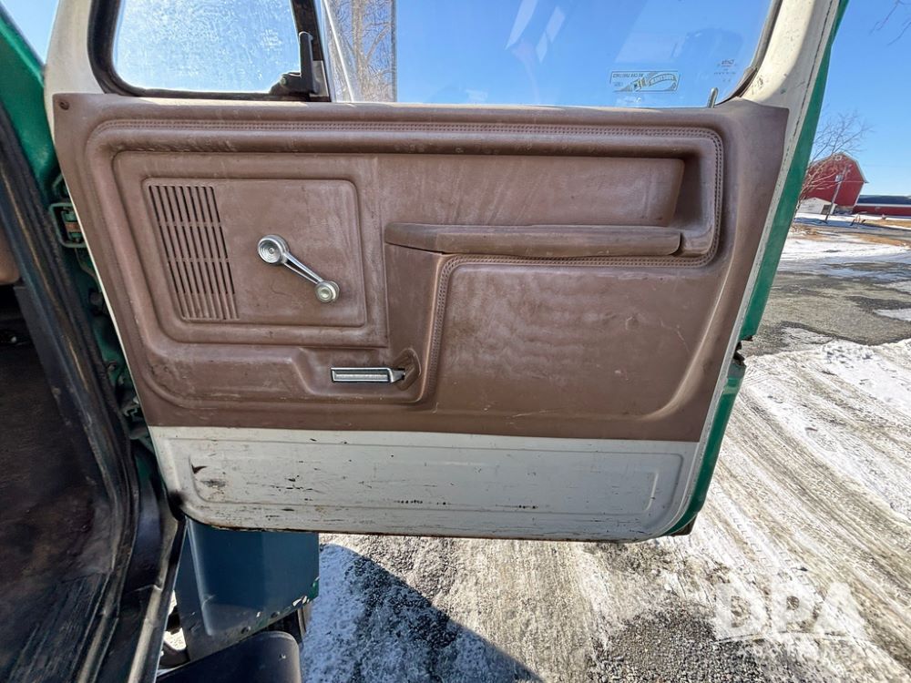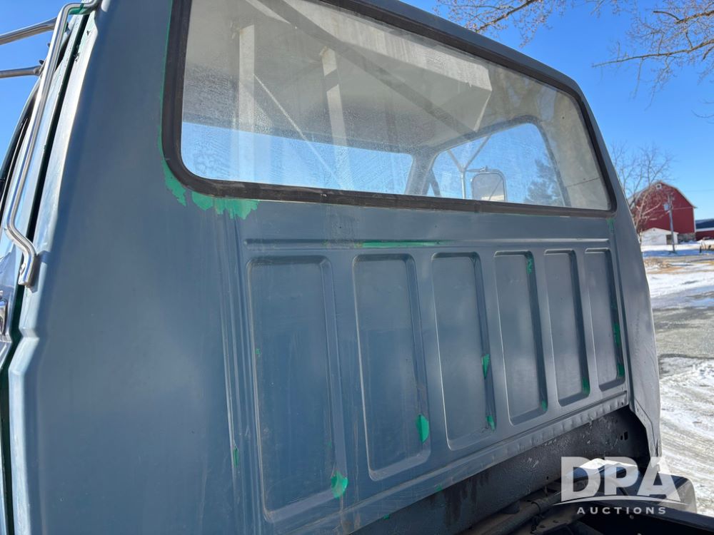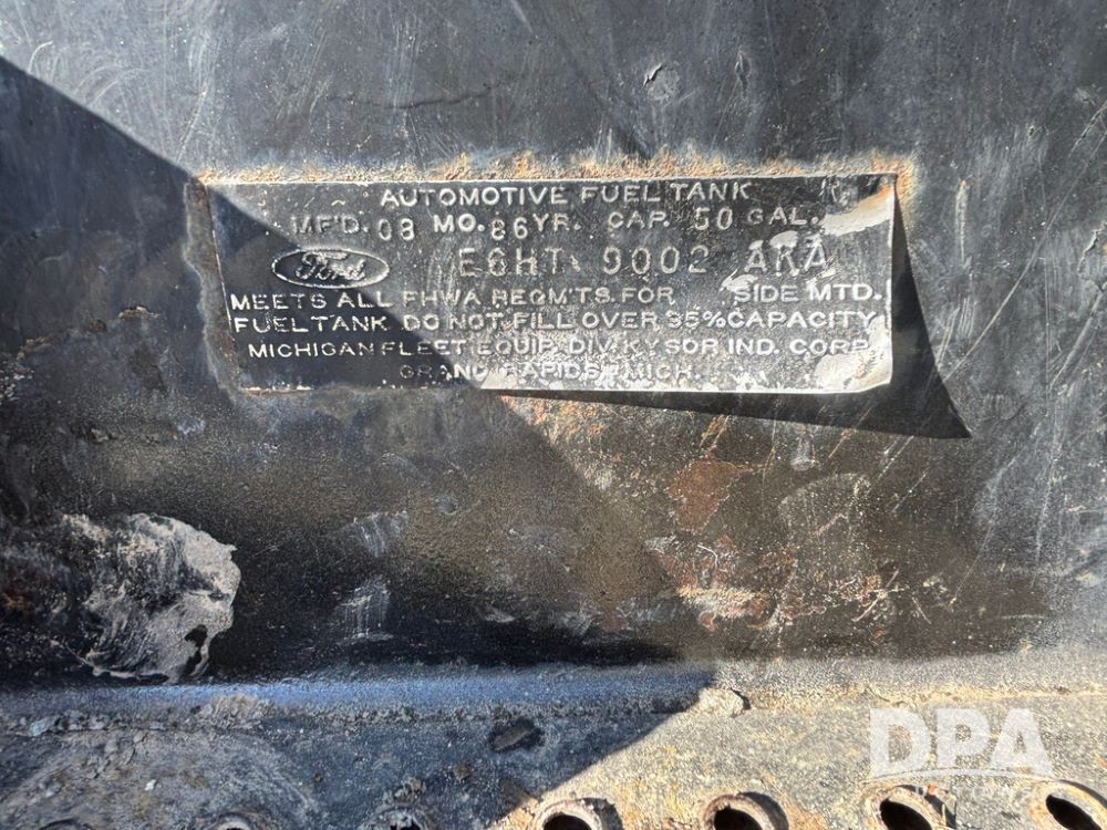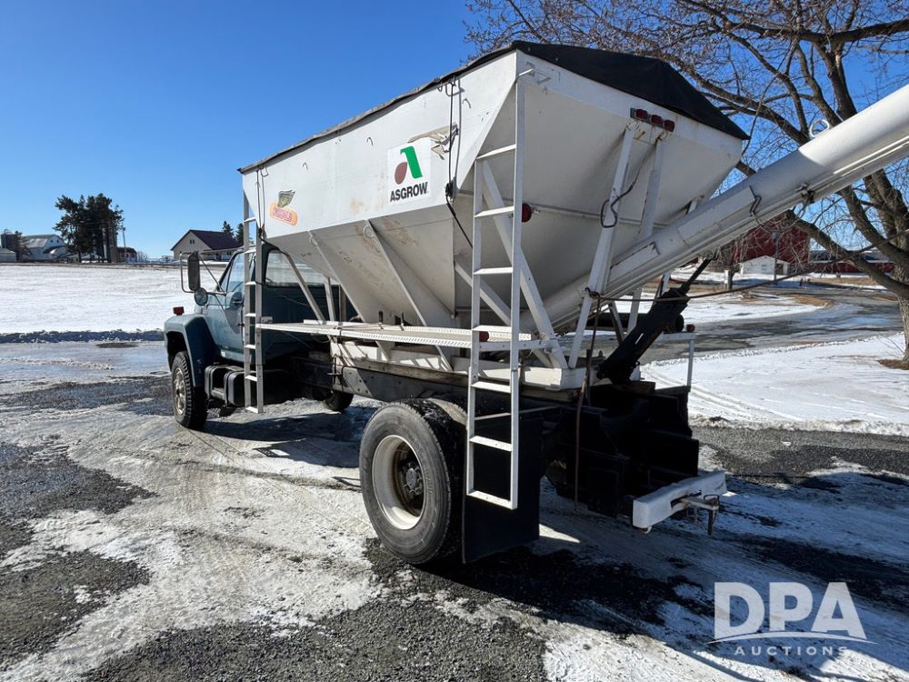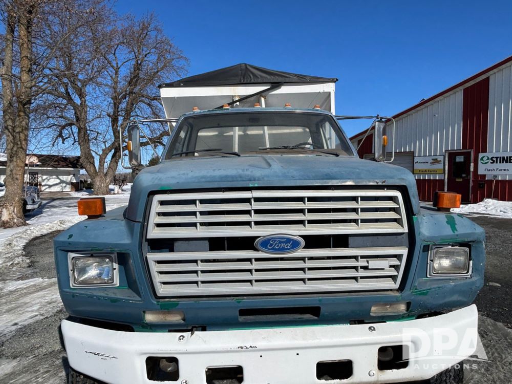 1986 Ford F-800 Dry Tender Truck (GP12746), 429-4V gas engine, 5x2 transmission, heat, Am/Fm radio, single axle, spring suspension, dry tender box, rear discharge auger, hydraulic, tarp, 10.00-20 front tires, 11R22.5 rear tires, shows 155,392 miles.