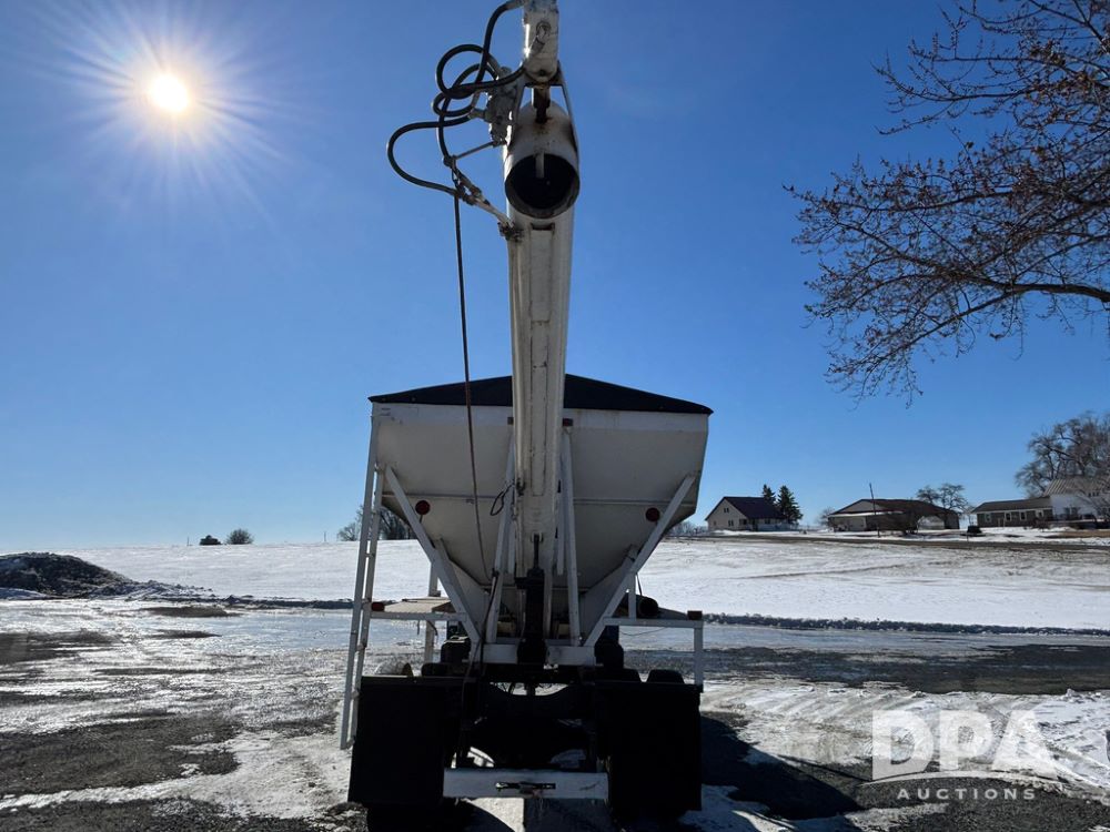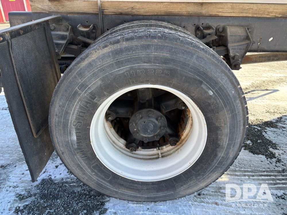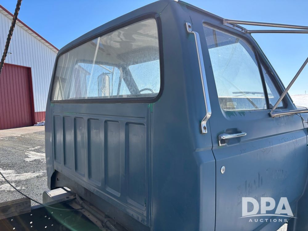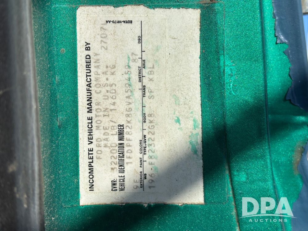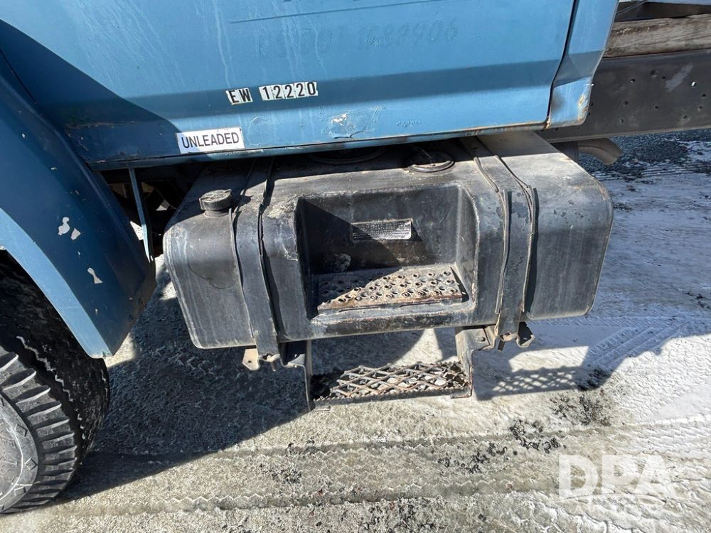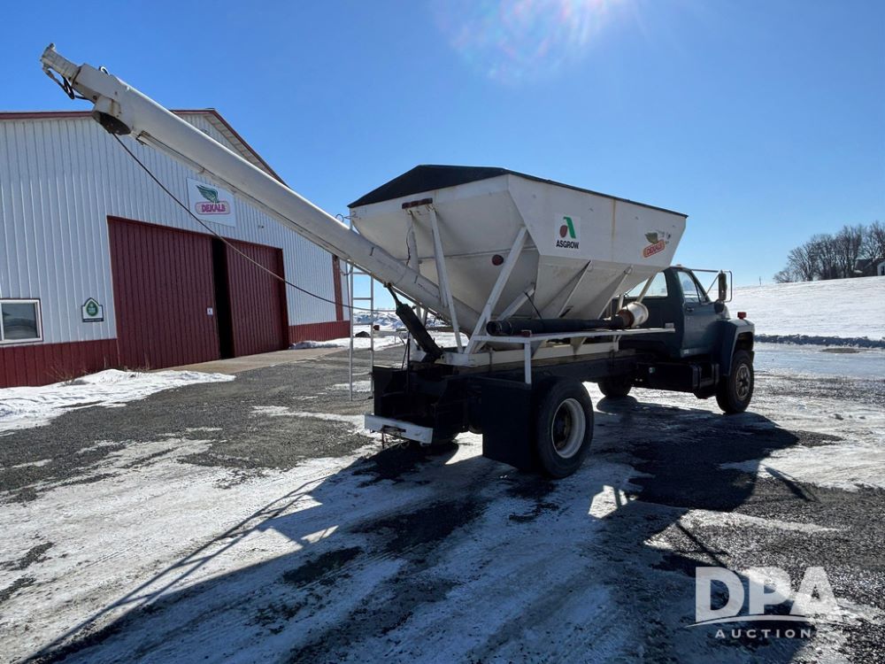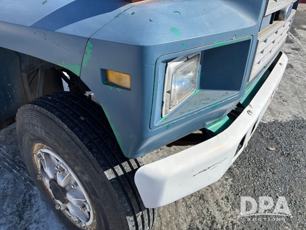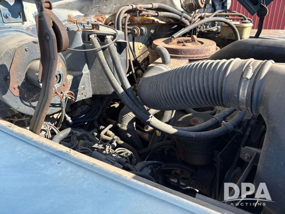 1986 Ford F-800 Dry Tender Truck (GP12746), 429-4V gas engine, 5x2 transmission, heat, Am/Fm radio, single axle, spring suspension, dry tender box, rear discharge auger, hydraulic, tarp, 10.00-20 front tires, 11R22.5 rear tires, shows 155,392 miles.