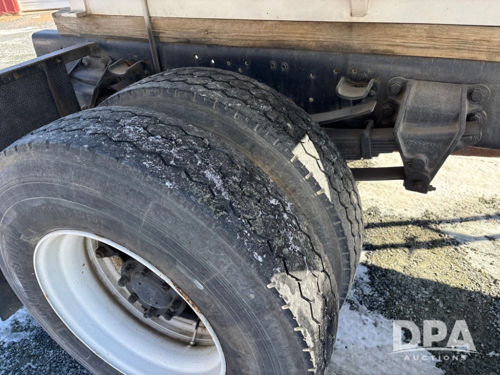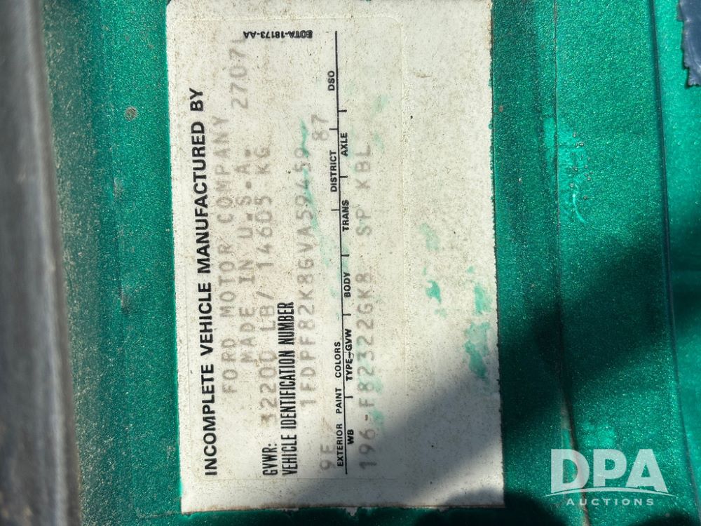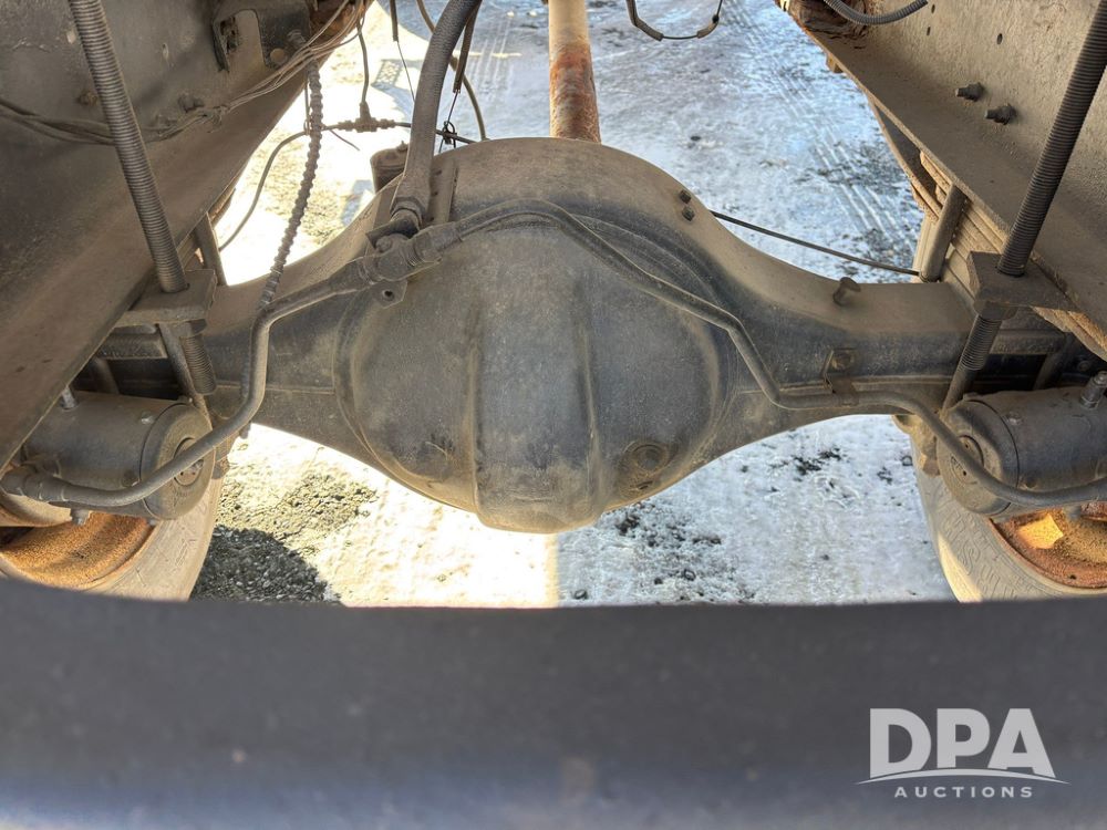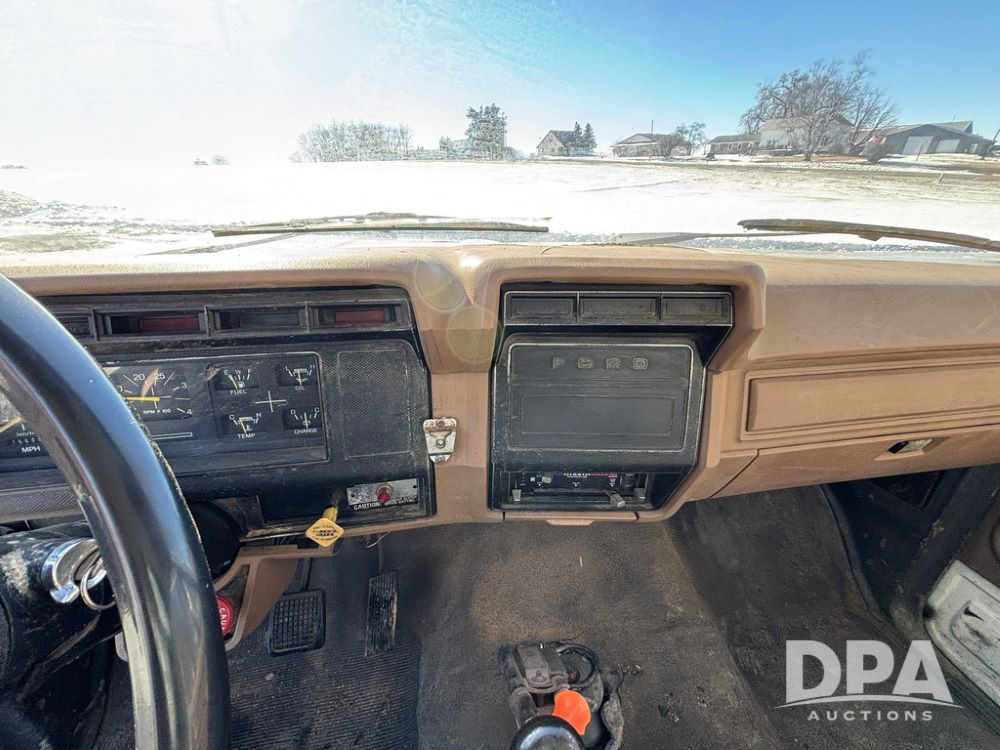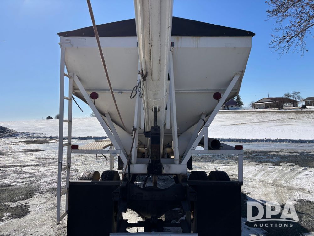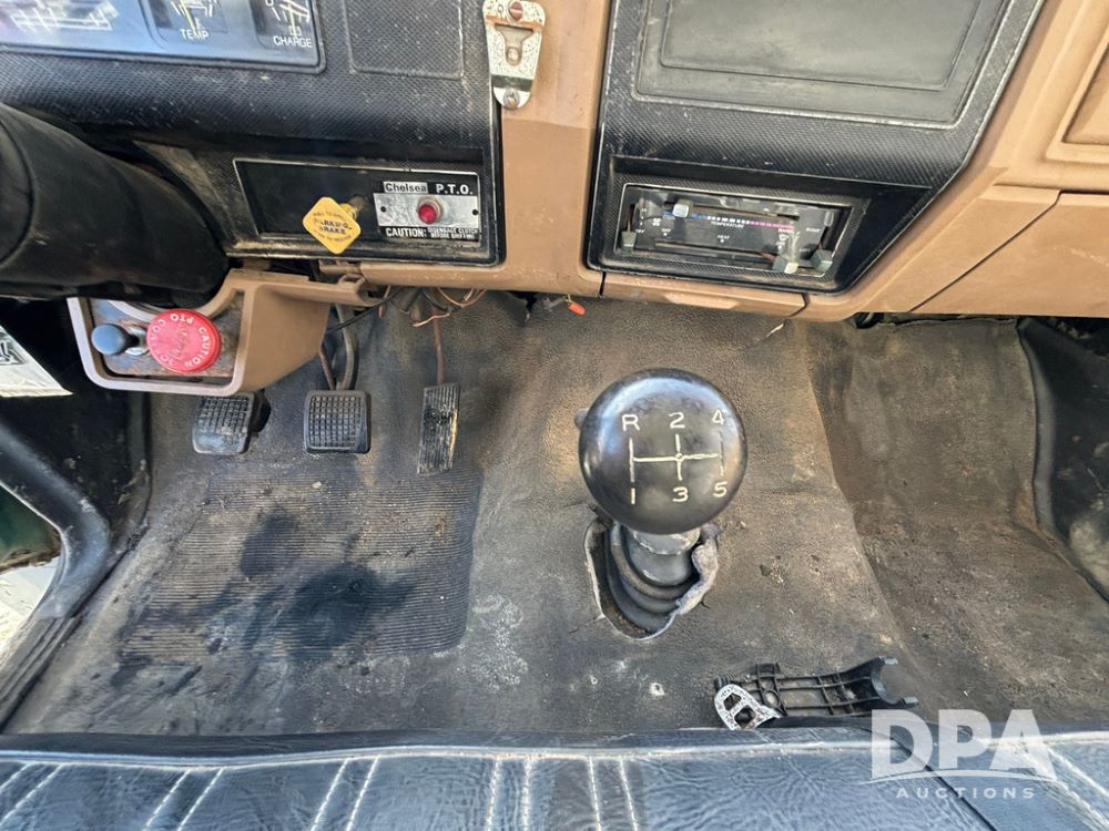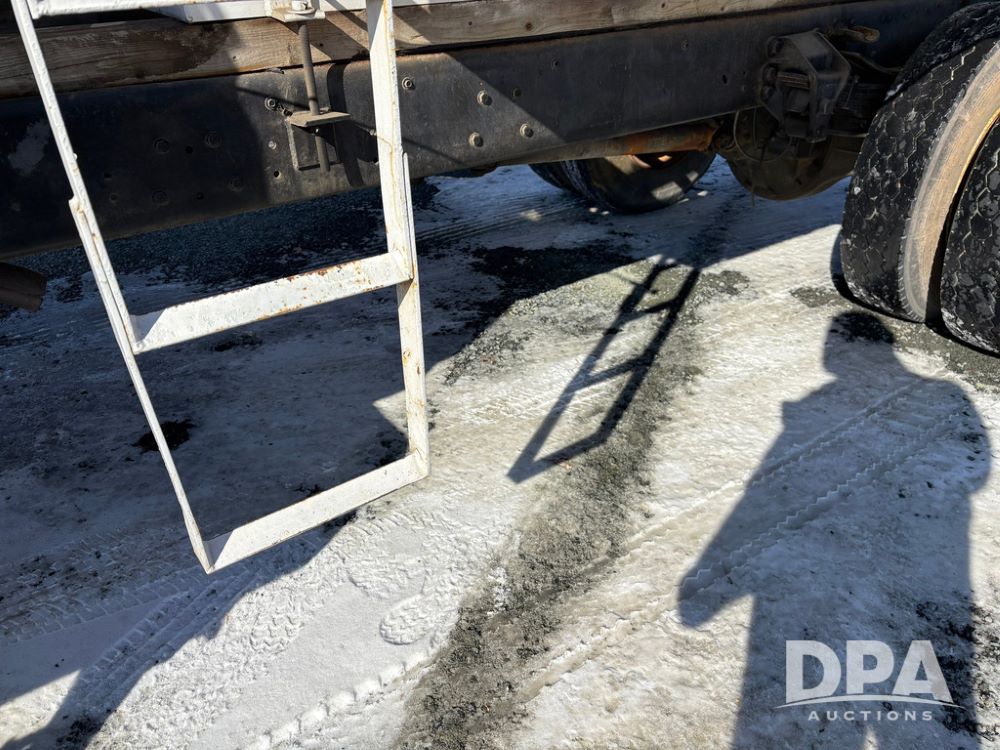 1986 Ford F-800 Dry Tender Truck (GP12746), 429-4V gas engine, 5x2 transmission, heat, Am/Fm radio, single axle, spring suspension, dry tender box, rear discharge auger, hydraulic, tarp, 10.00-20 front tires, 11R22.5 rear tires, shows 155,392 miles.