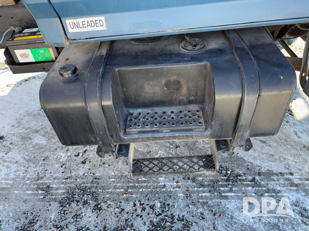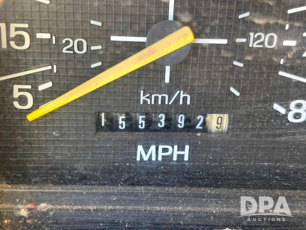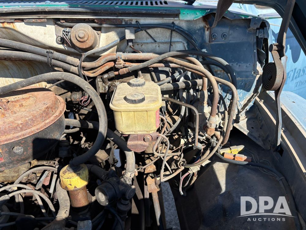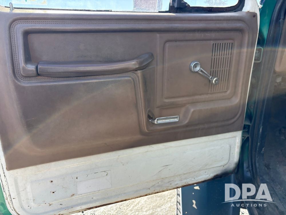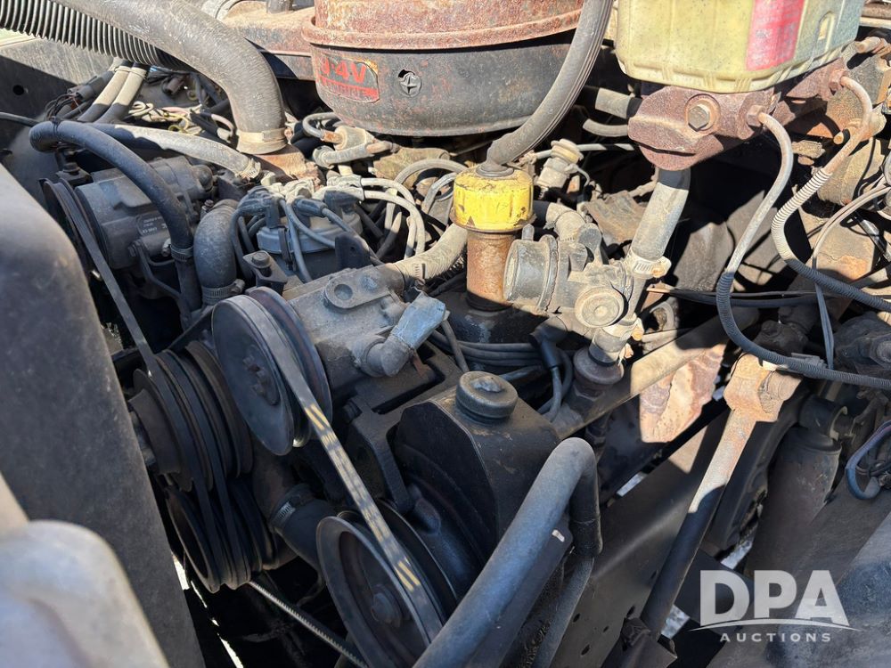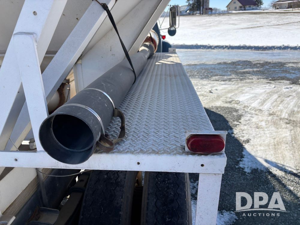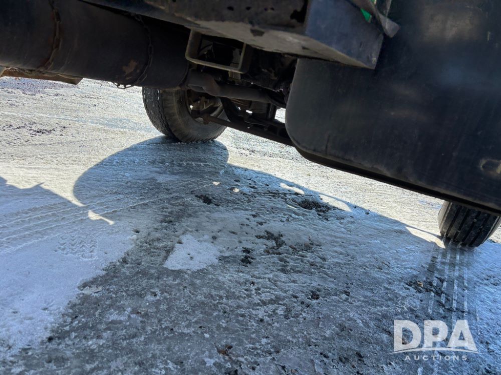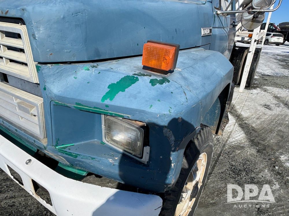 1986 Ford F-800 Dry Tender Truck (GP12746), 429-4V gas engine, 5x2 transmission, heat, Am/Fm radio, single axle, spring suspension, dry tender box, rear discharge auger, hydraulic, tarp, 10.00-20 front tires, 11R22.5 rear tires, shows 155,392 miles.