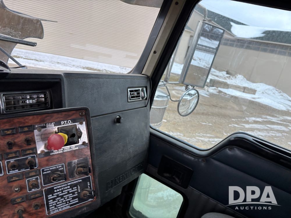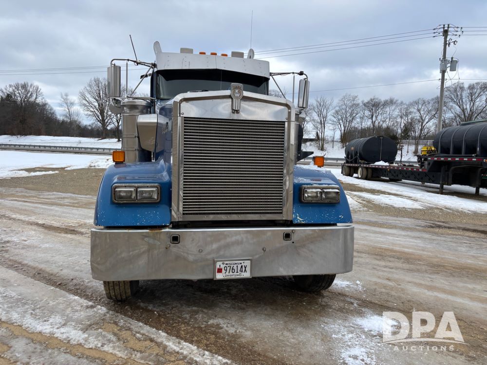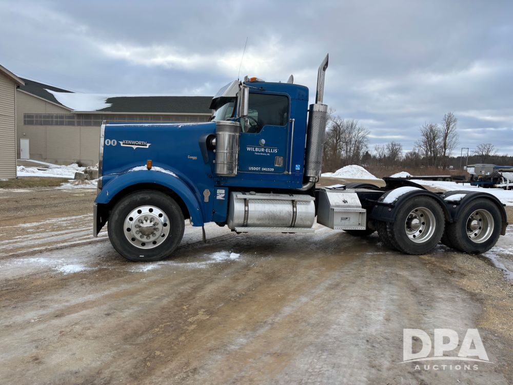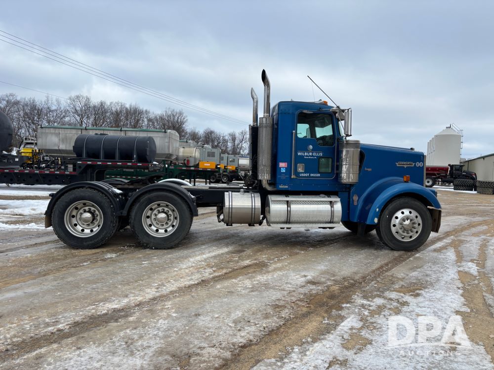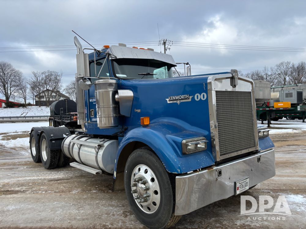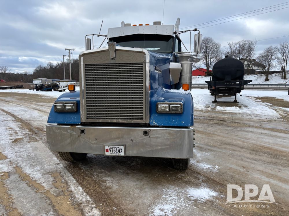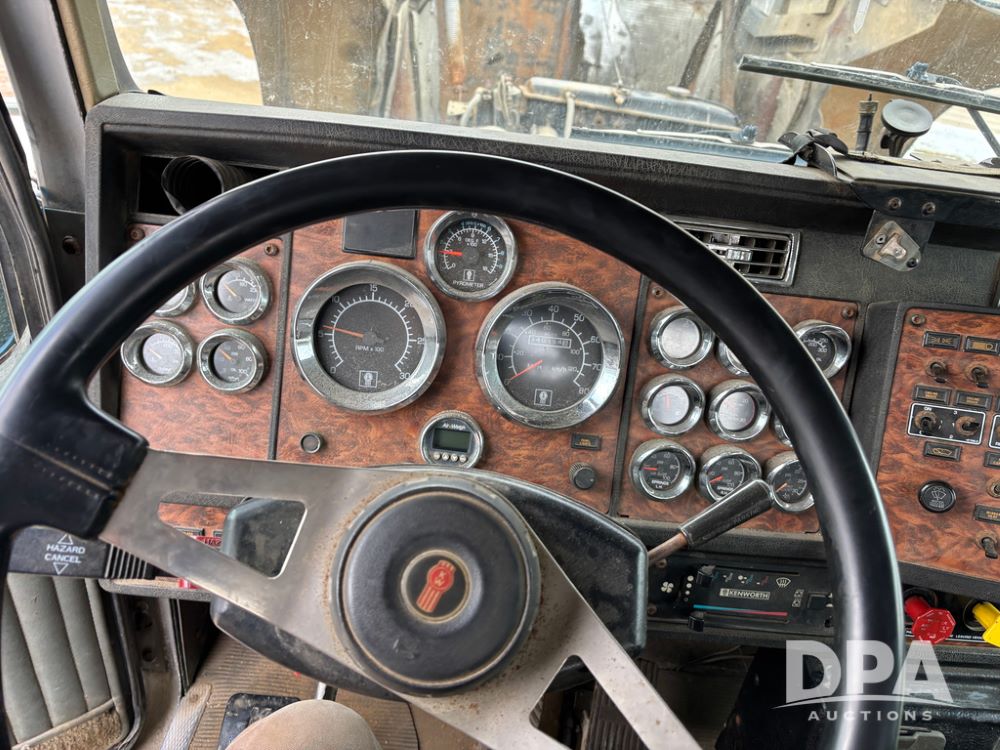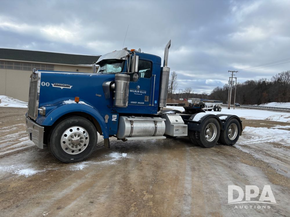 2000 Kenworth W900 Truck (DR13180), Cummins N14 diesel engine, 13 speed transmission (has issues), tandem axle full screw, 210'' WB, day cab, hydraulic wet kit, air slide 5th wheel plate, dual chrome stacks, stainless steel drop visor, dual chrome air breathers, dual aluminum fuel tanks, Minimizer double hump fenders, rear pintle hitch, engine brake, cruise control, 24.5 tires, aluminum wheels.