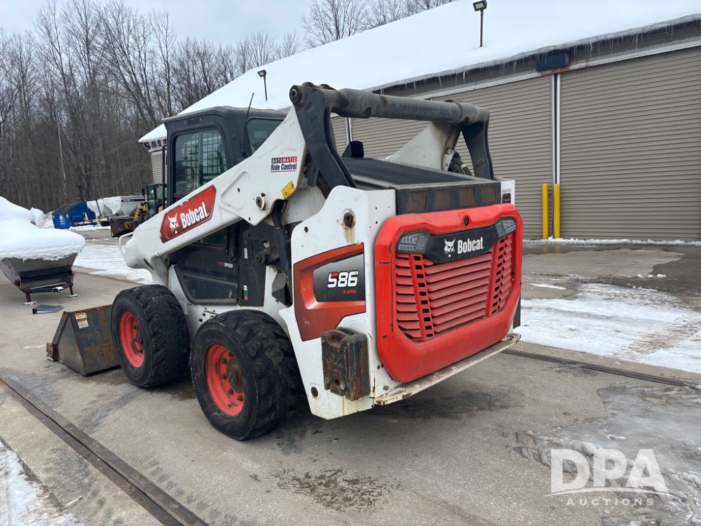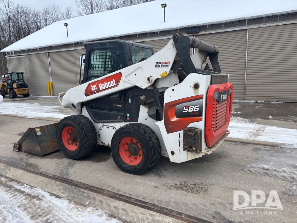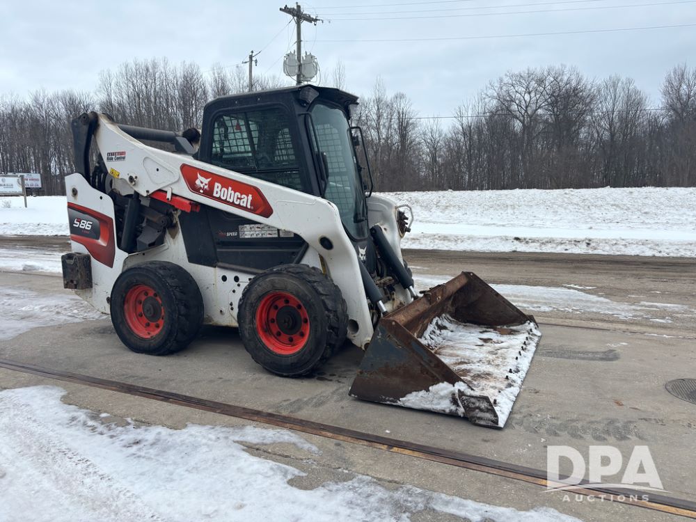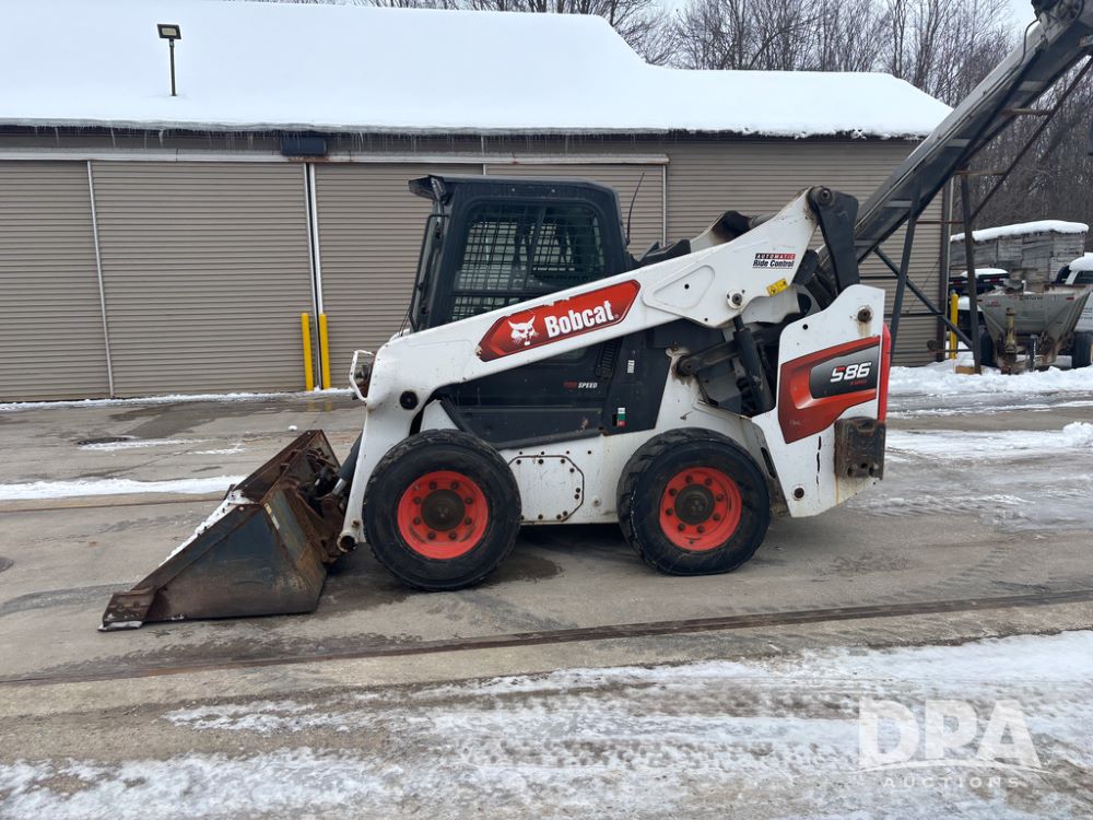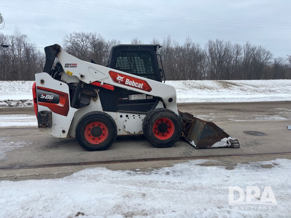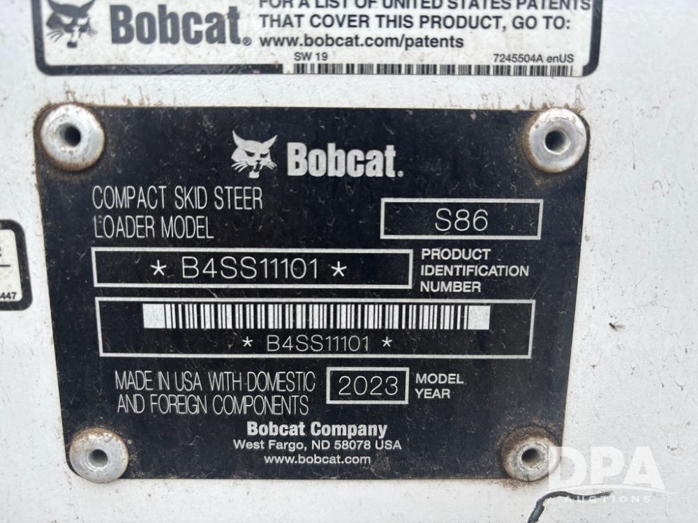 2023 Bobcat S86 Skid Loader (DR13181), diesel engine, hydrostatic drive 2 speed, enclosed cab, automatic ride control, rear suitcase weights, 84'' front bucket, auxiliary hydraulic and electrical outlets, AM/FM radio, 12-16.5 tires, only 884 hours.