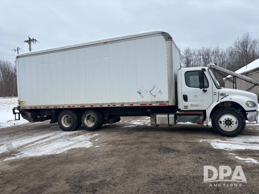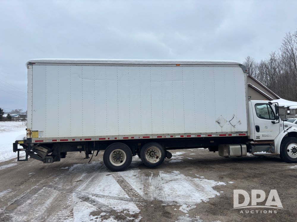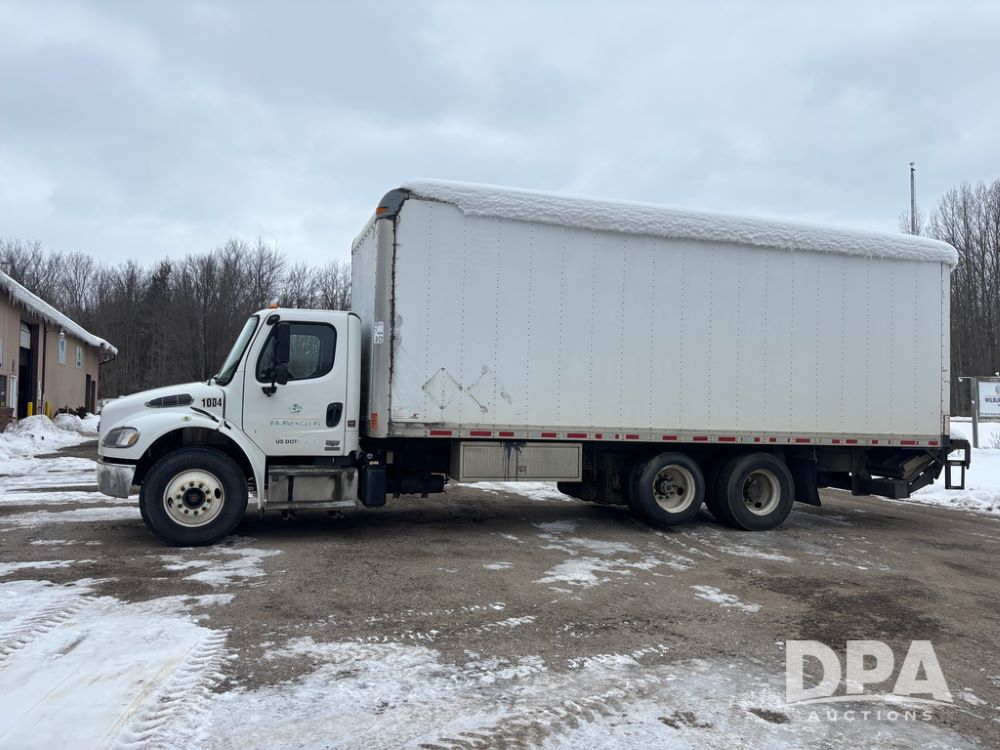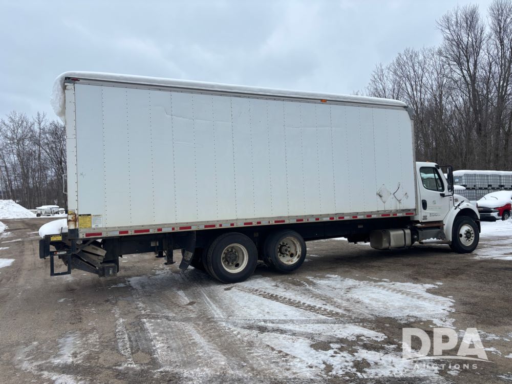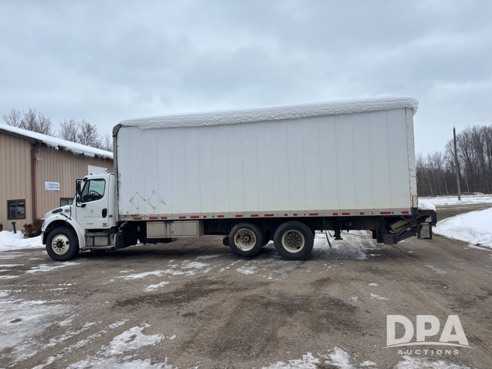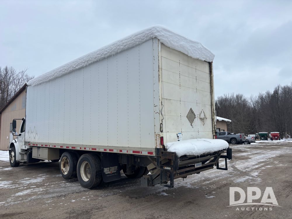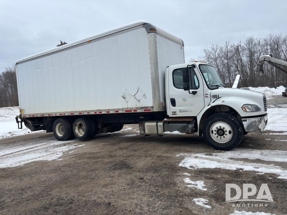 2011 Freightliner Business Class Van Truck (DR13183 Unit 1044), Cummins diesel engine, 6 speed transmission, single axle w/air lift tag axle, air brakes, Supreme 26' van box, rear roll up door (needs work), Thieman rear lift tail gate, frame mounted storage box, rear manual outriggers, heated mirrors, cab heat/air conditioning, cruise control, odometer reads 391,886 miles.