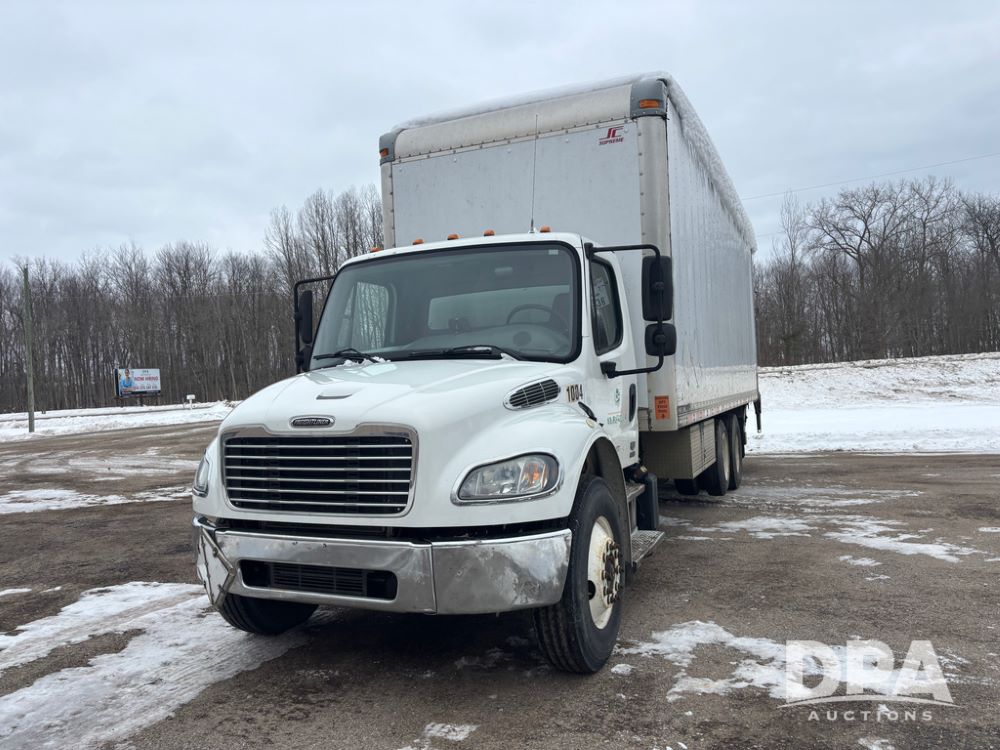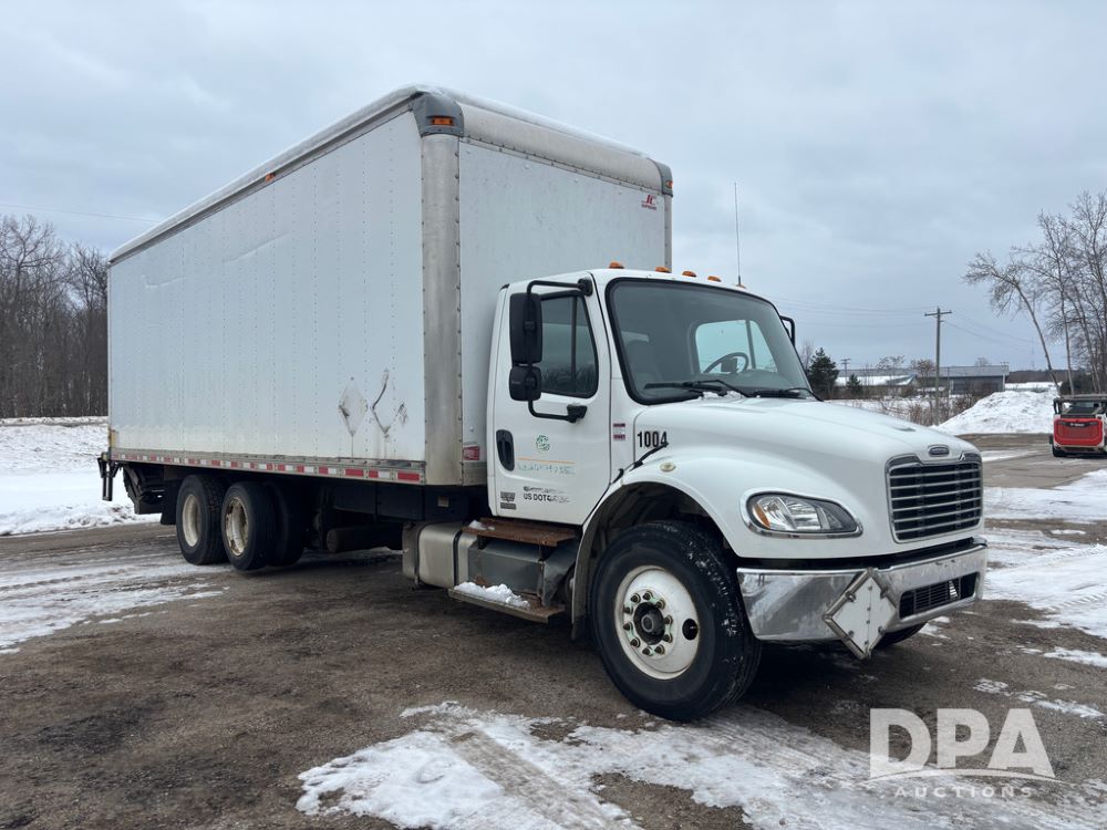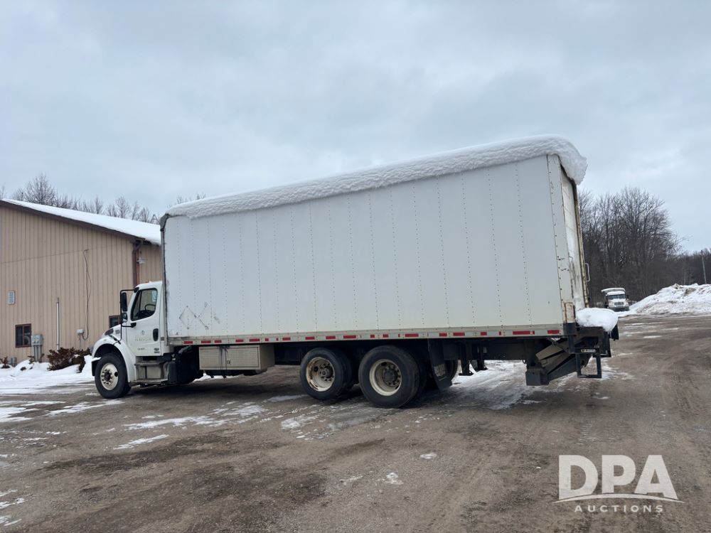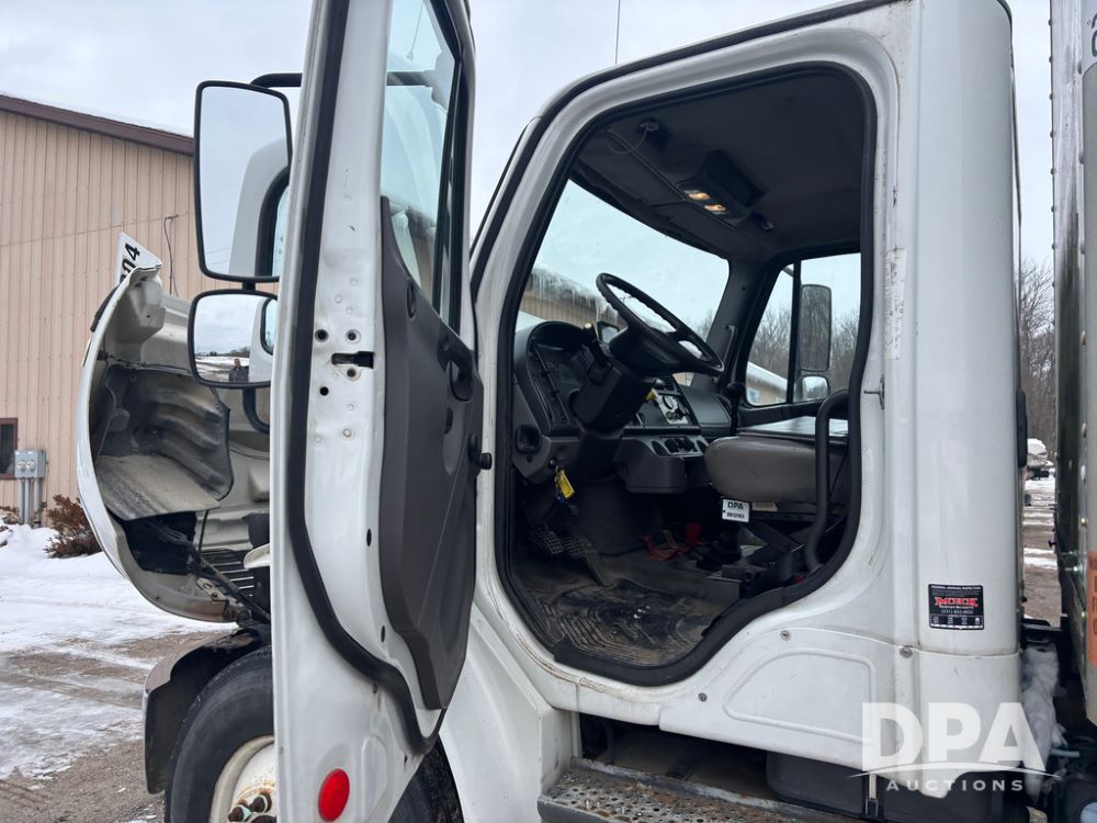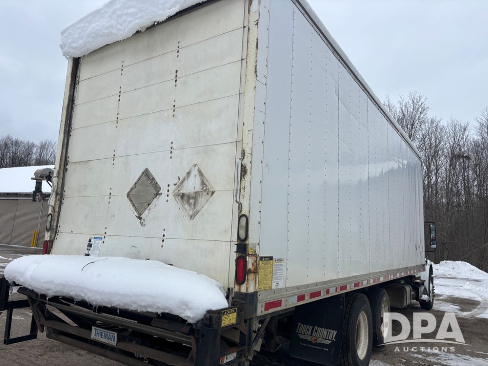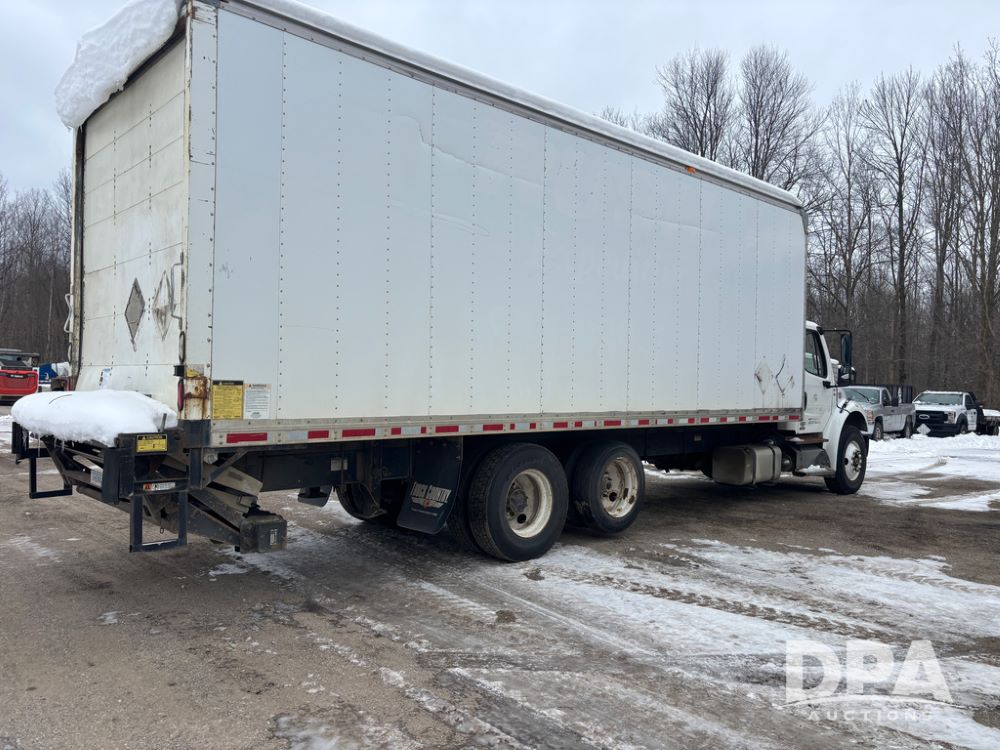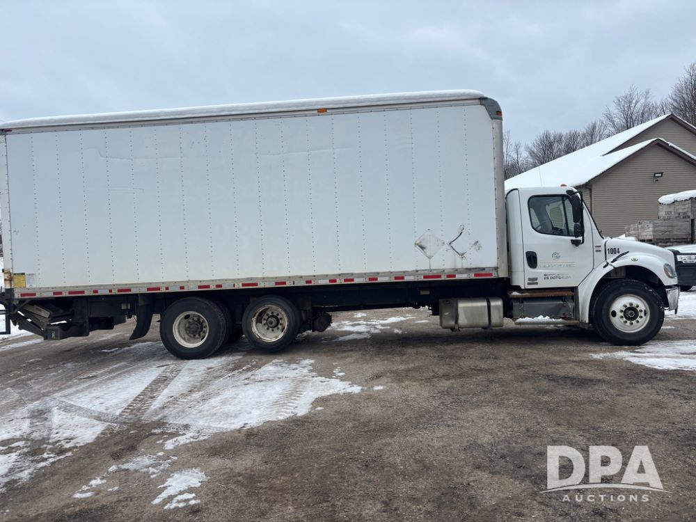 2011 Freightliner Business Class Van Truck (DR13183 Unit 1044), Cummins diesel engine, 6 speed transmission, single axle w/air lift tag axle, air brakes, Supreme 26' van box, rear roll up door (needs work), Thieman rear lift tail gate, frame mounted storage box, rear manual outriggers, heated mirrors, cab heat/air conditioning, cruise control, odometer reads 391,886 miles.