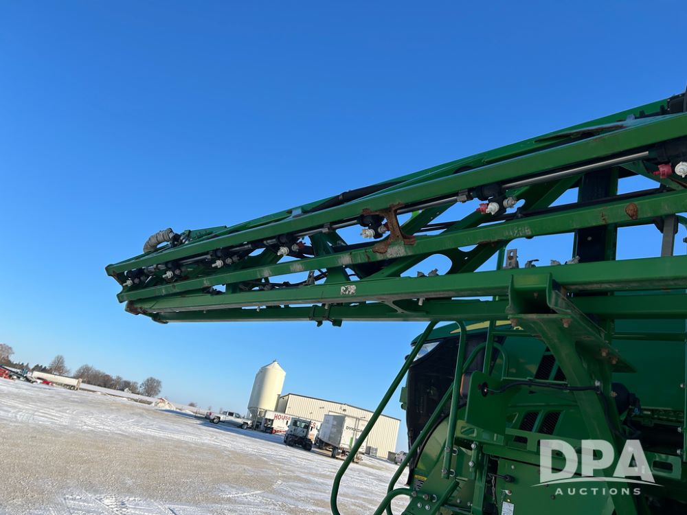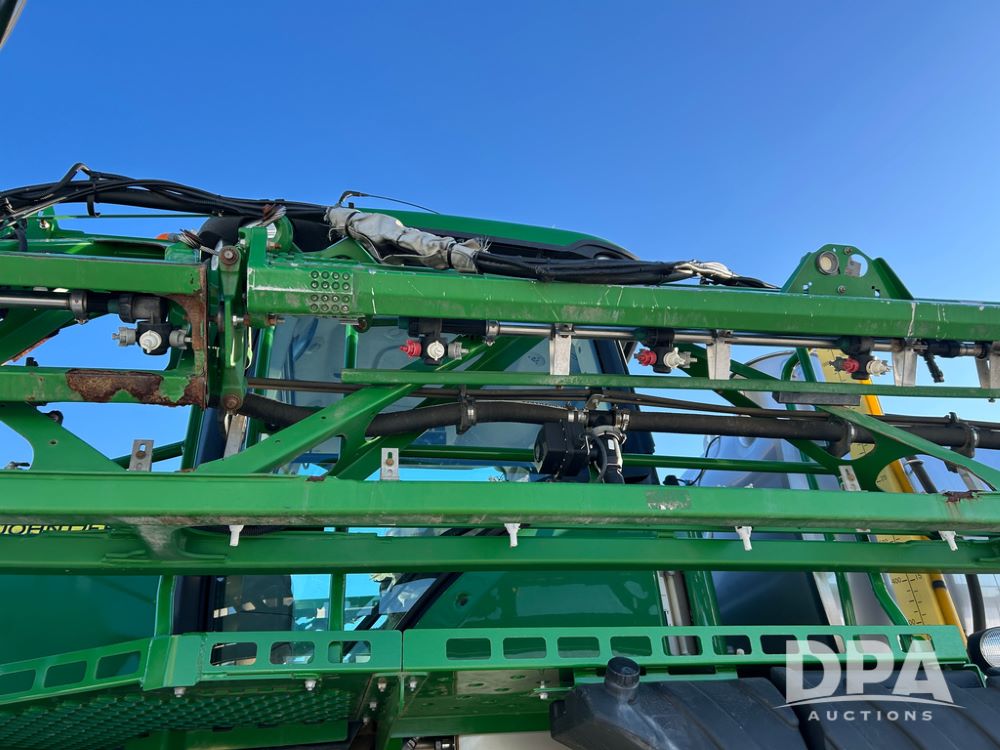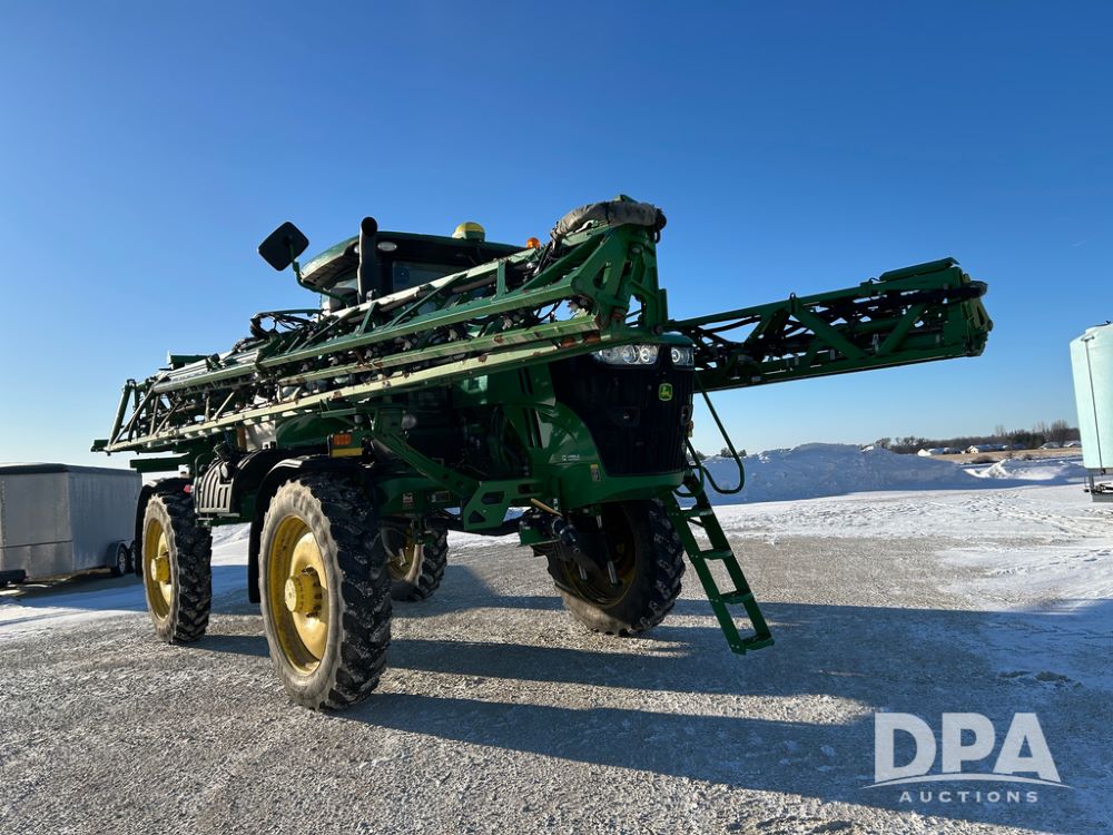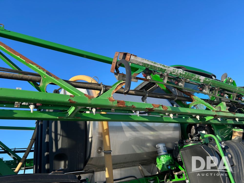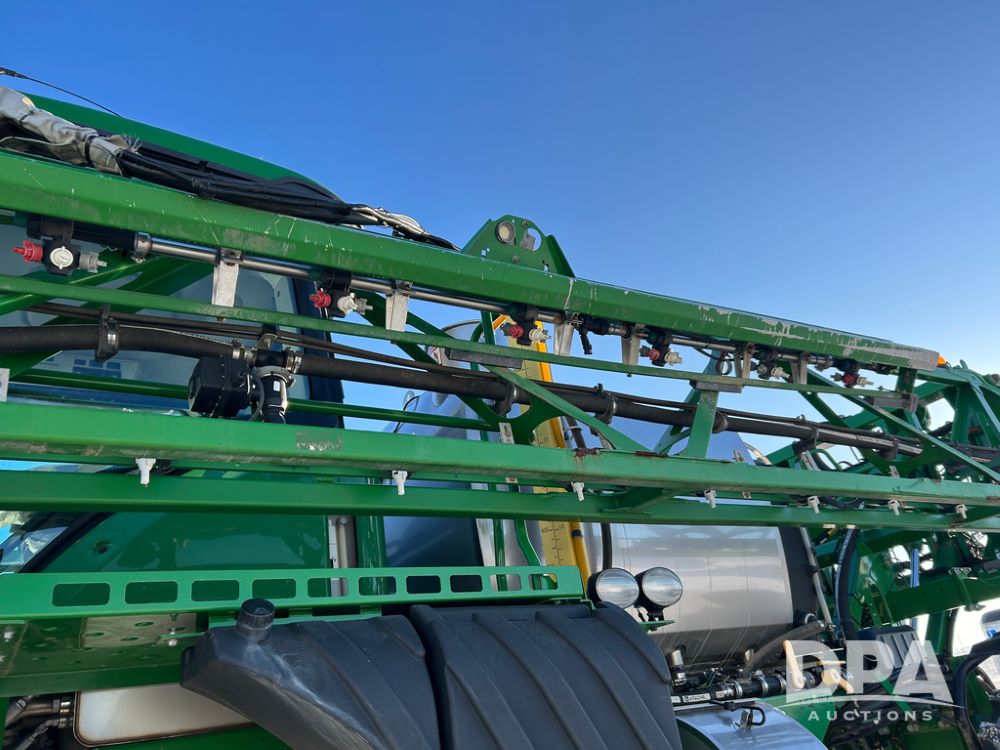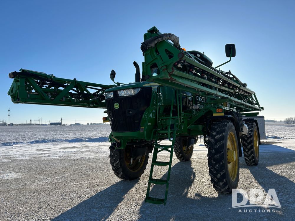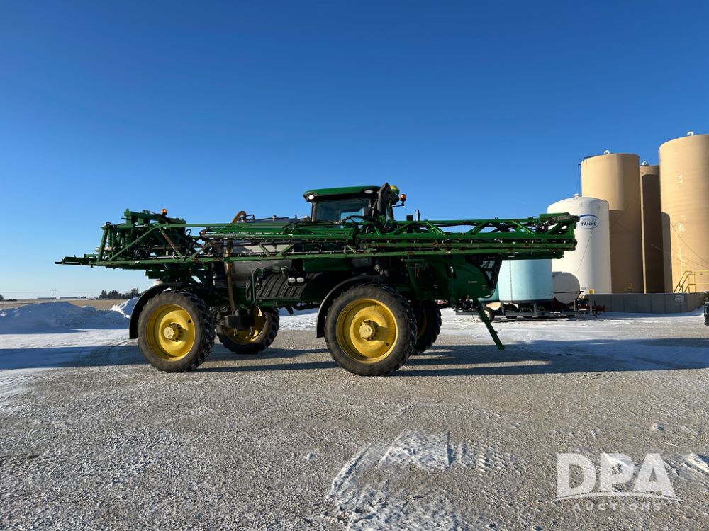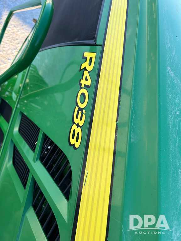 2018 John Deere R4038 Sprayer (CP1550 Unit 106235), John Deere diesel engine, hydrostatic drive, 1,000 gallon stainless steel liquid system, 120' boom, 5 way nozzle bodies, stainless steel chemical inductor, John Deere control, StarFire 6000 receiver, front load, AM/FM CD radio, cab heat/air conditioning, 380/90R46 row crop tires, full set fenders, shows 2,621 hours.