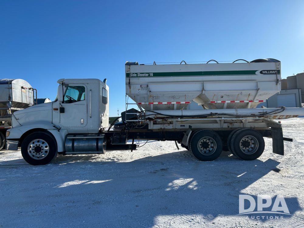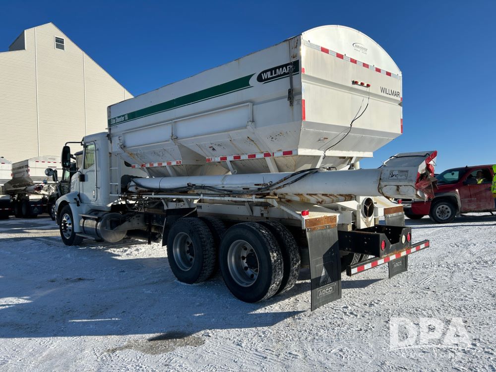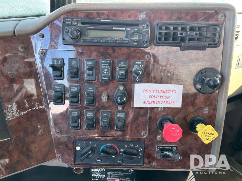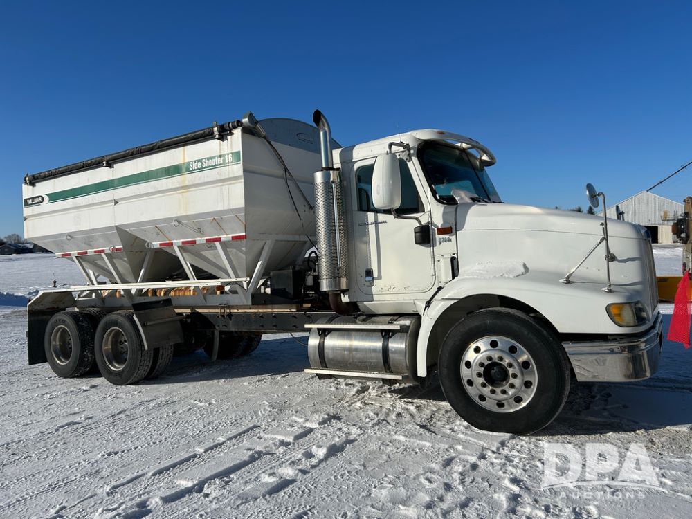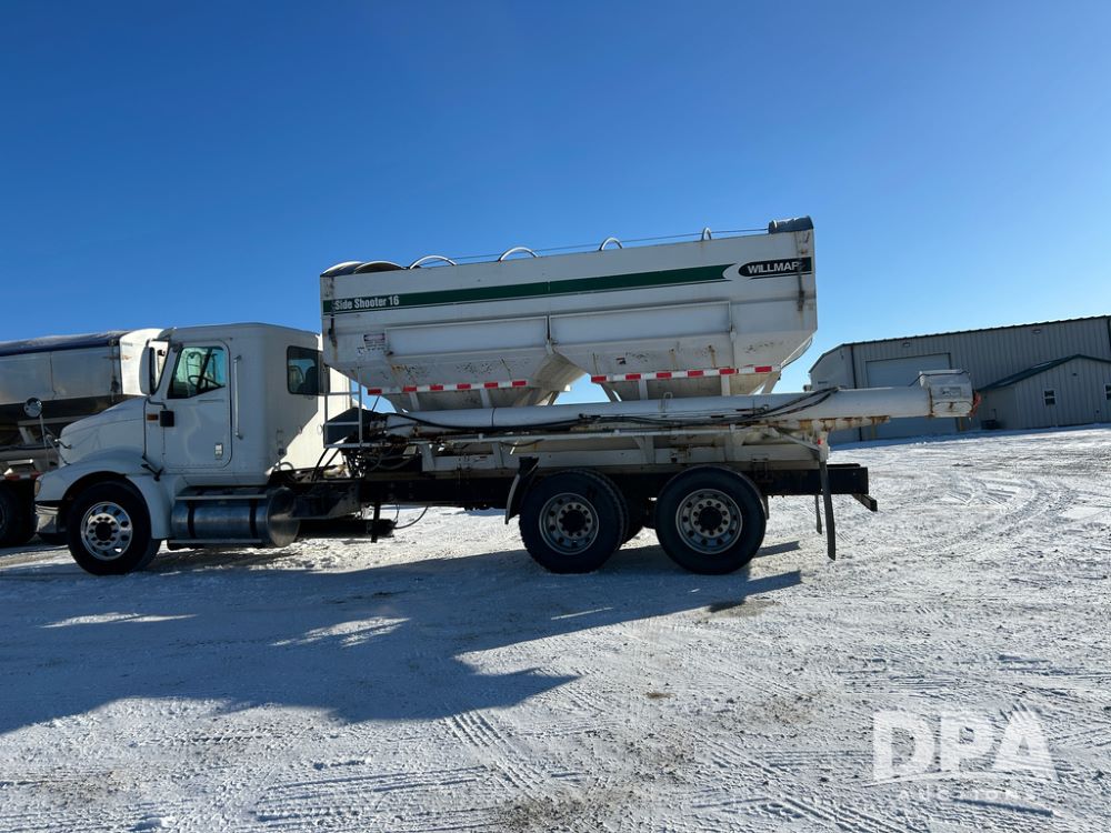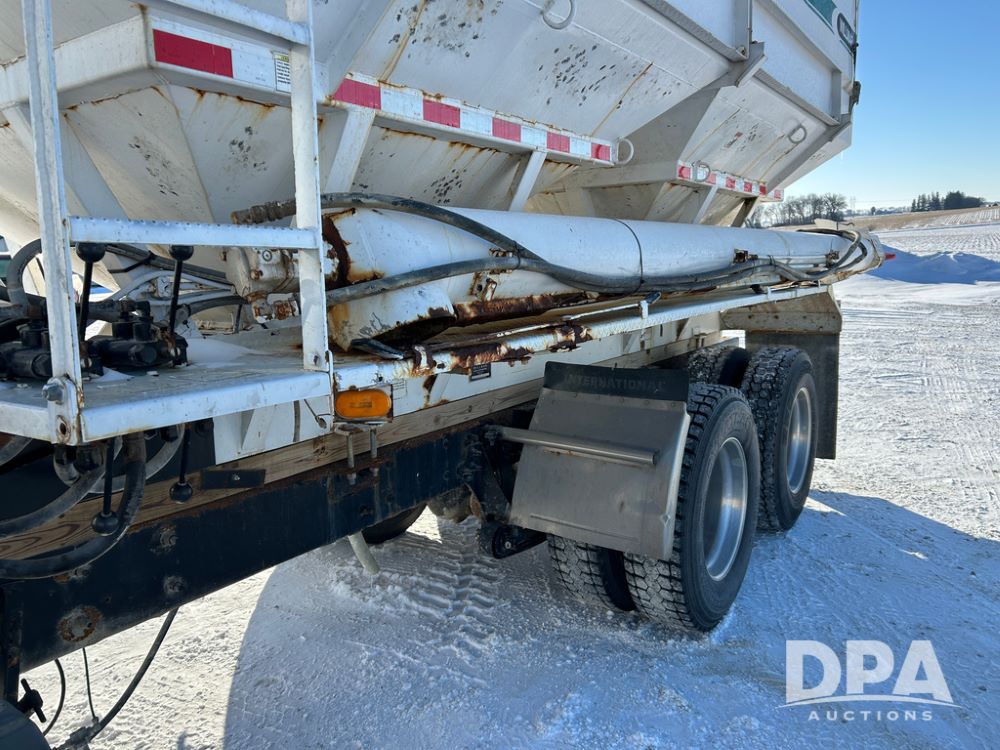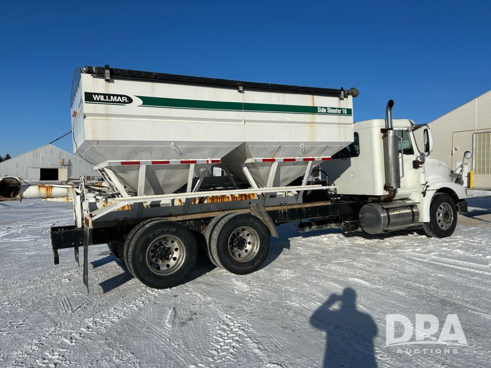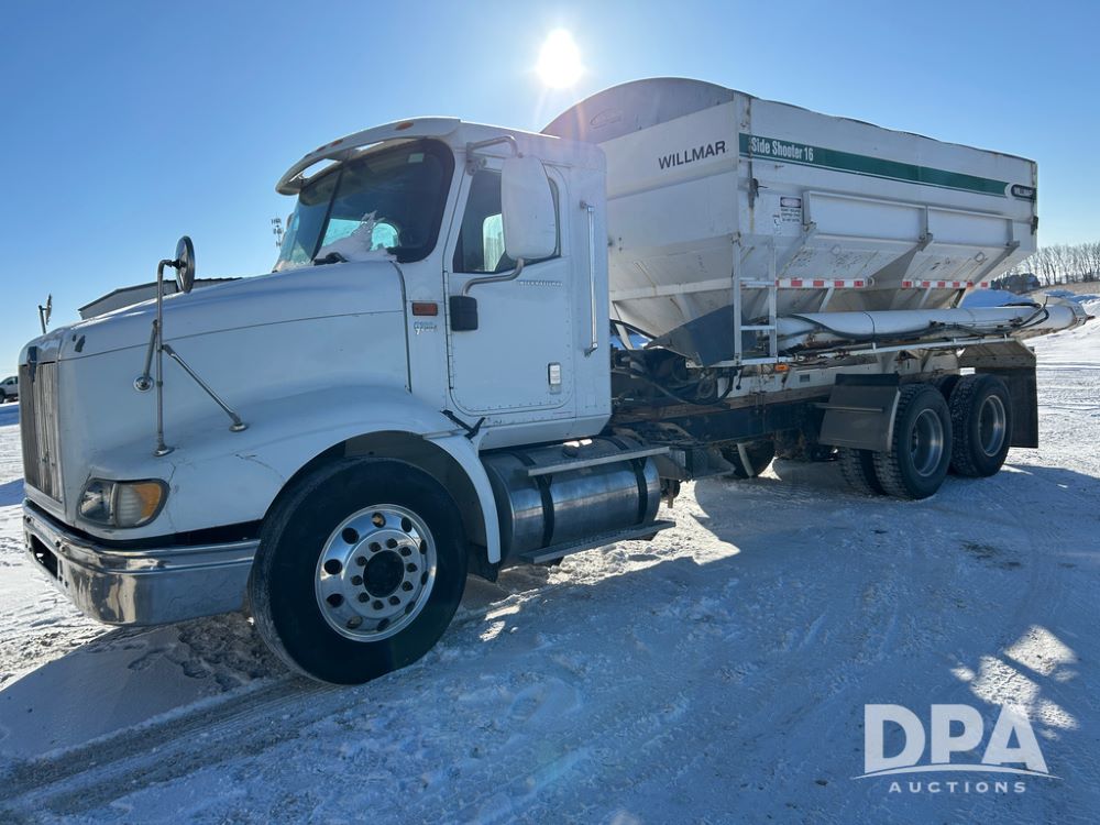 2007 International 9200i Dry Truck (CP1554 Unit 29128), Cummins diesel engine, 10 speed transmission, tandem axle full screw, air ride suspension, Willmar 1600 stainless steel hydraulic dry tender box, side discharge auger, electric roll tarp, engine brake, cruise control, dual polished aluminum fuel tanks, 22.5 tires, aluminum wheels.