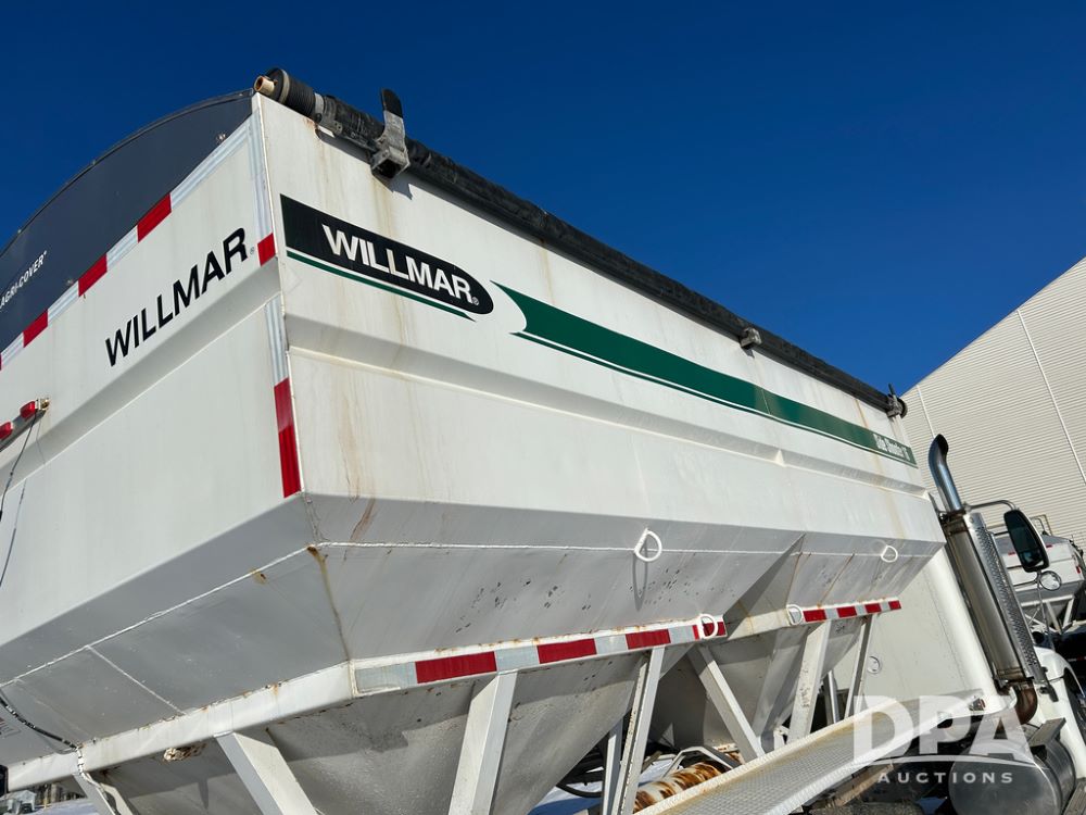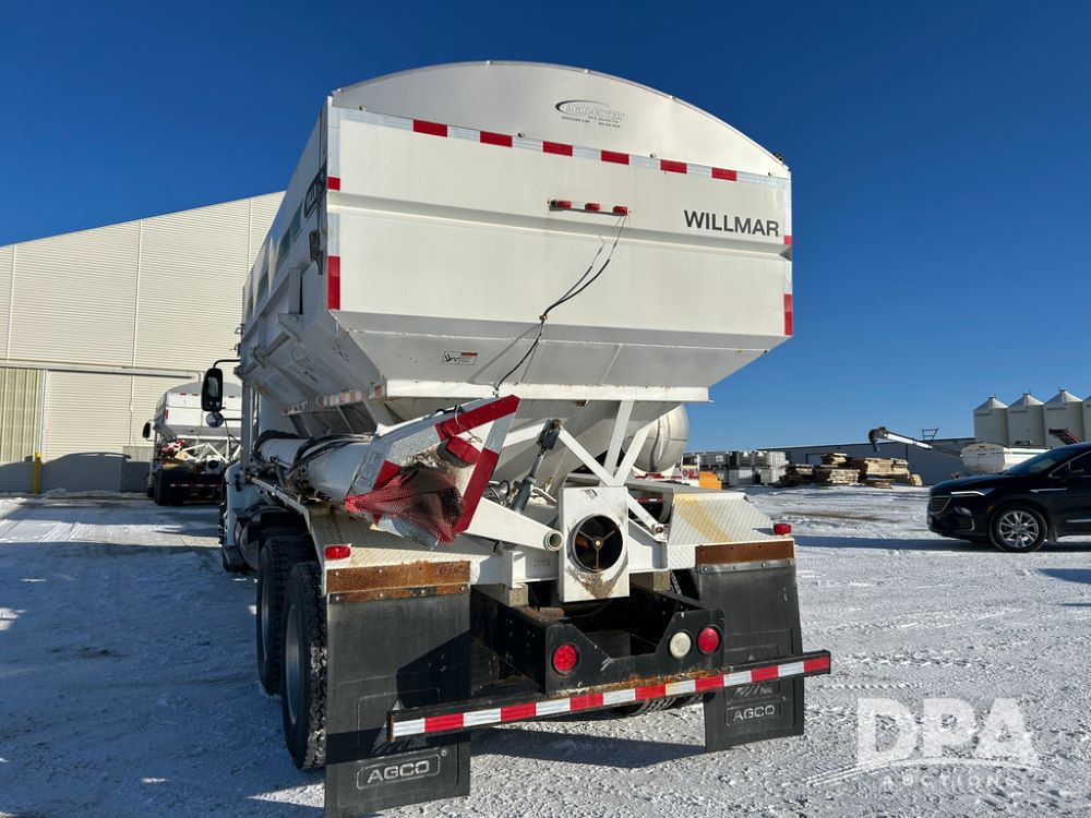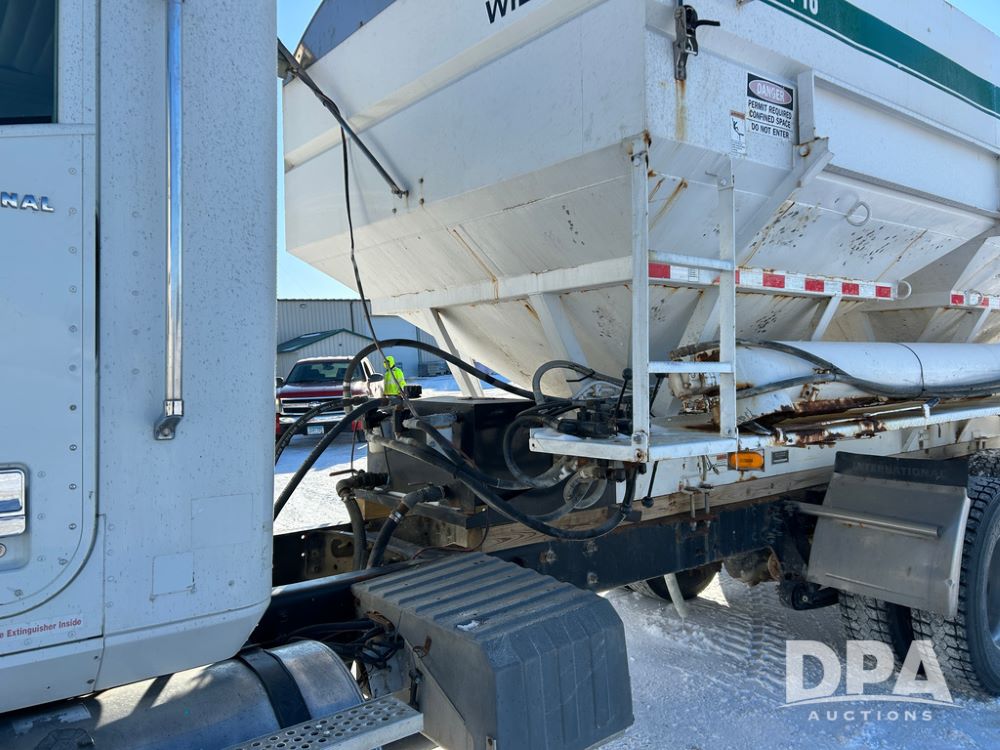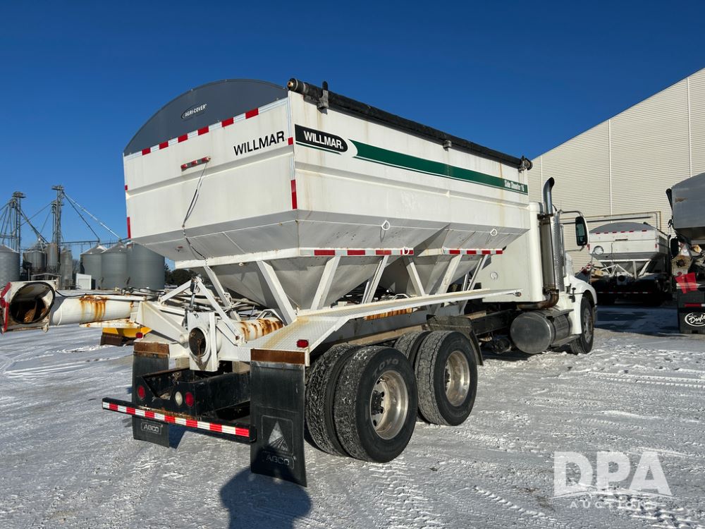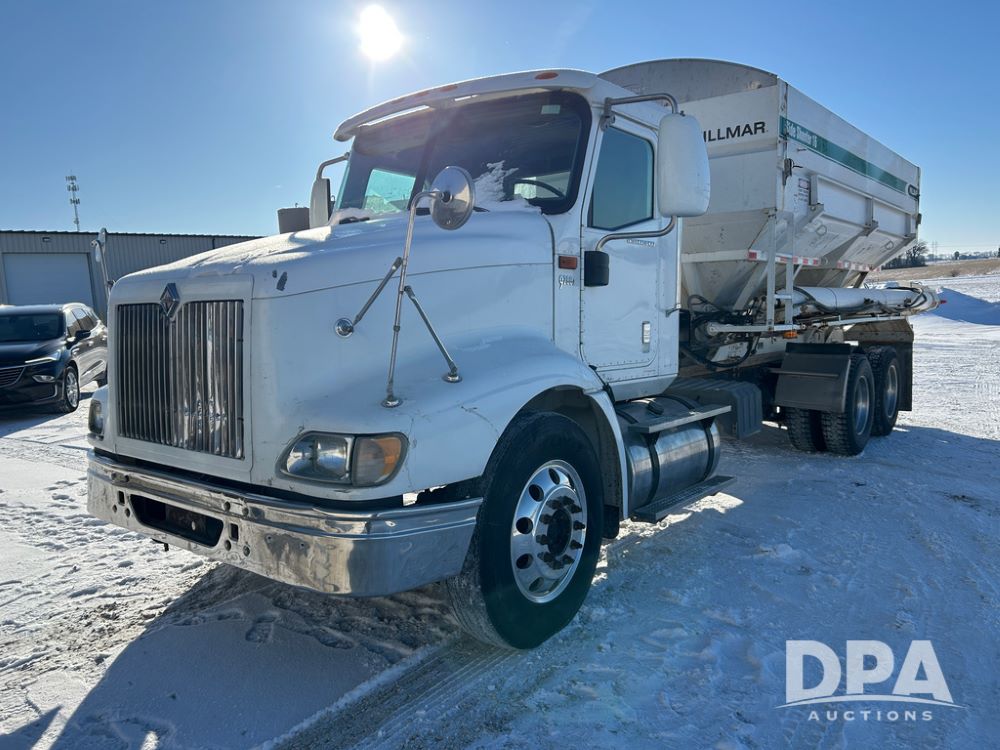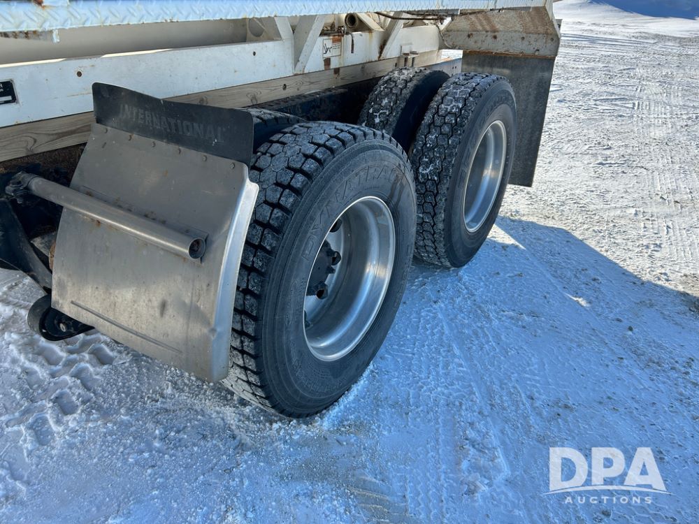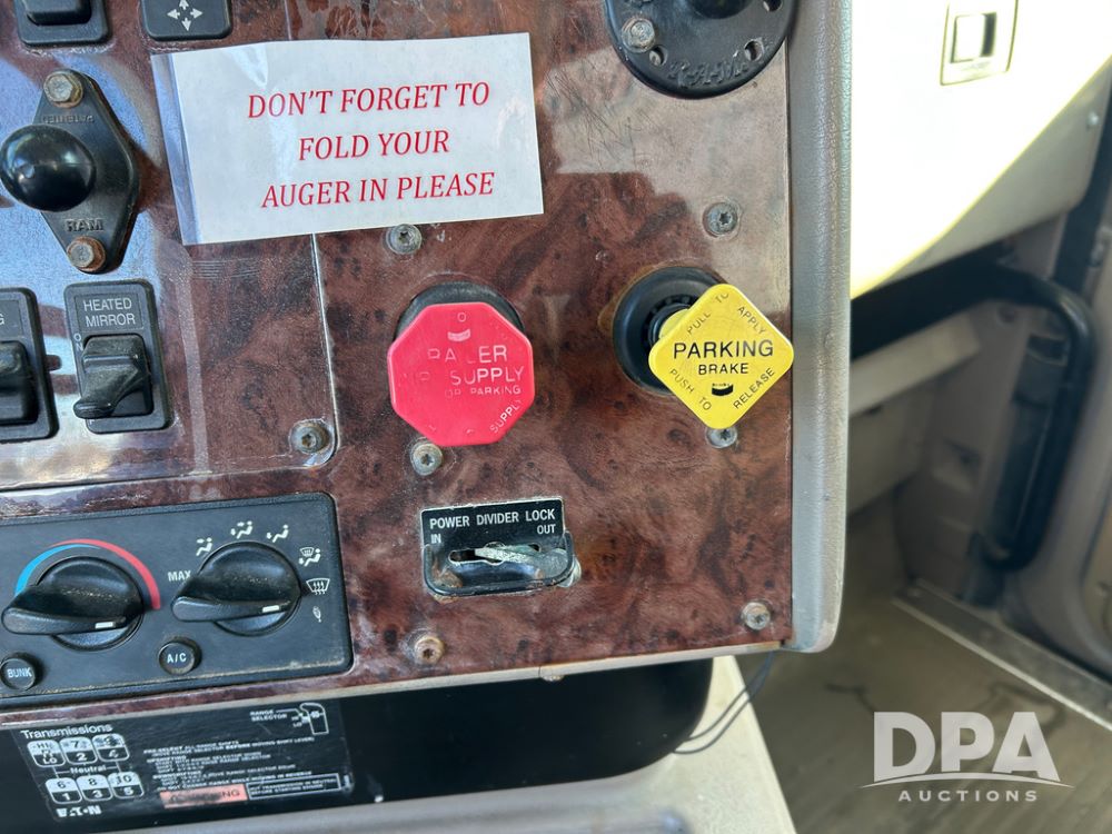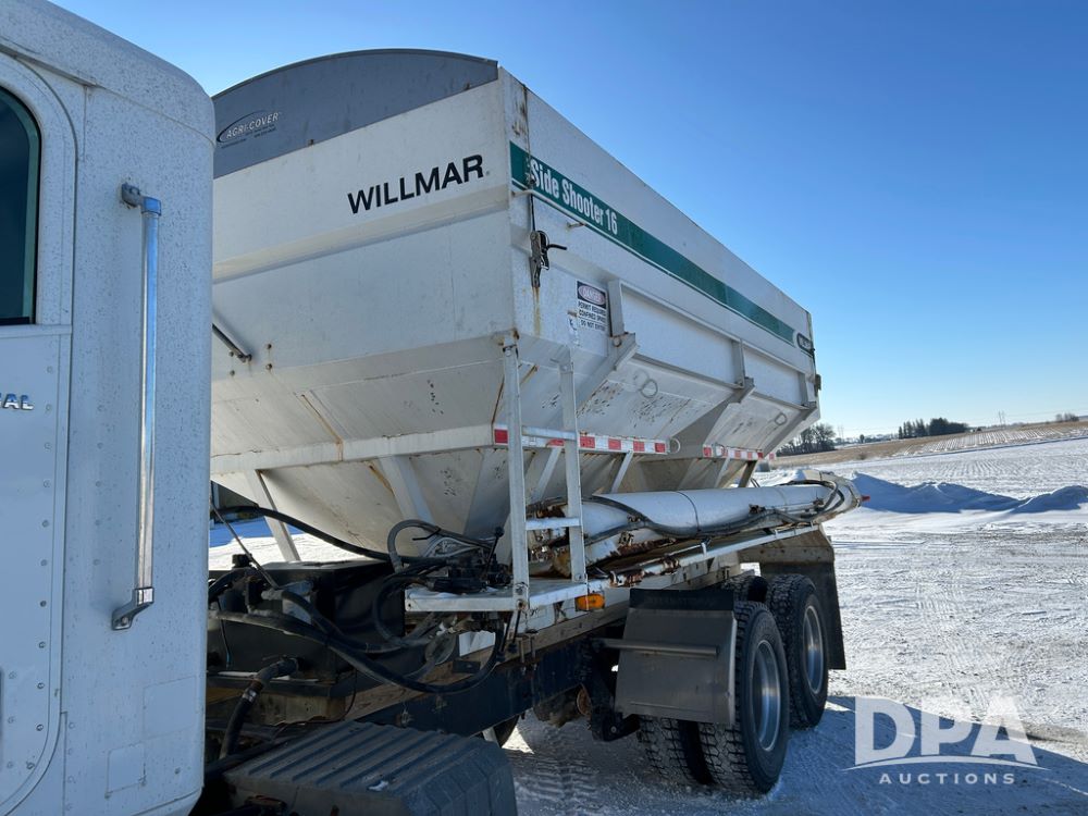2007 International 9200i Dry Truck (CP1554 Unit 29128), Cummins diesel engine, 10 speed transmission, tandem axle full screw, air ride suspension, Willmar 1600 stainless steel hydraulic dry tender box, side discharge auger, electric roll tarp, engine brake, cruise control, dual polished aluminum fuel tanks, 22.5 tires, aluminum wheels.