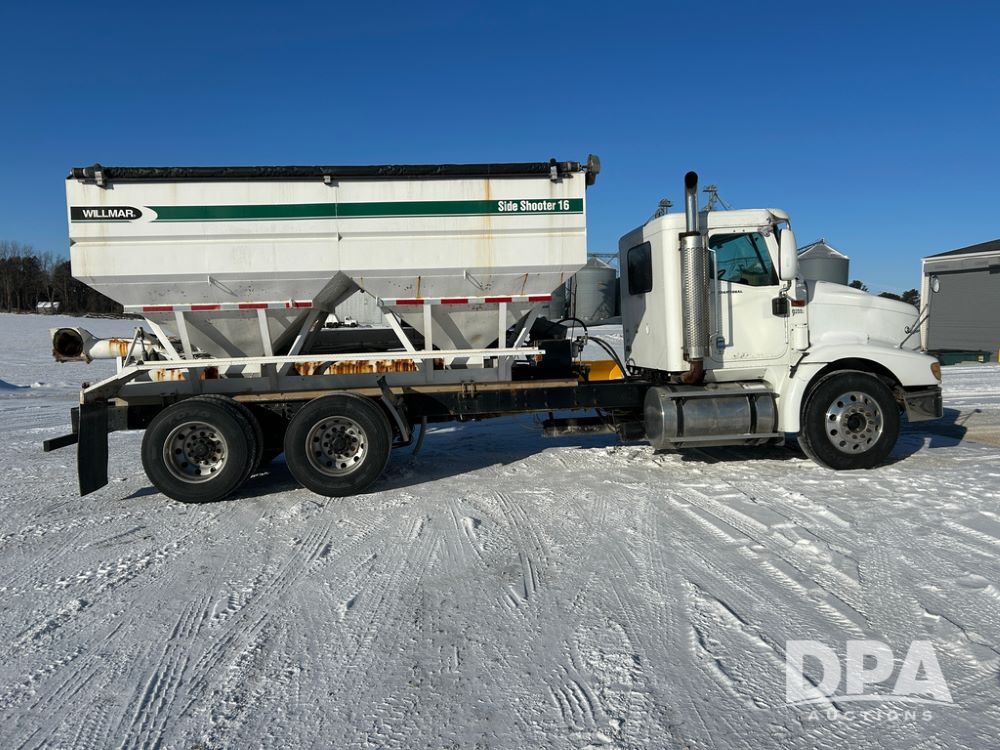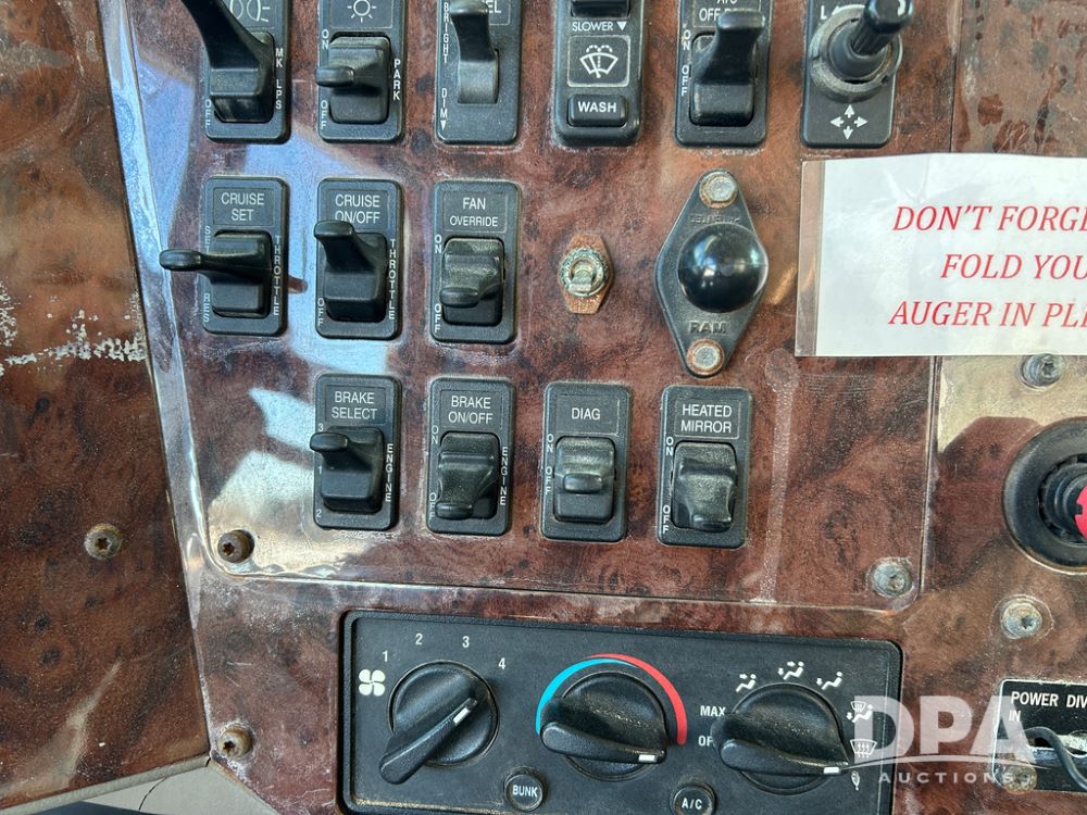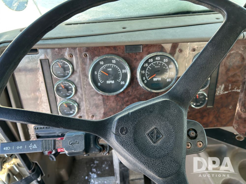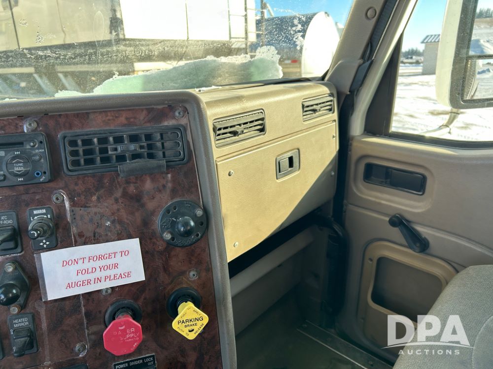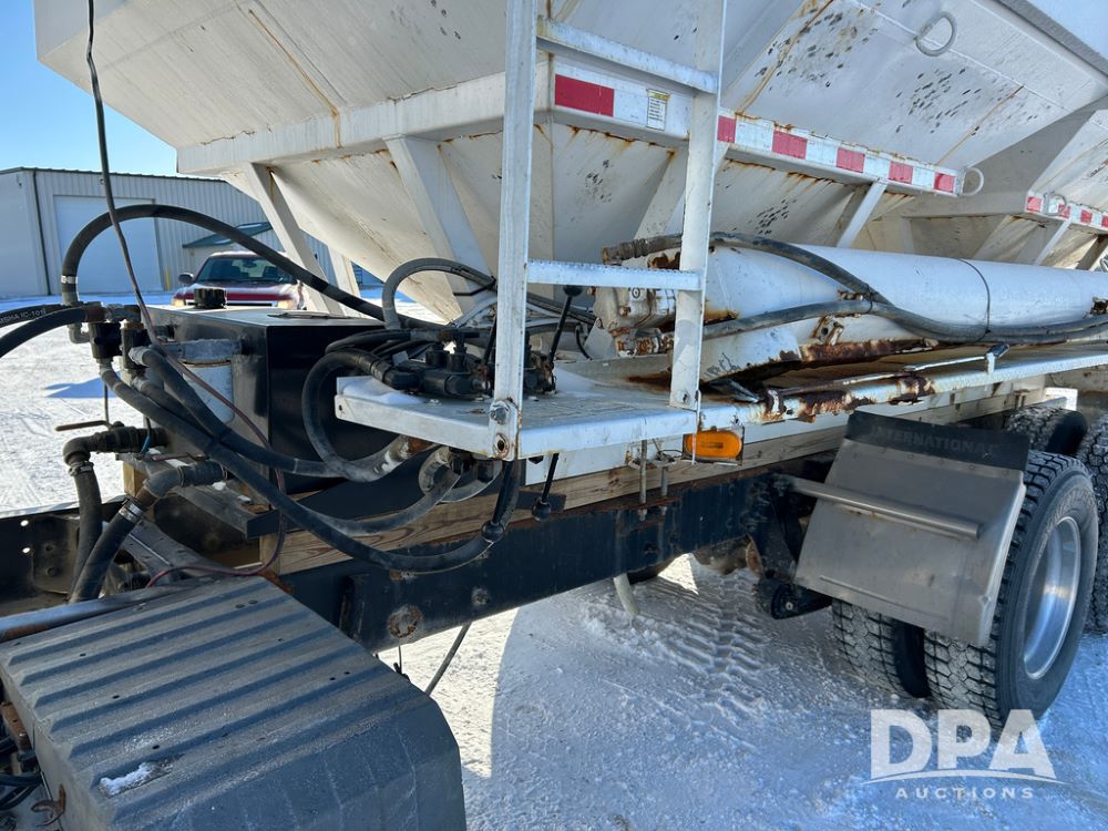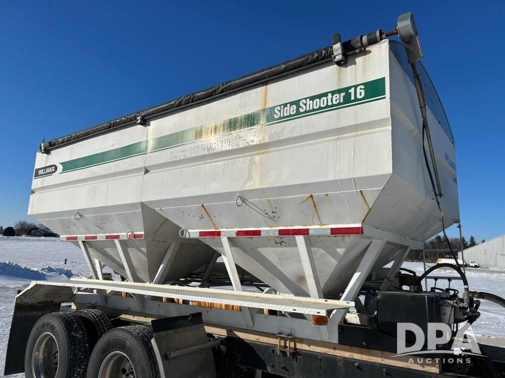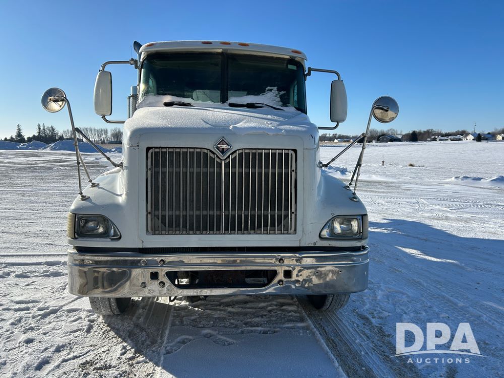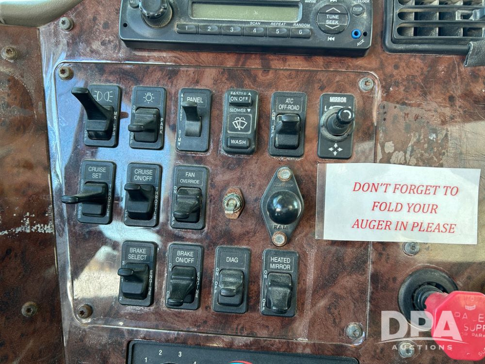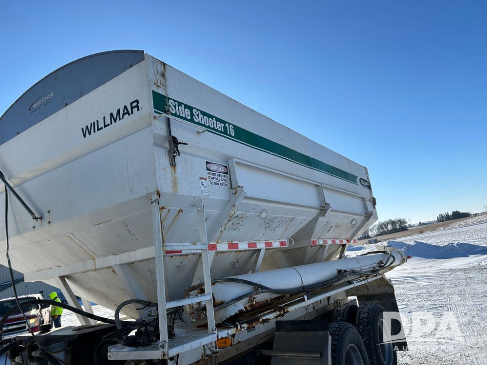 2007 International 9200i Dry Truck (CP1554 Unit 29128), Cummins diesel engine, 10 speed transmission, tandem axle full screw, air ride suspension, Willmar 1600 stainless steel hydraulic dry tender box, side discharge auger, electric roll tarp, engine brake, cruise control, dual polished aluminum fuel tanks, 22.5 tires, aluminum wheels.