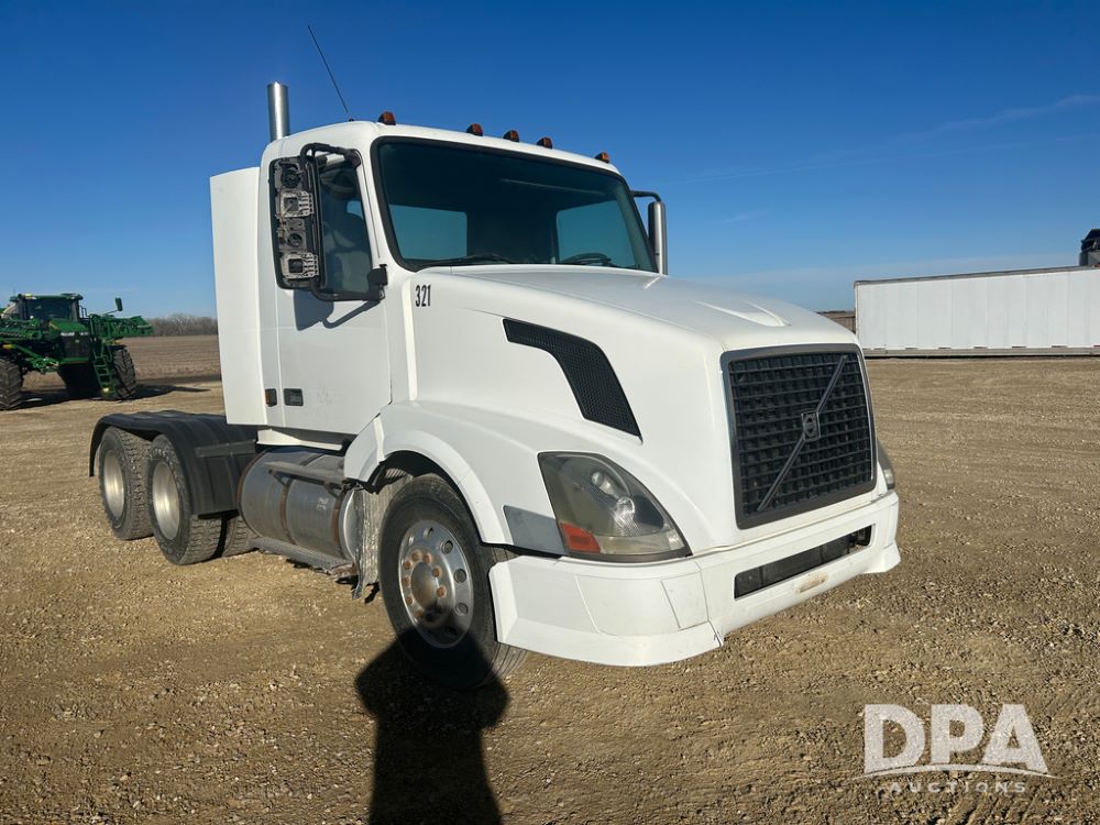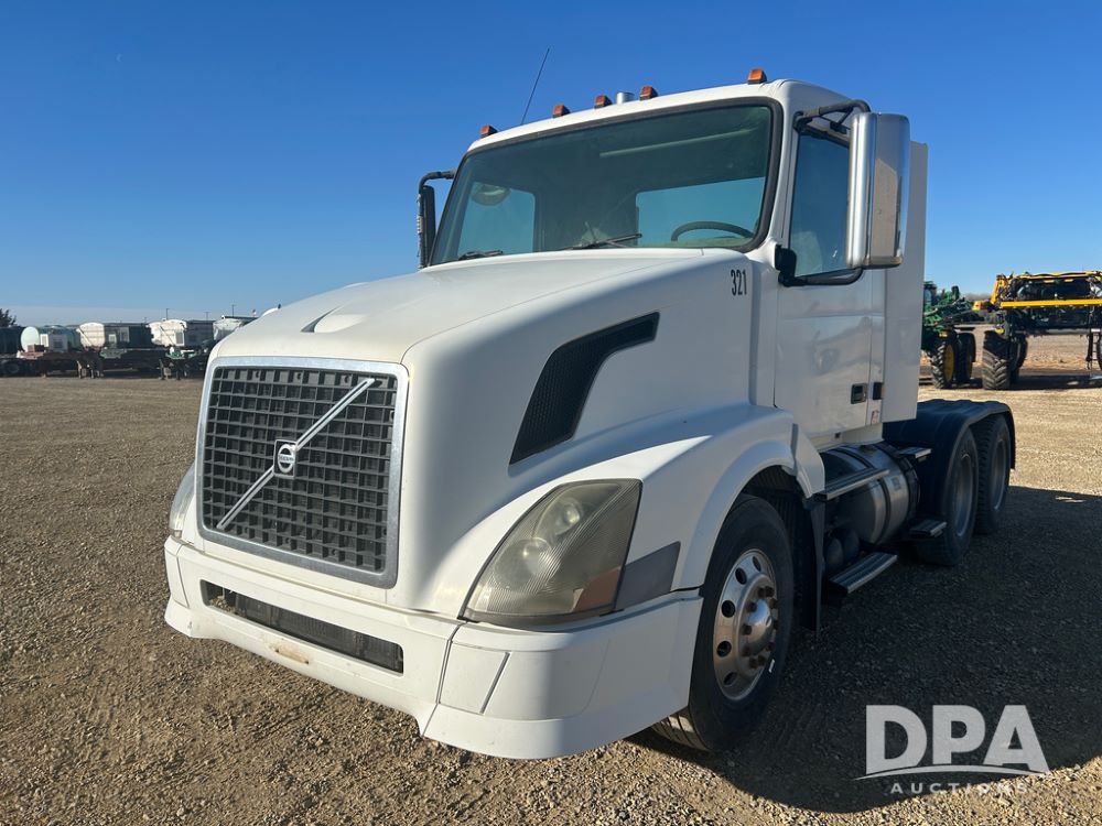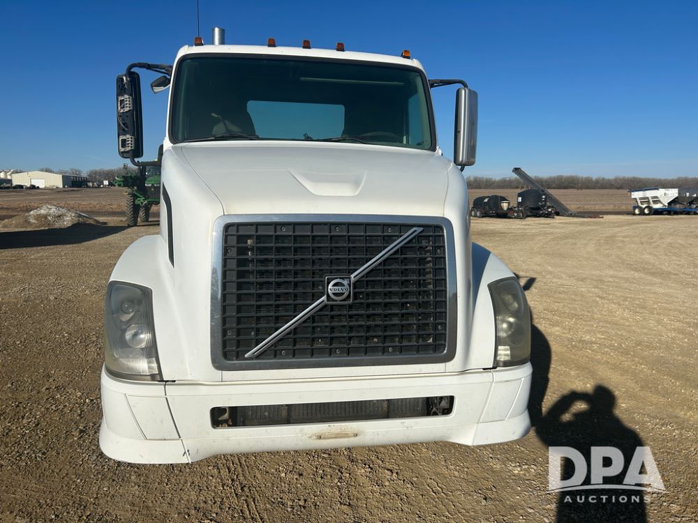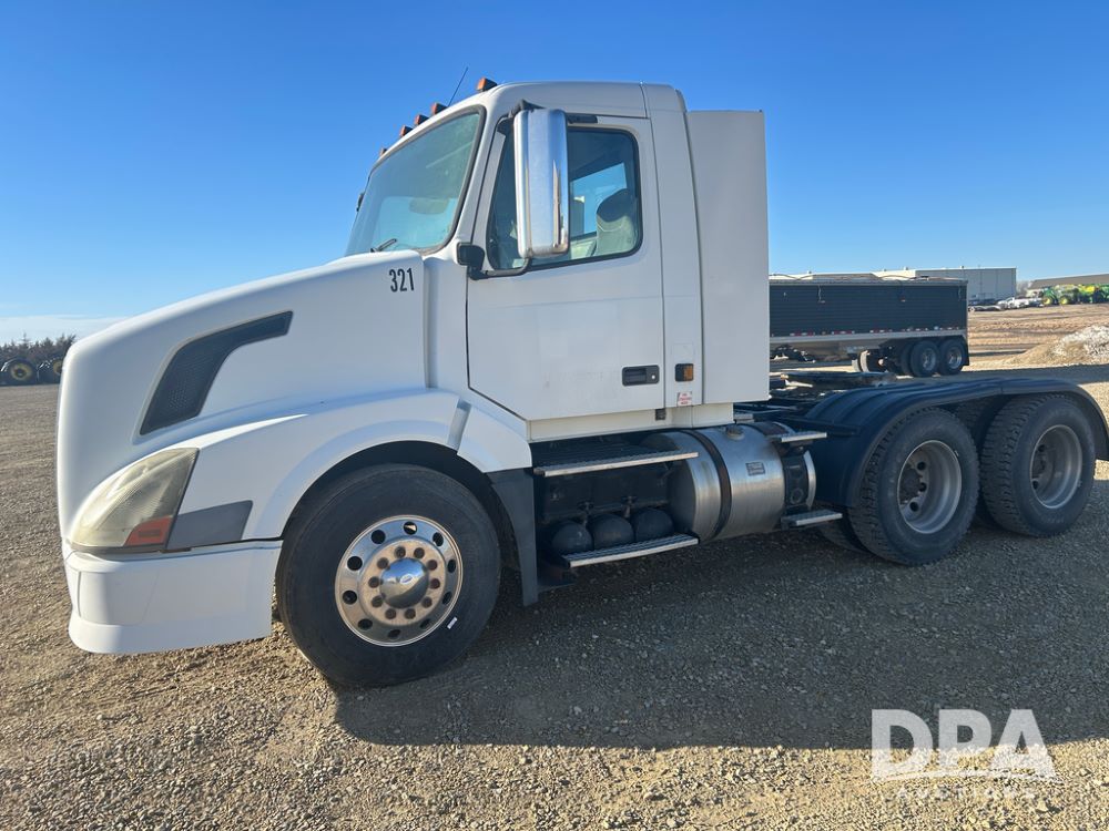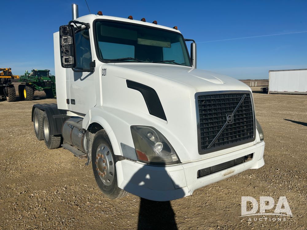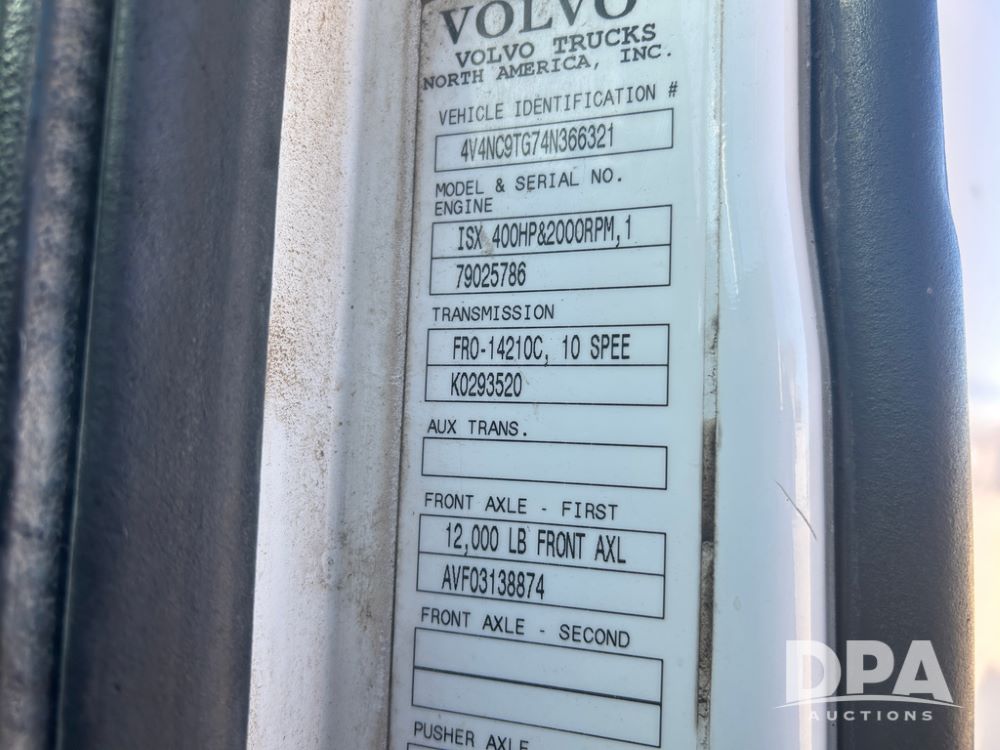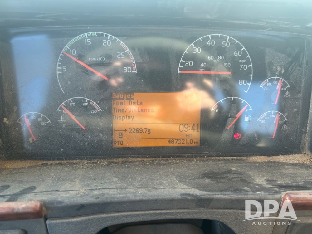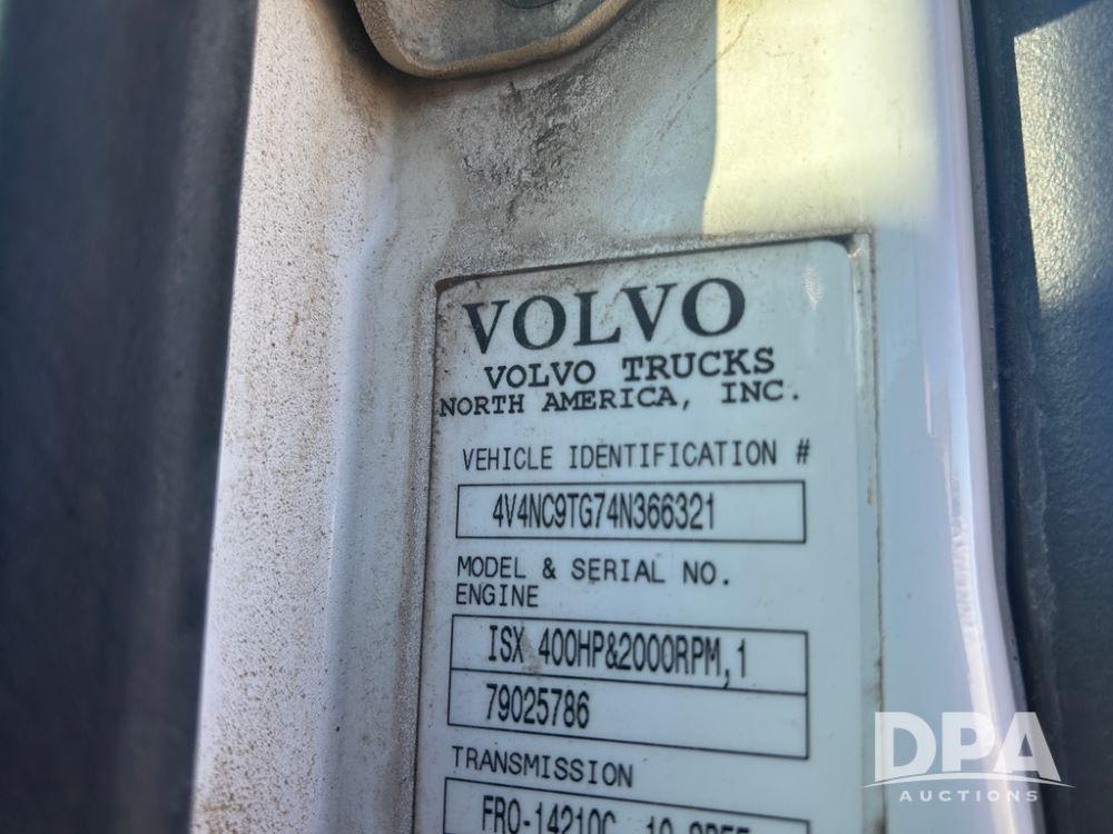2004 Volvo Truck (CP1600 Unit 321), ISX diesel engine, 10 speed transmission, tandem axle full screw, 168'' WB, air ride suspension, air slide 5th wheel plate, Minimizer full fenders, dual aluminum fuel tanks, engine brake, air dump valve, cab heat/air conditioning, 22.5 tires, aluminum wheels, odometer reads 487,321 miles.