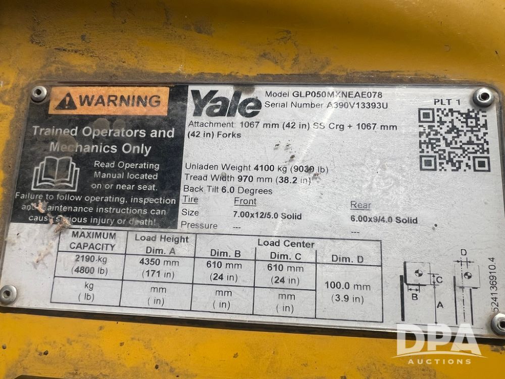 2020 Yale 50MX Forklift (PZ14422, Unit 117350), LP gas engine, shuttle shift transmission, canopy, lights, forks, 7.00 x 12/5.0 front tires, 6.00 x 9/4.0 rear tires, shows 909 hours.